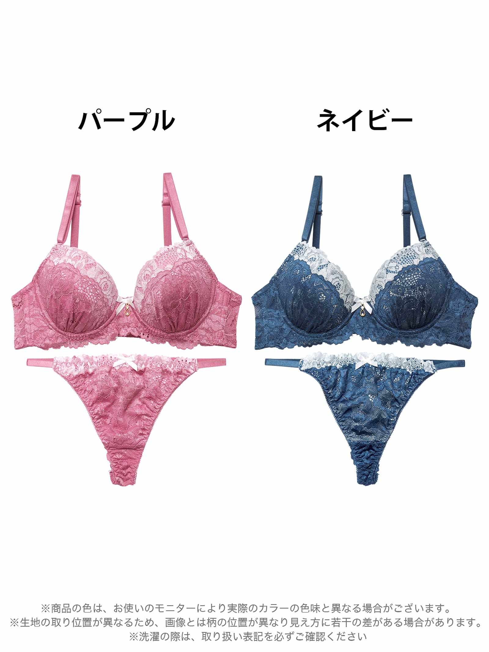 エレガントな2色のレースを組み合わせた深みのある大人っぽいカラーのランジェリー。胸元にはリボンとゴールドチャームがあしらわれ華やかさ&可愛らしさも◎ショーツは腰元を華奢見せするサイドストリング&バック透けレース仕様でセクシーに仕上げました◎