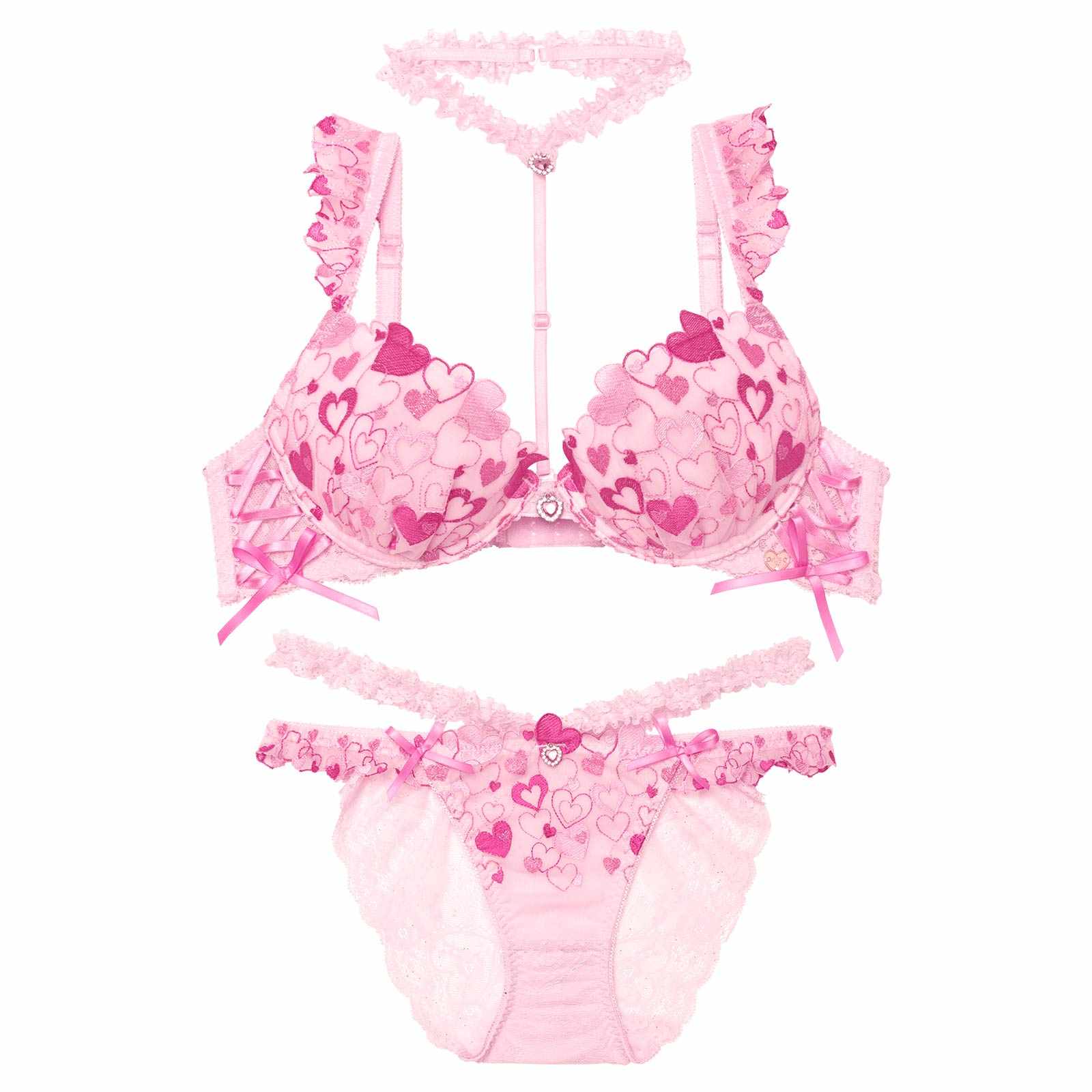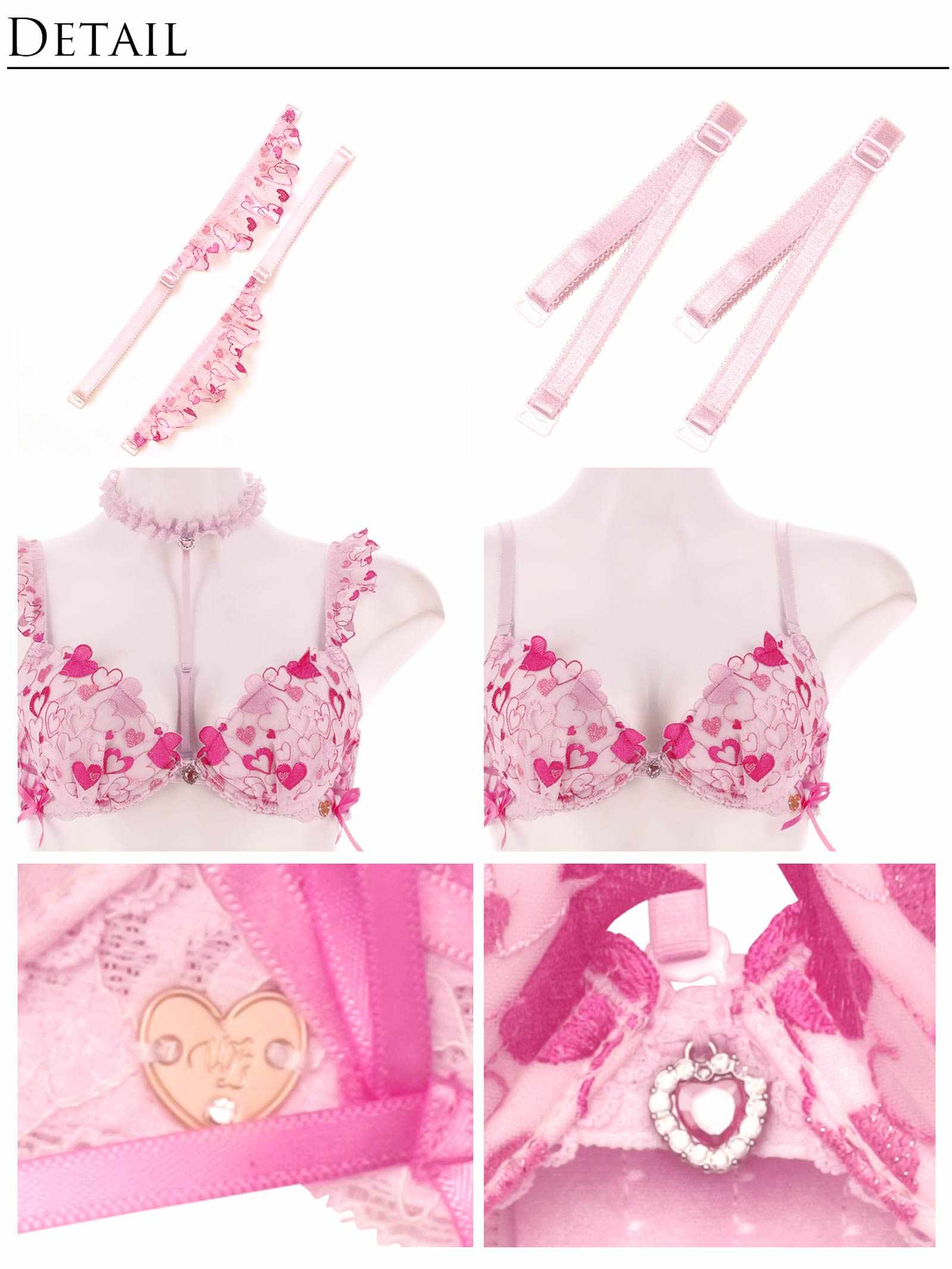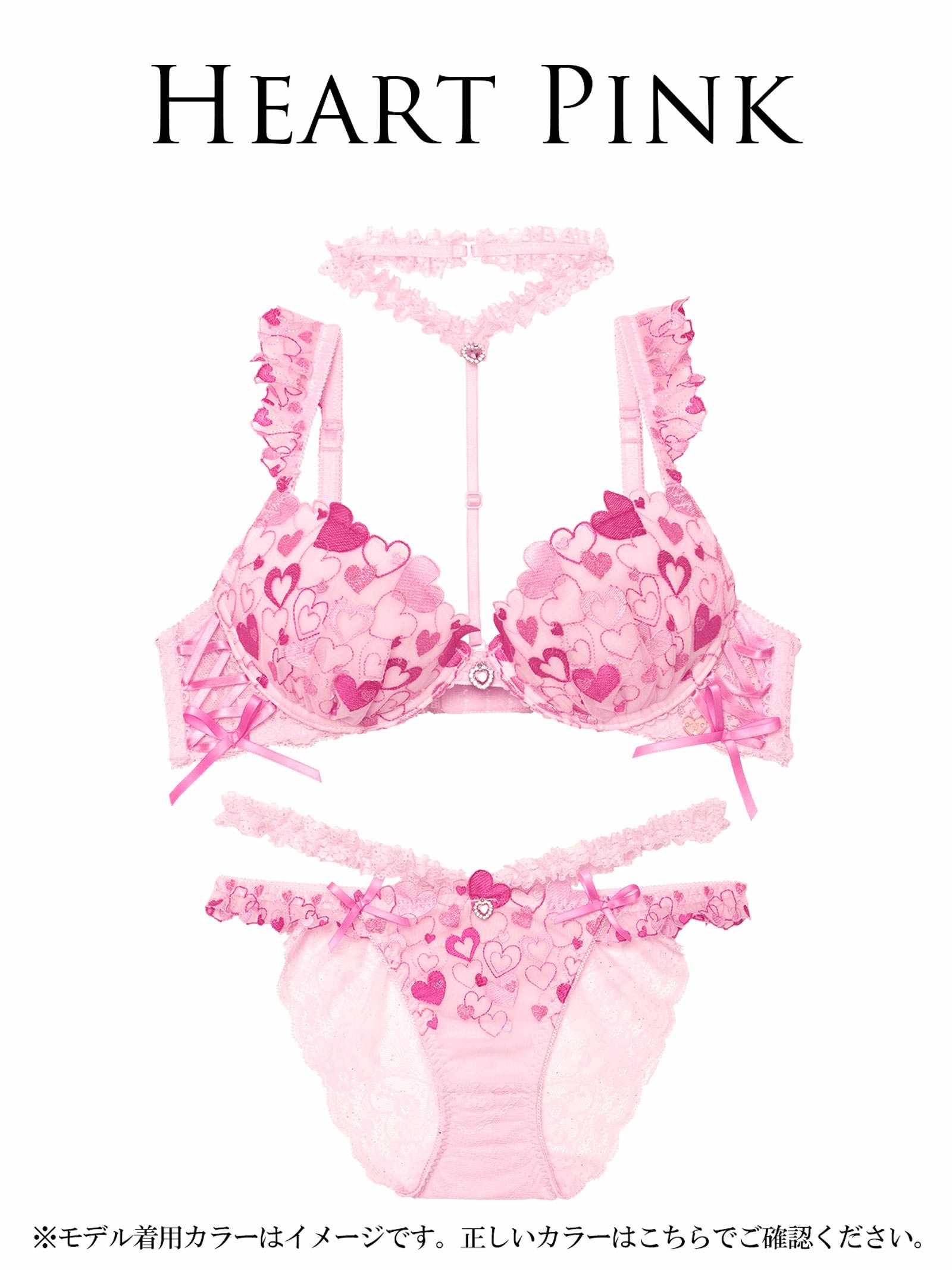 ラブリーなハートランジェリーの登場です♪色んな色のハートを詰め込んだ刺繍レースに編み上げデザインをプラス。肩にも小さいハート刺繍のフリルをたっぷりと…