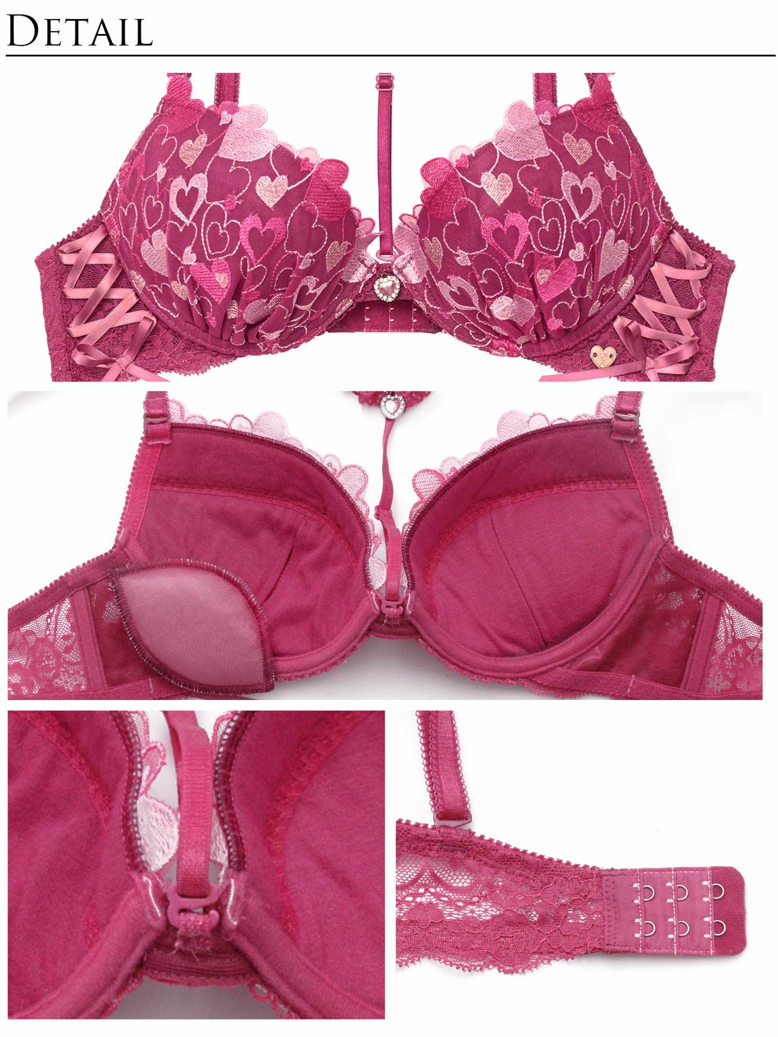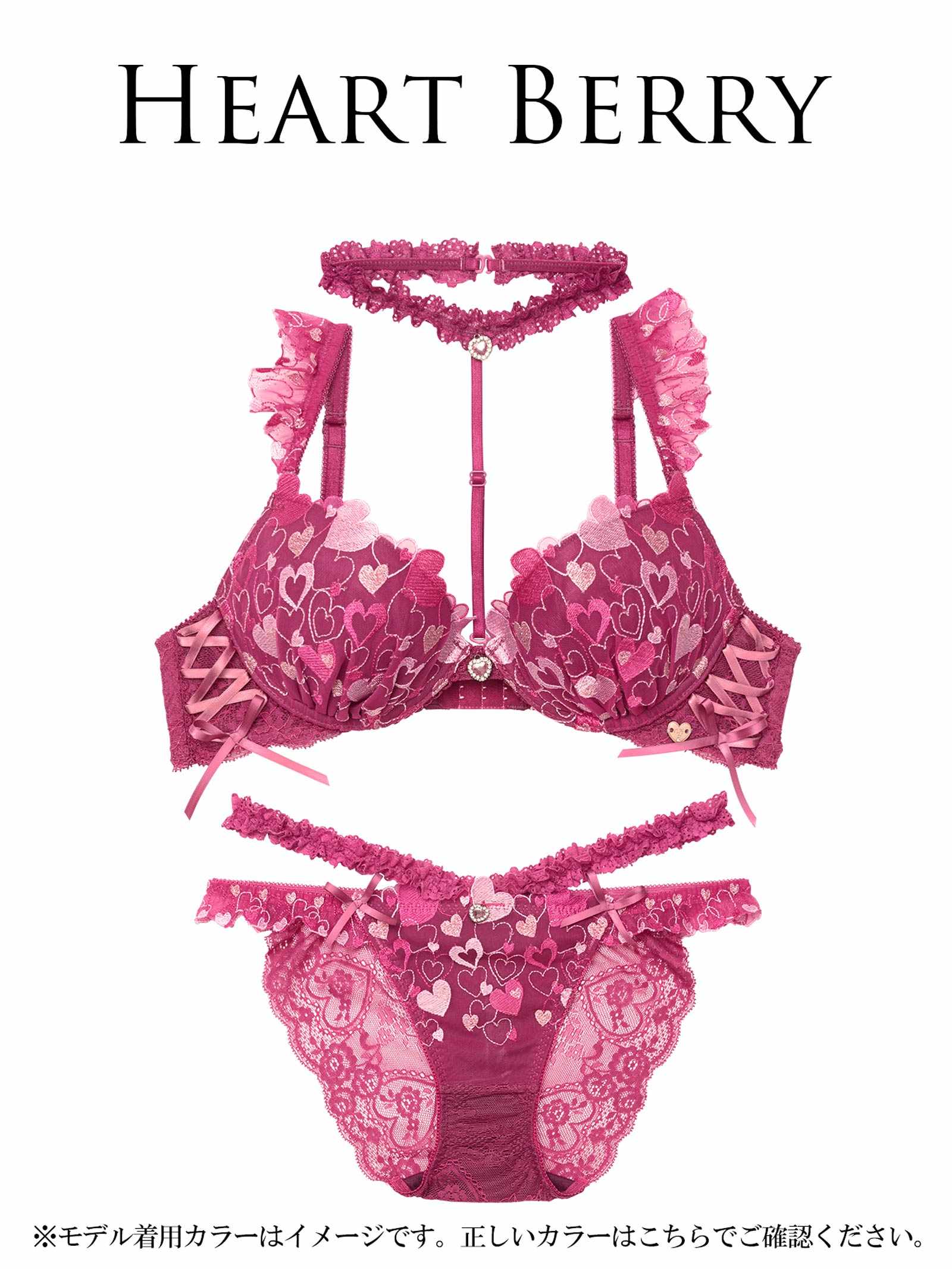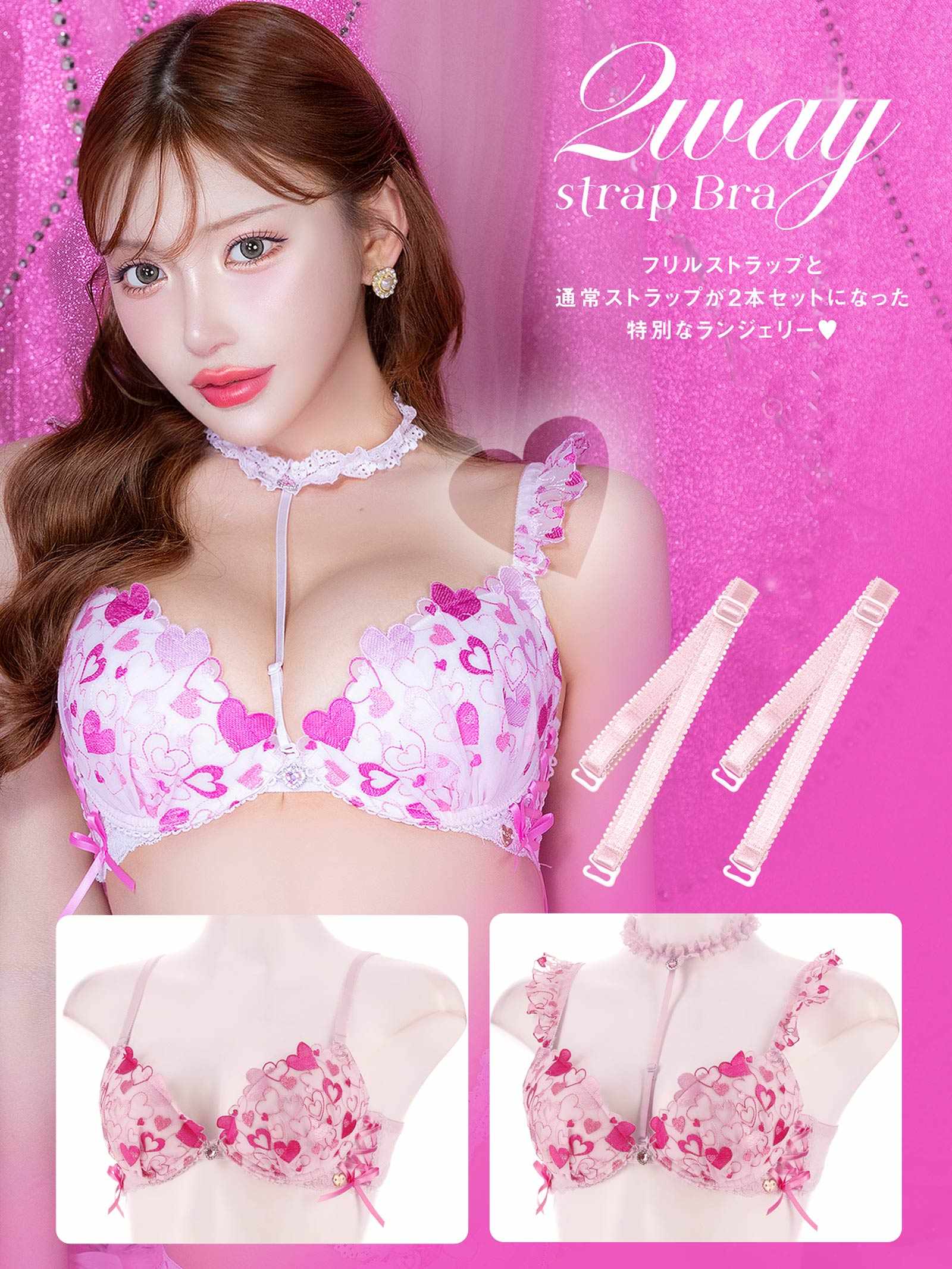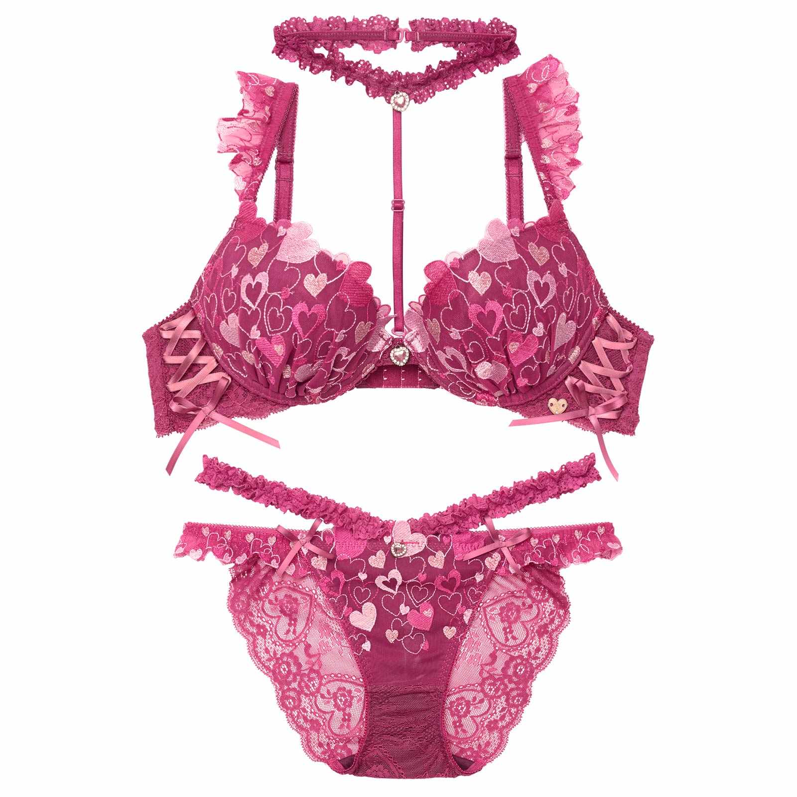 ラブリーなハートランジェリーの登場です♪色んな色のハートを詰め込んだ刺繍レースに編み上げデザインをプラス。肩にも小さいハート刺繍のフリルをたっぷりと…