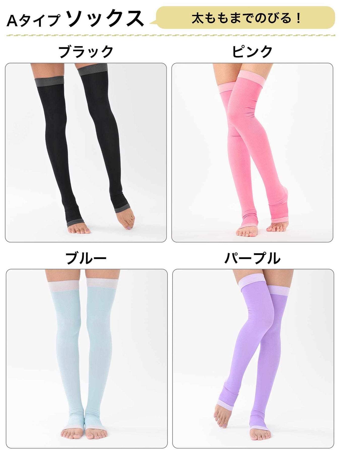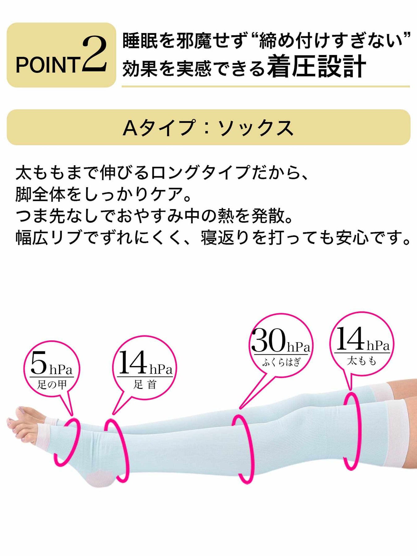 【Aタイプ】はオーバーニータイプで足首、ふくらはぎ、太ももの3段階のキツすぎない着圧でキュッキュッと引き締め、ひざ周り、足首、履き口周りはリブ編みでしっかりフィット。