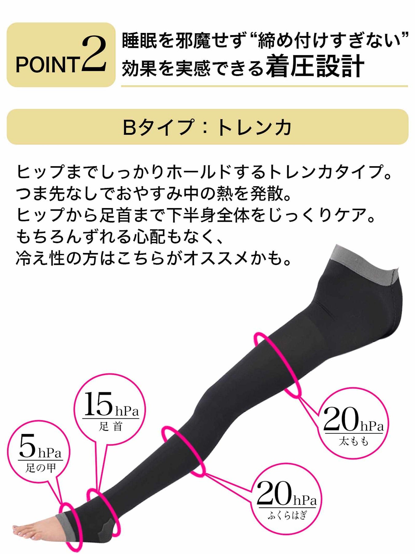 【Bタイプ】はレギンスタイプで足首、ふくらはぎ、太ももの3段階着圧がヒップ周り、股下はリブ編みでやぶれにくく仕上げました。ヒップまでしっかりホールドしたい方や冷え性さんは【Bタイプ】がおすすめです。