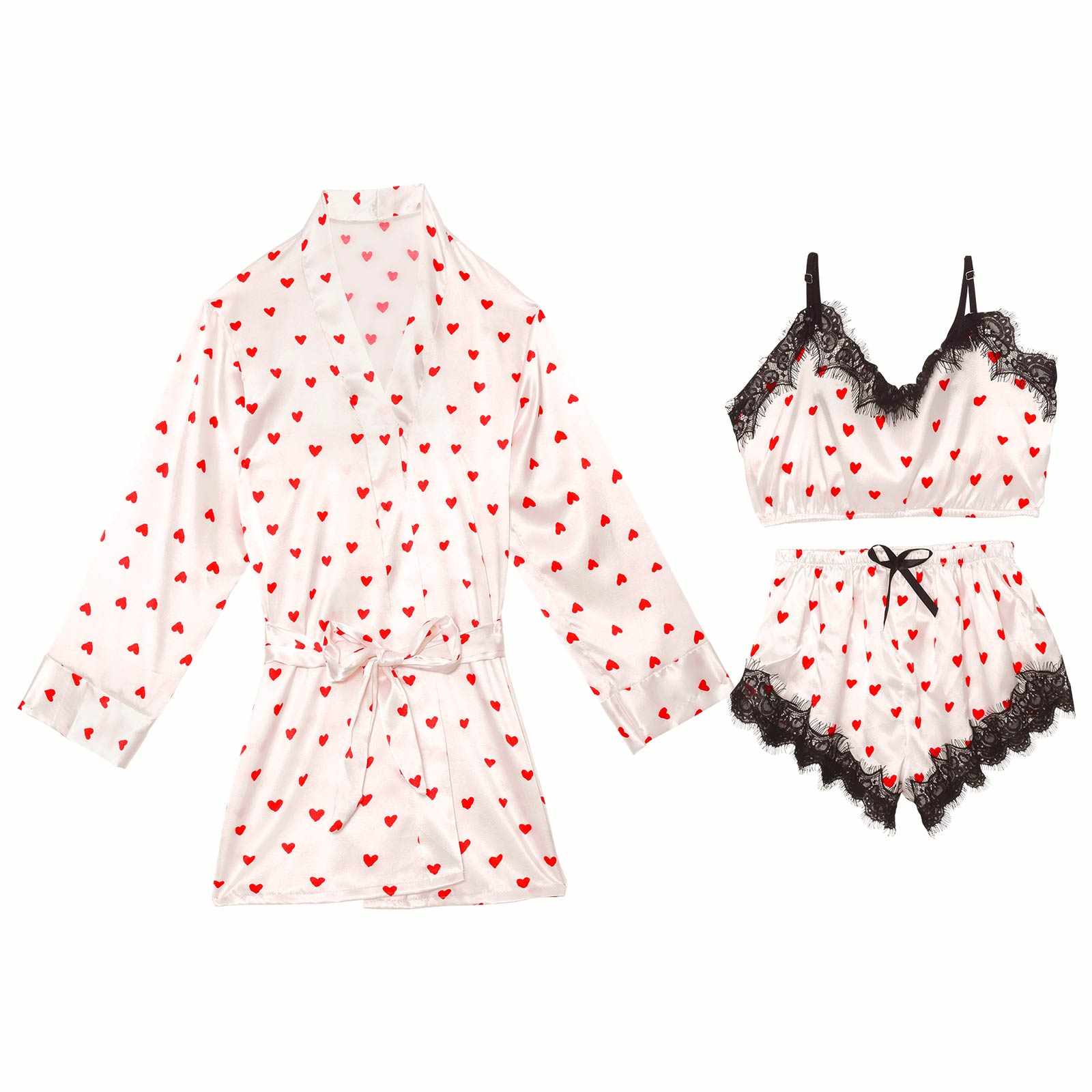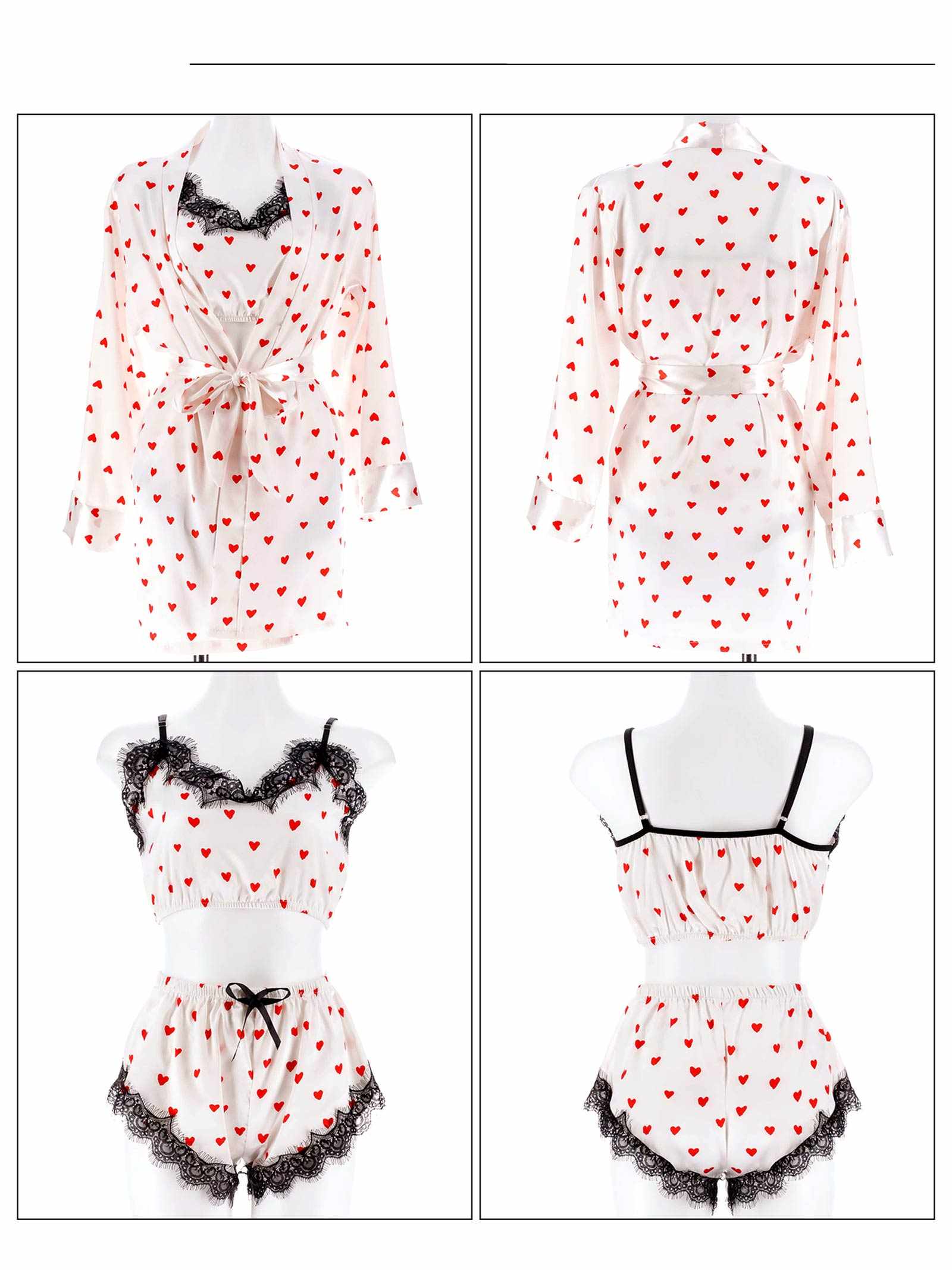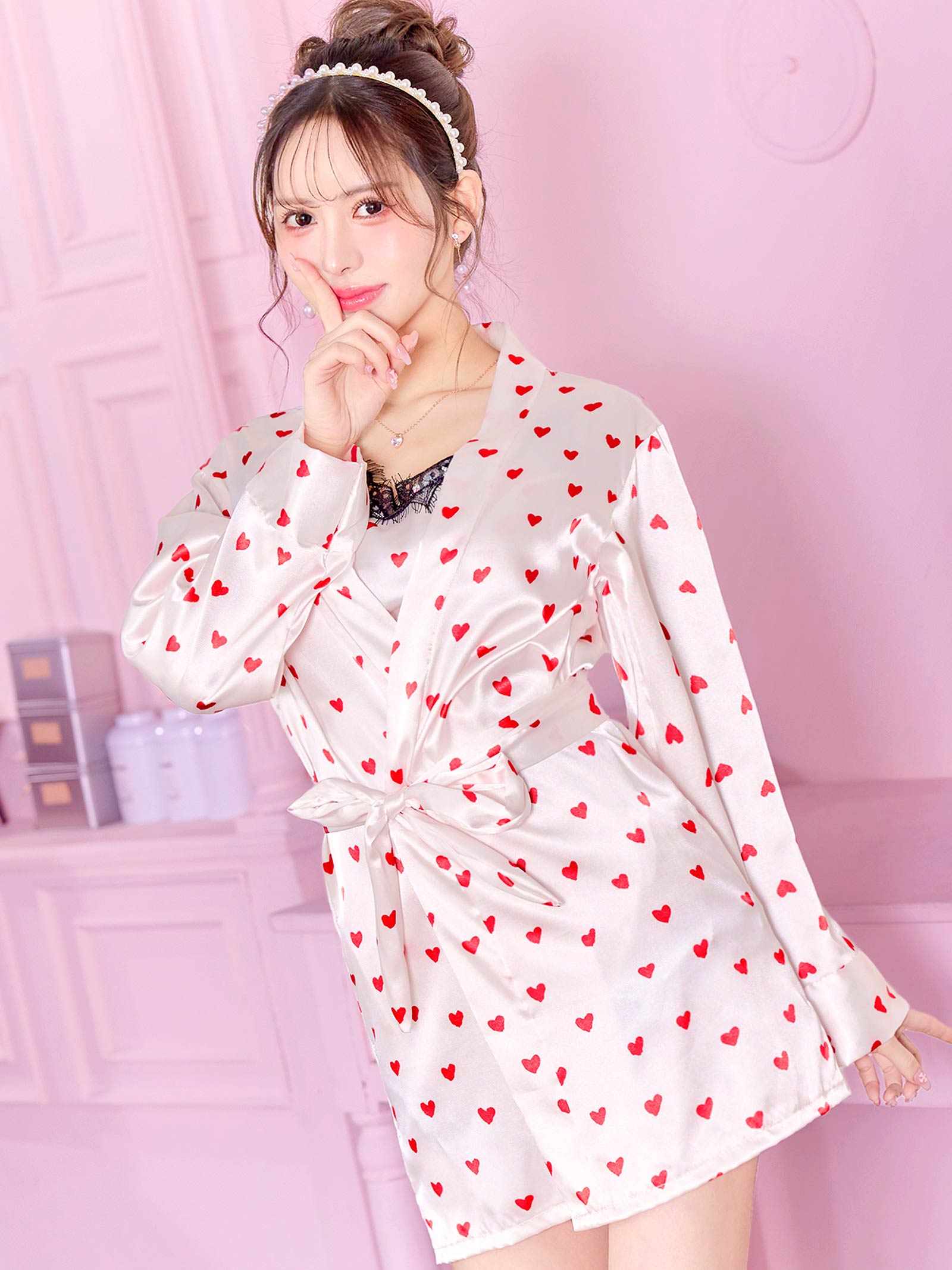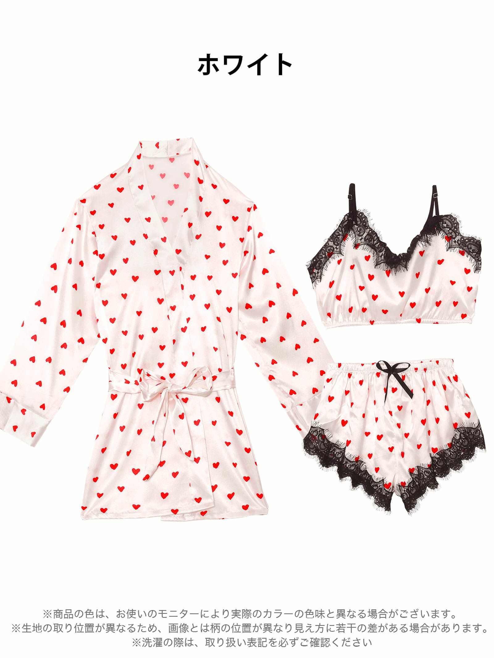 光沢感のあるサテン生地に小さなハート柄とレース素材をたっぷりあしらった可愛らしいルームウェア。ガウン、タップパンツ、キャミソールが付いたお得な3点セットです◎ サラッとした軽い着心地でお家でのリラックスタイムに大活躍な1着です。
