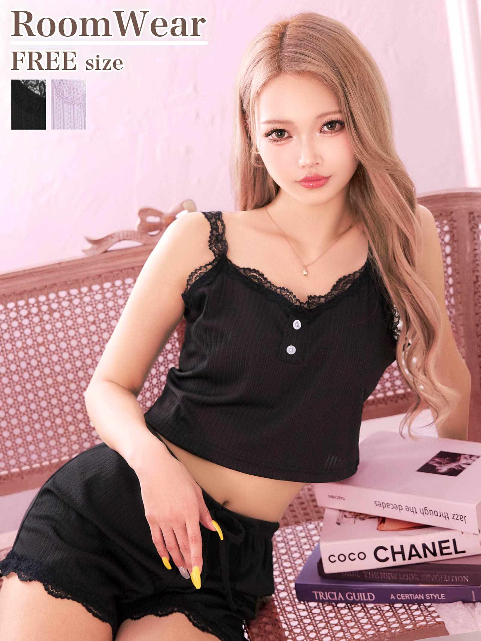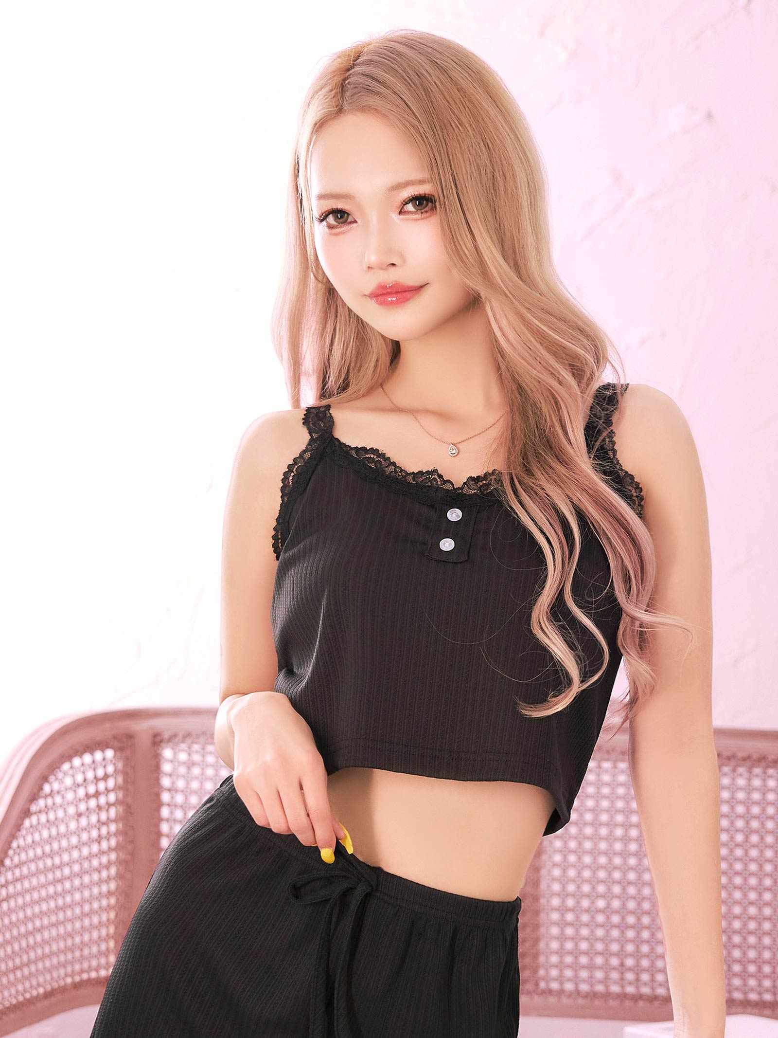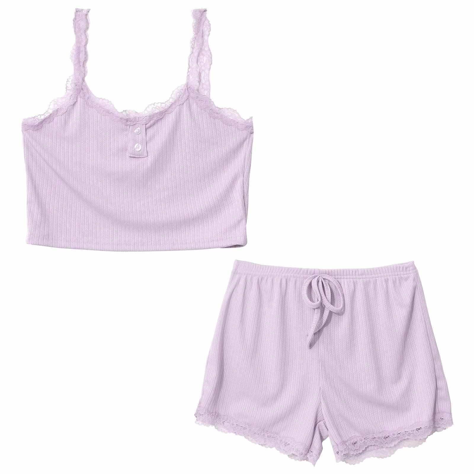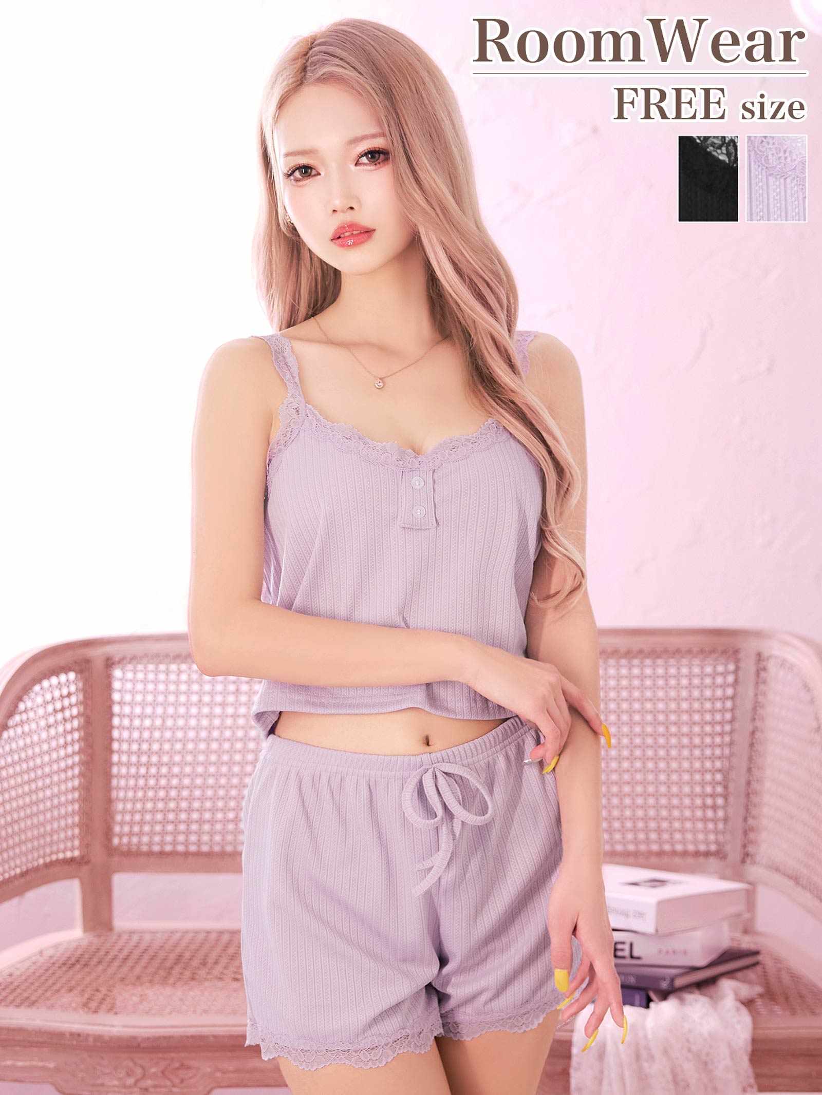 フロントボタンレースキャミ&ショートパンツルームウェア