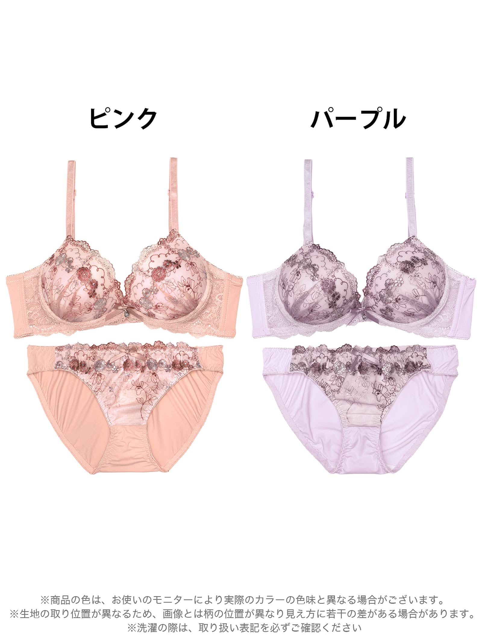 くすみカラーのお花やアーチ刺繍を施したフェミニンなデザインのランジェリー。可愛らしいリボンと高級感をアップさせるドロップビジューのチャームもポイント♪バストをサイドからしっかりと寄せる脇高設計なので美胸&谷間をキープしてくれます◎