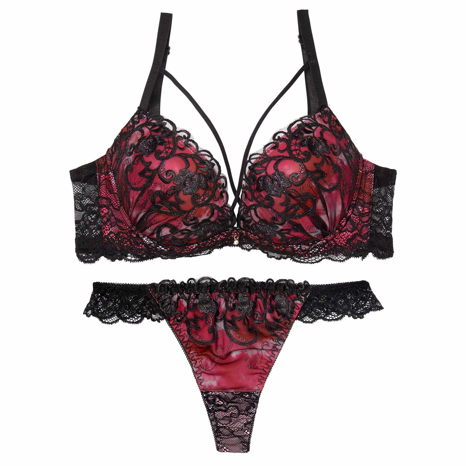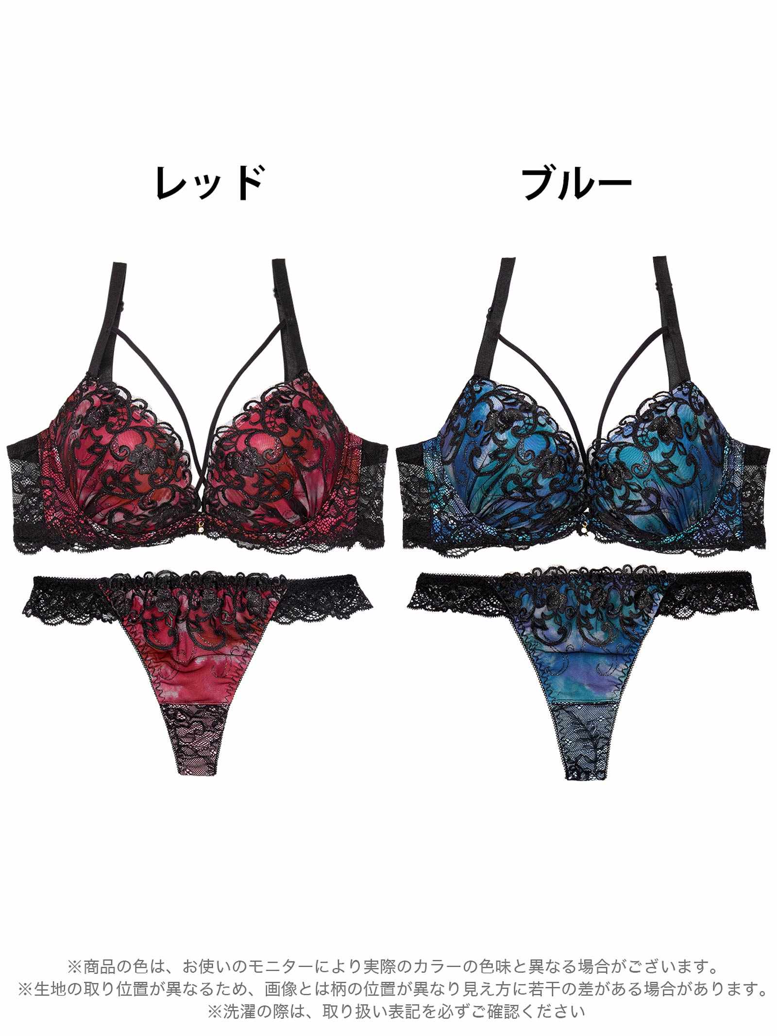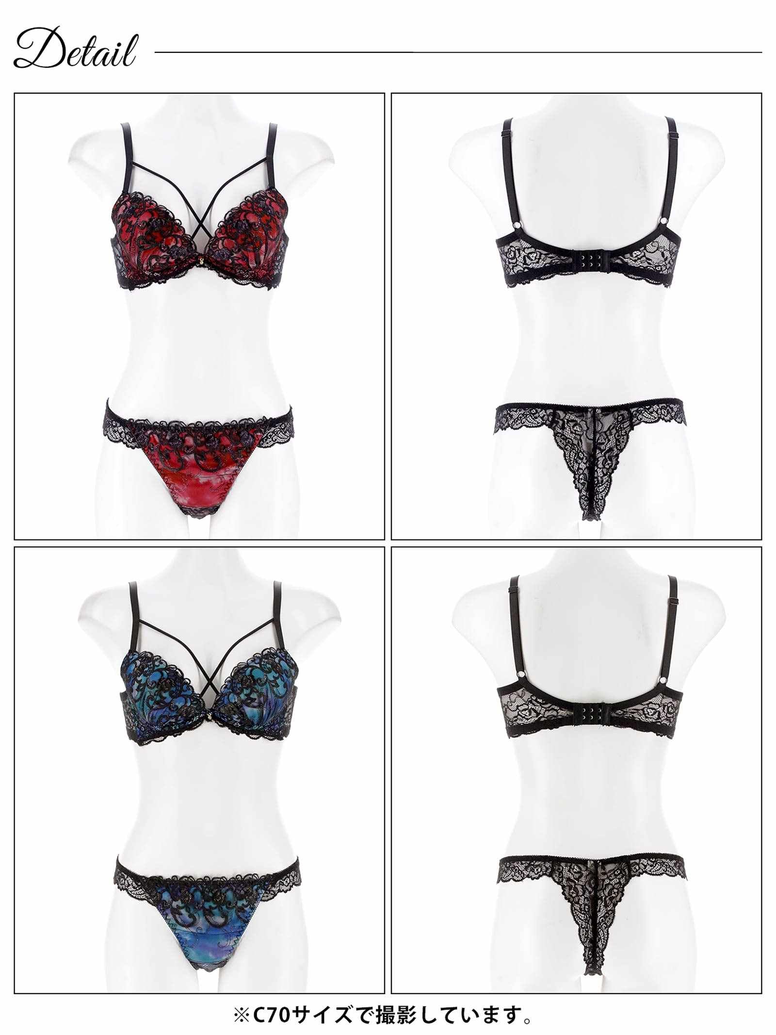 鮮やかなグラデーションカラーに、ラメが煌めくツタ柄刺繍をあしらったゴージャスなランジェリー。バストをぎゅっと寄せるようなクロスコードが視線を奪う色っぽさも抜群のデザイン◎ショーツは素肌が透けるバックレース仕様で後ろ姿まで華やかに見せてくれます♪モデル…minori