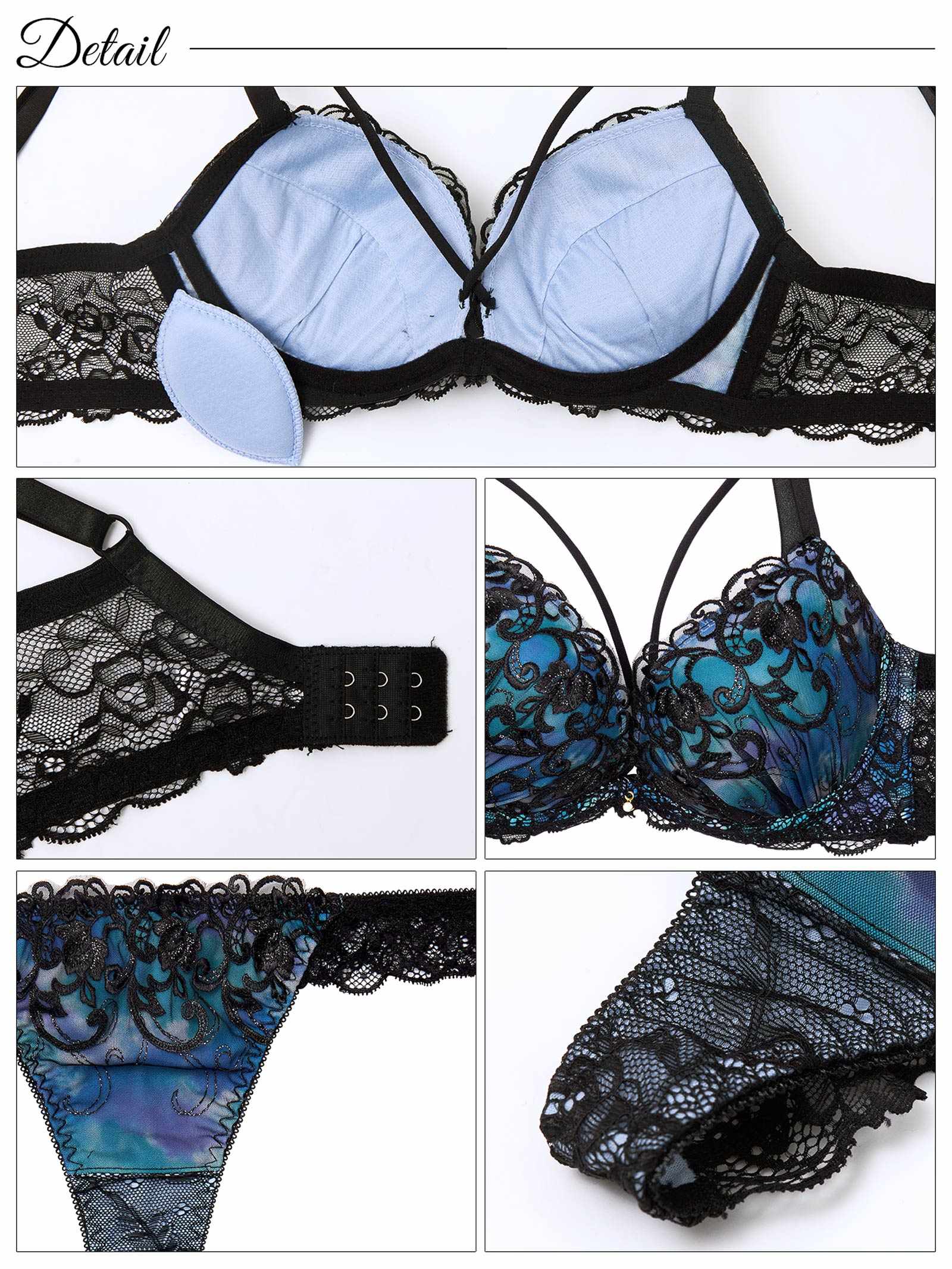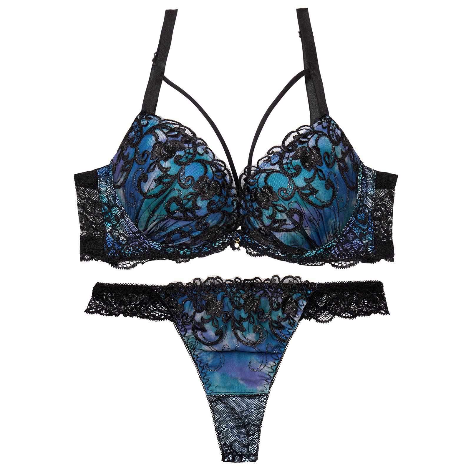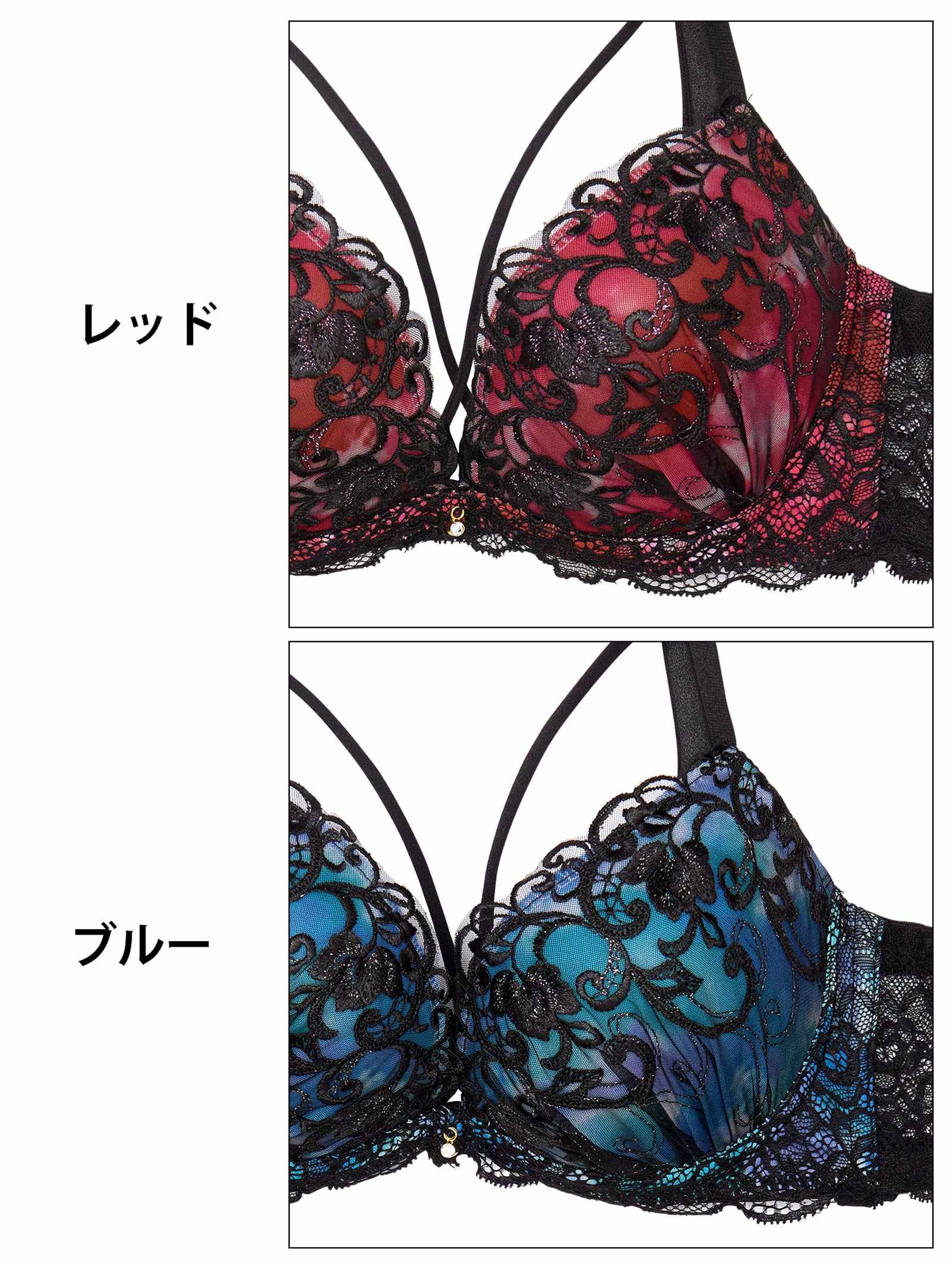 鮮やかなグラデーションカラーに、ラメが煌めくツタ柄刺繍をあしらったゴージャスなランジェリー。バストをぎゅっと寄せるようなクロスコードが視線を奪う色っぽさも抜群のデザイン◎ショーツは素肌が透けるバックレース仕様で後ろ姿まで華やかに見せてくれます♪モデル…minori