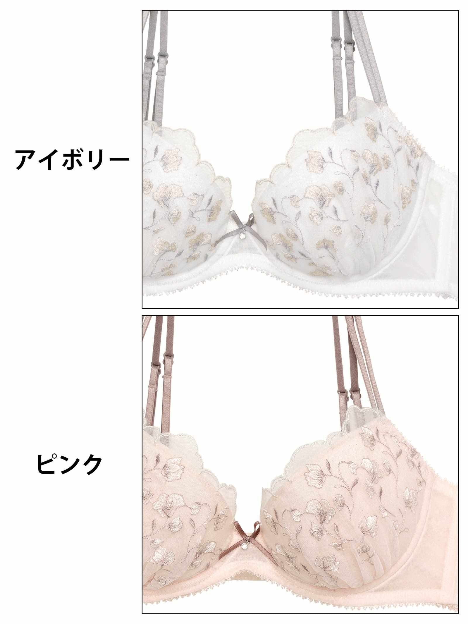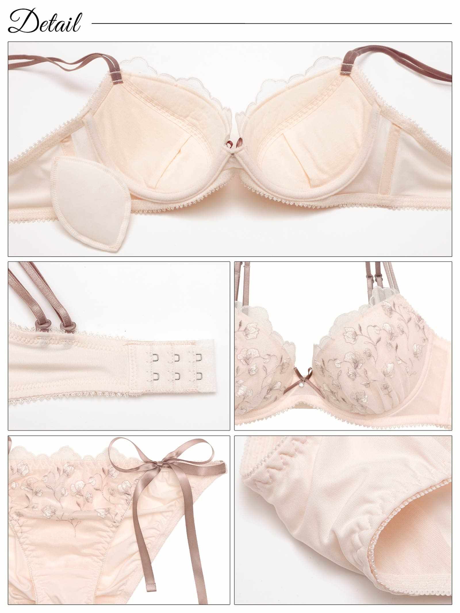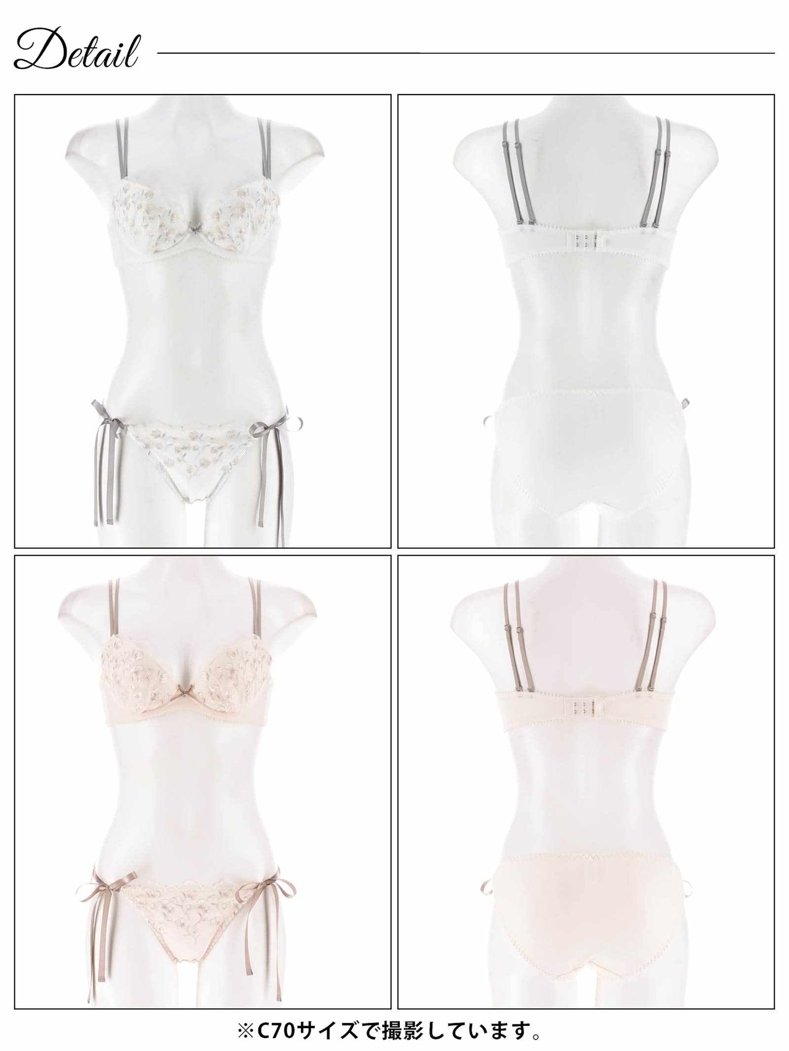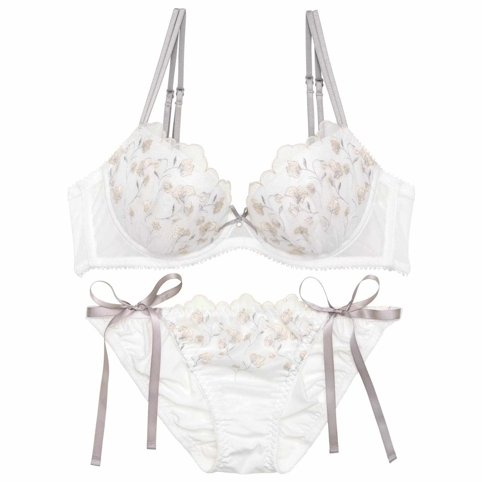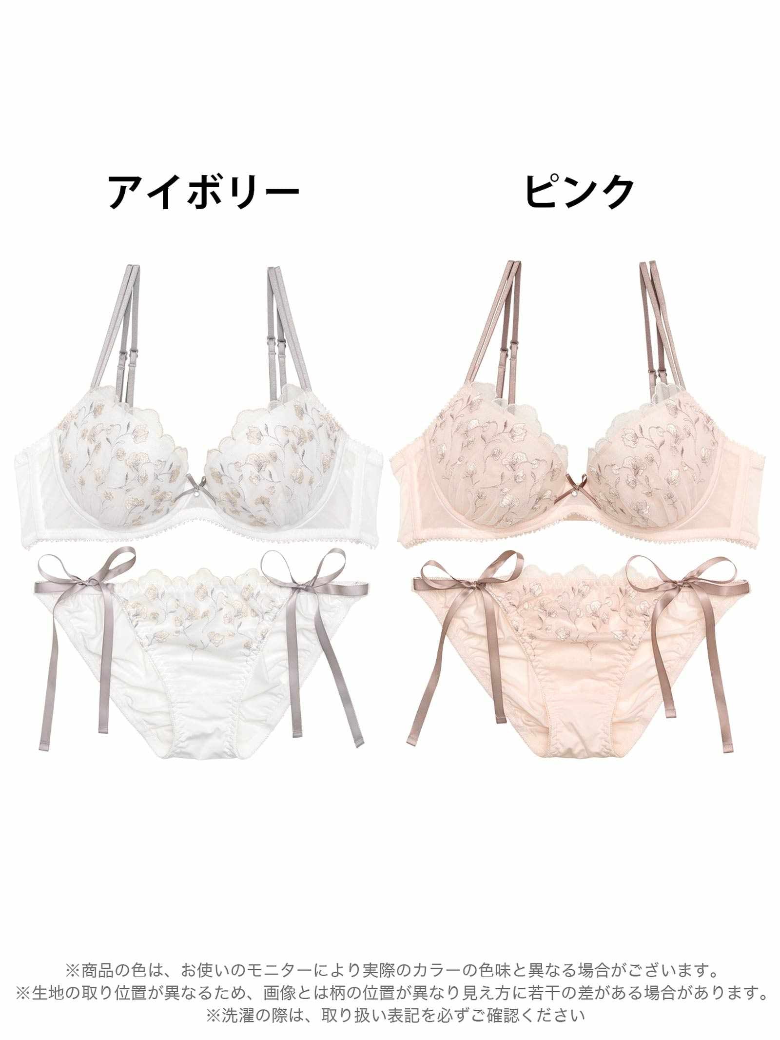 可憐なフラワー刺繍や丸みのあるスカラップデザインがフェミニンなムードを演出するランジェリー。細めのダブルストラップは取り付け方次第で3通りのアレンジが可能で、背中見せファッションも楽しめちゃいます♪ショーツのリボンはほどけても安心な飾りリボン仕様です◎