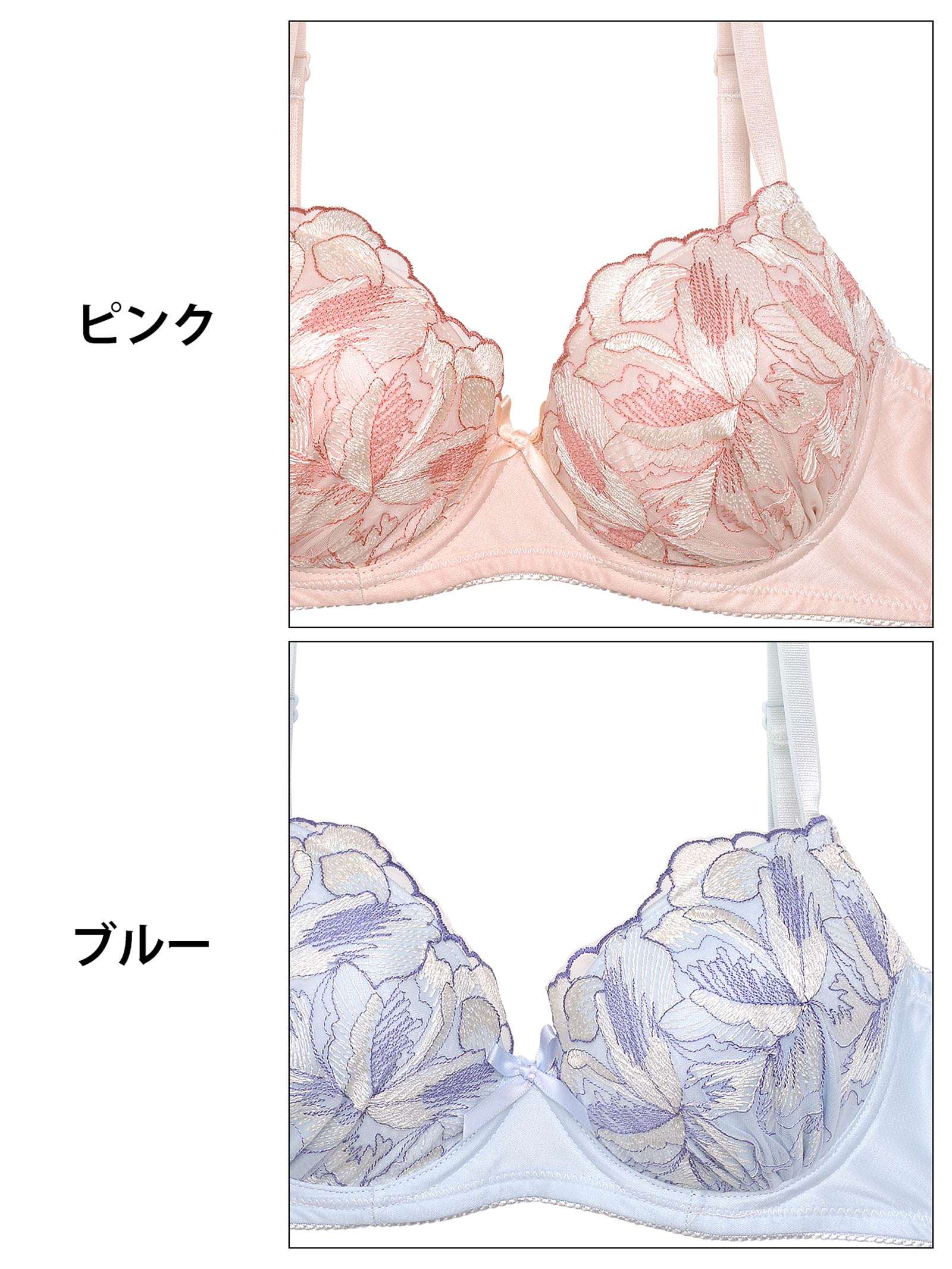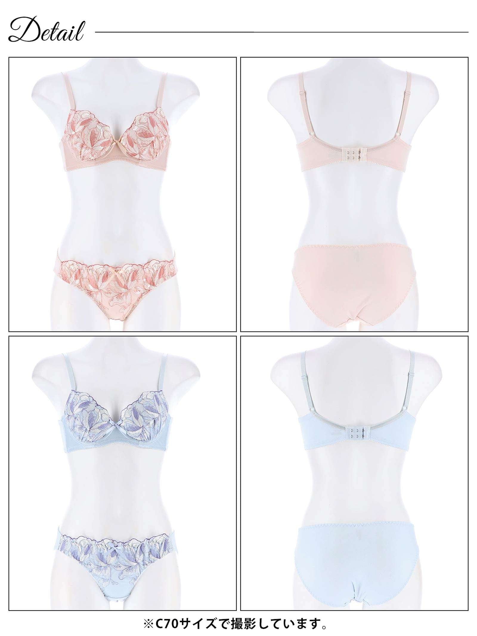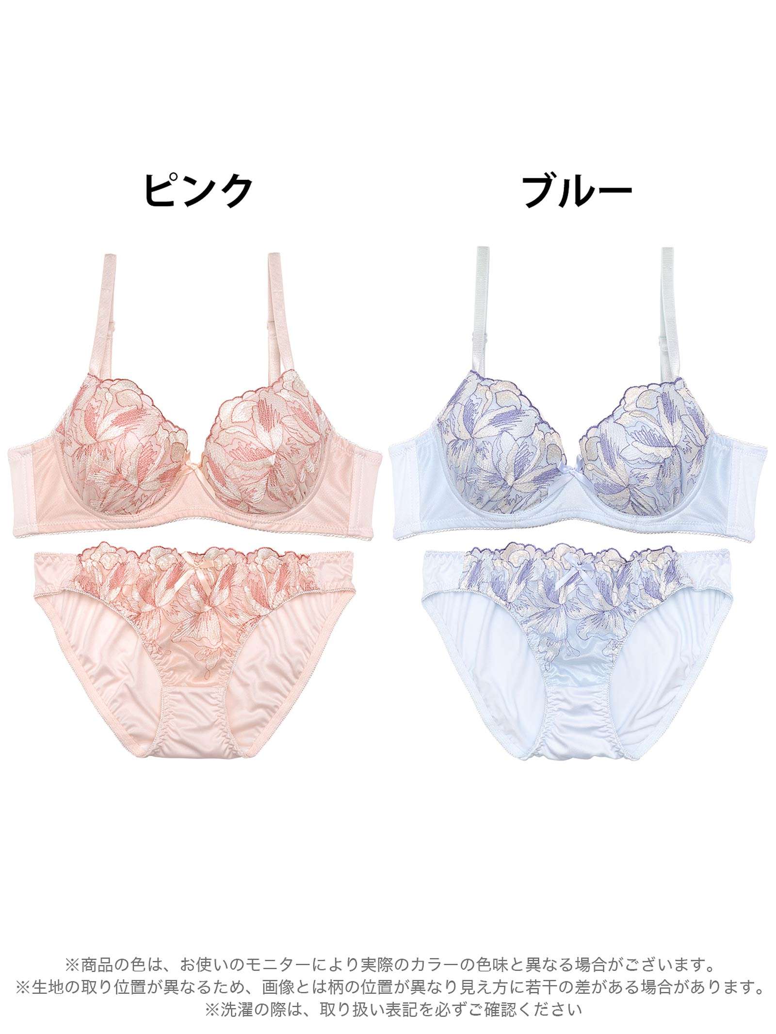 重なり合う花びらをカップいっぱいに刺繍したフェミニンな印象のランジェリー。中央にあしらわれたキュートなリボンもポイント♪ショーツはノーマルタイプのフルバック仕様でデイリー使いにもぴったりです!