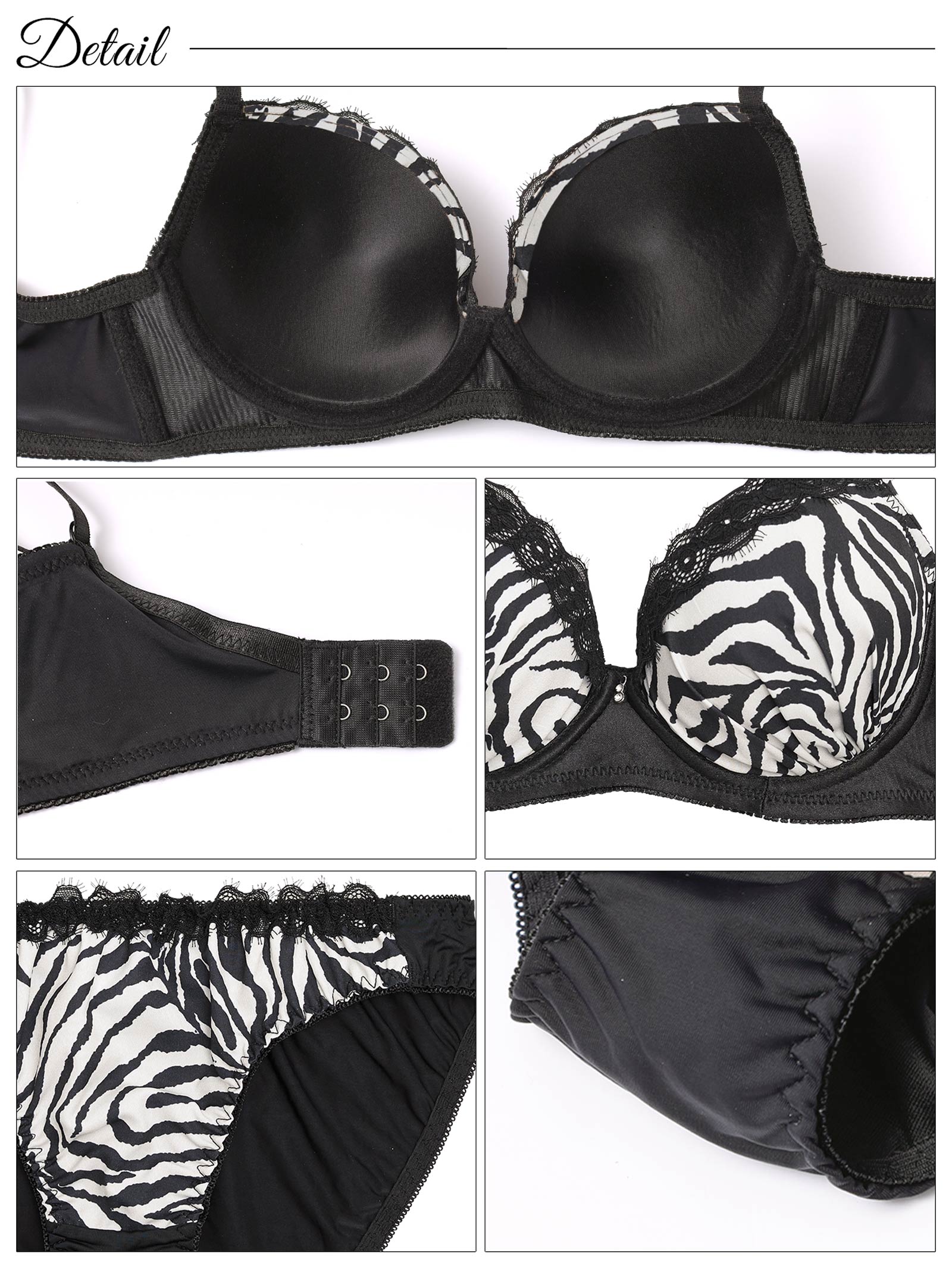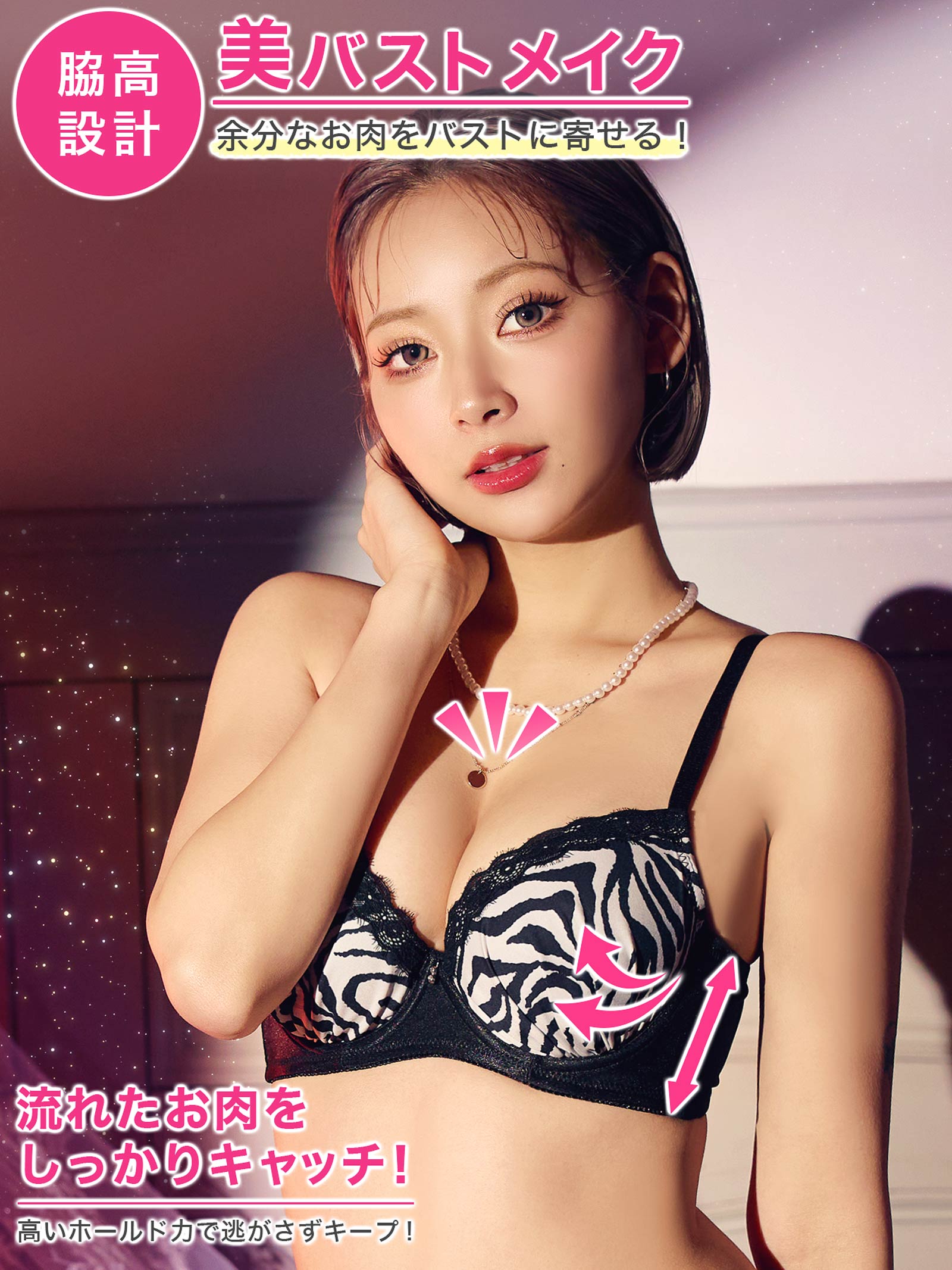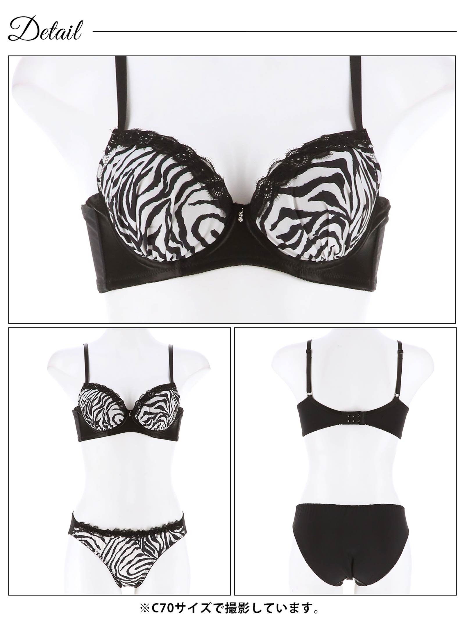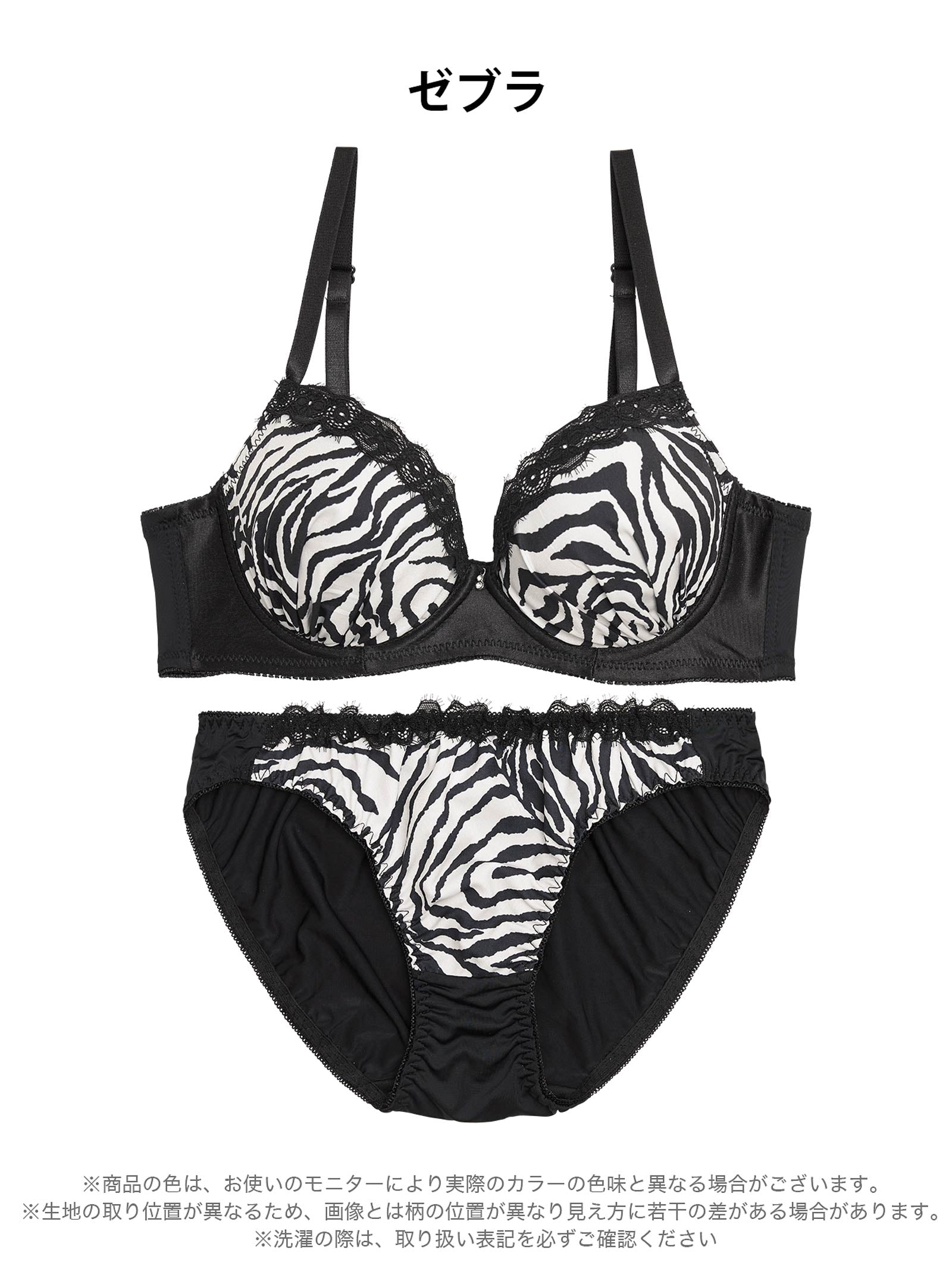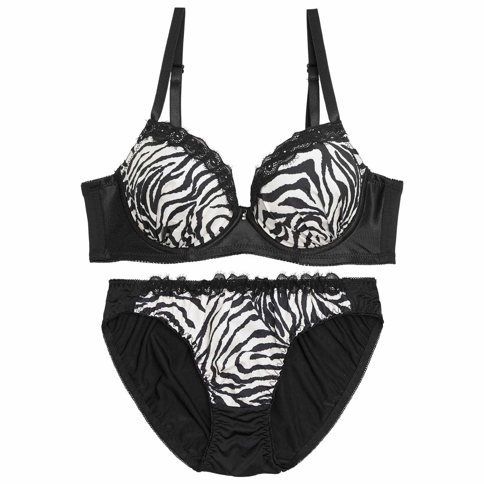 滑らかなマットサテン生地にゼブラ柄がセクシーさ溢れるランジェリー。キラリと輝くチャームやフラワーレースを上部に重ね、大人な上品さもプラス♪ 脇高仕様でバストを美しくキープしてくれる1着です◎ モデル…PyunA.