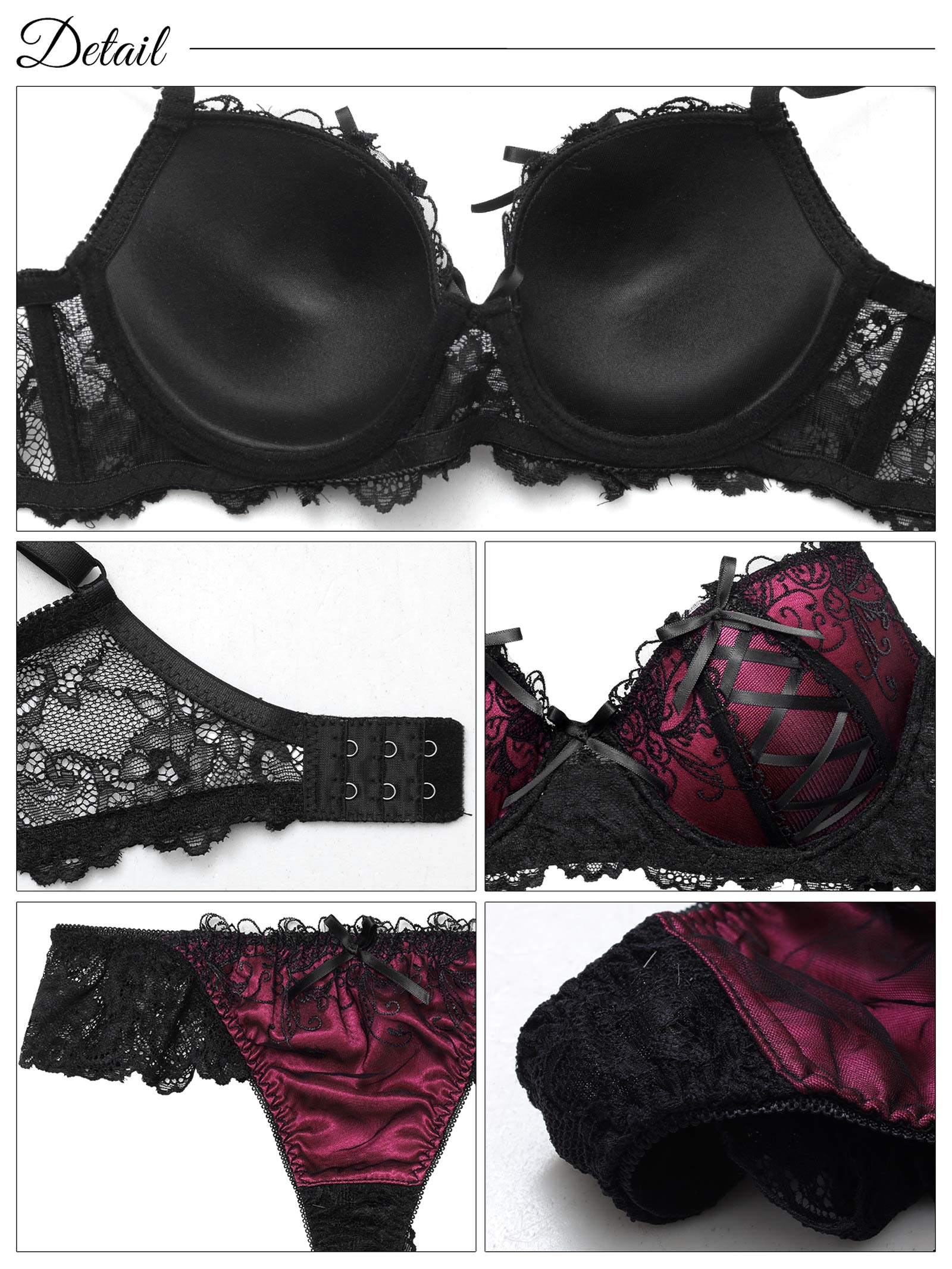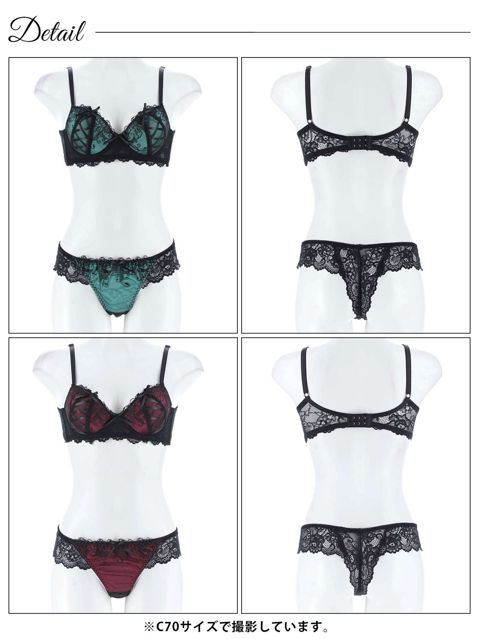カップのレースアップデザインが目を惹くゴシックな雰囲気のランジェリー。大人っぽい落ち着いた色使いの中に、リボンやレースをあしらいほどよく甘さもプラス♪バックは素肌が透けるレースで後ろ姿をセクシーに演出します◎モデル…PyunA.