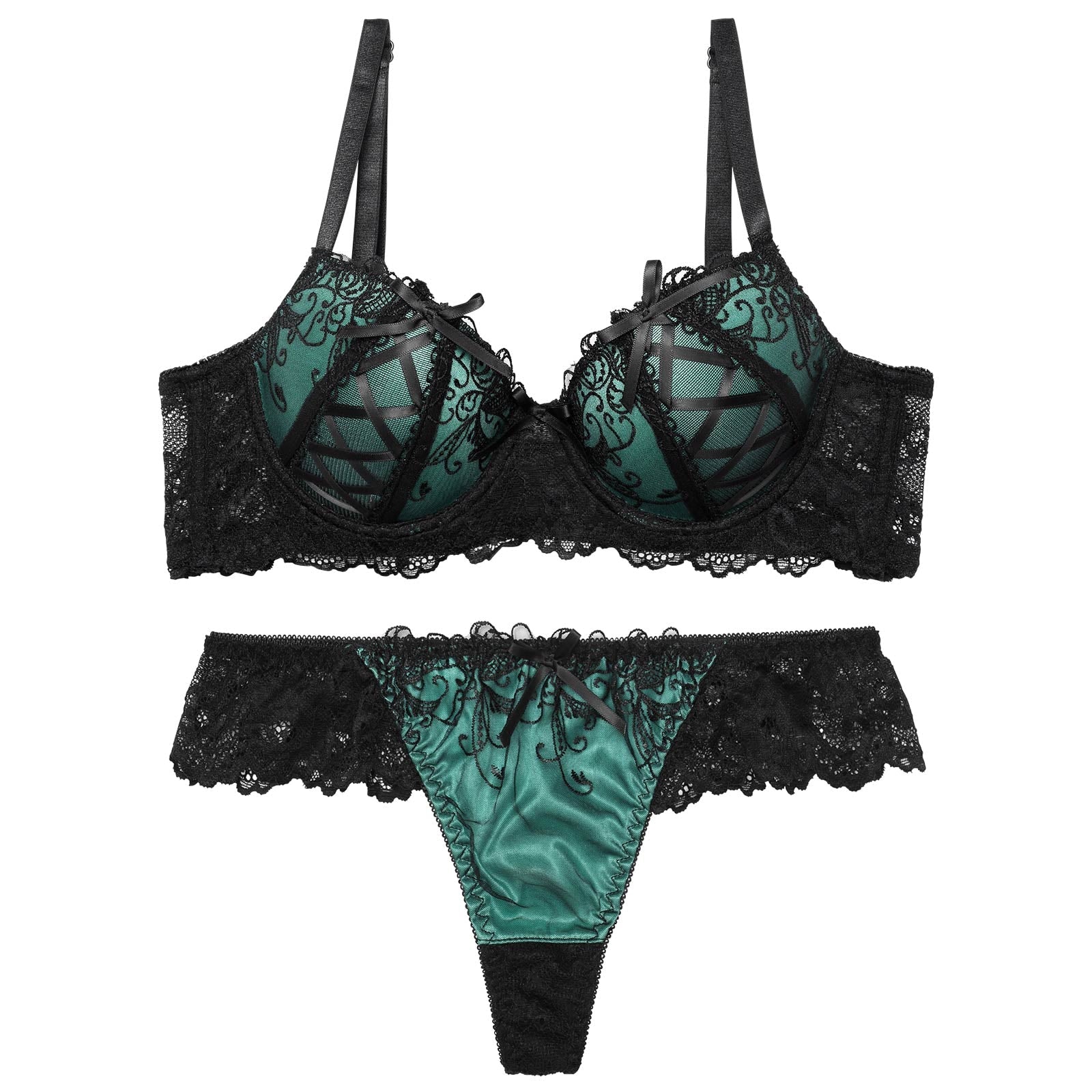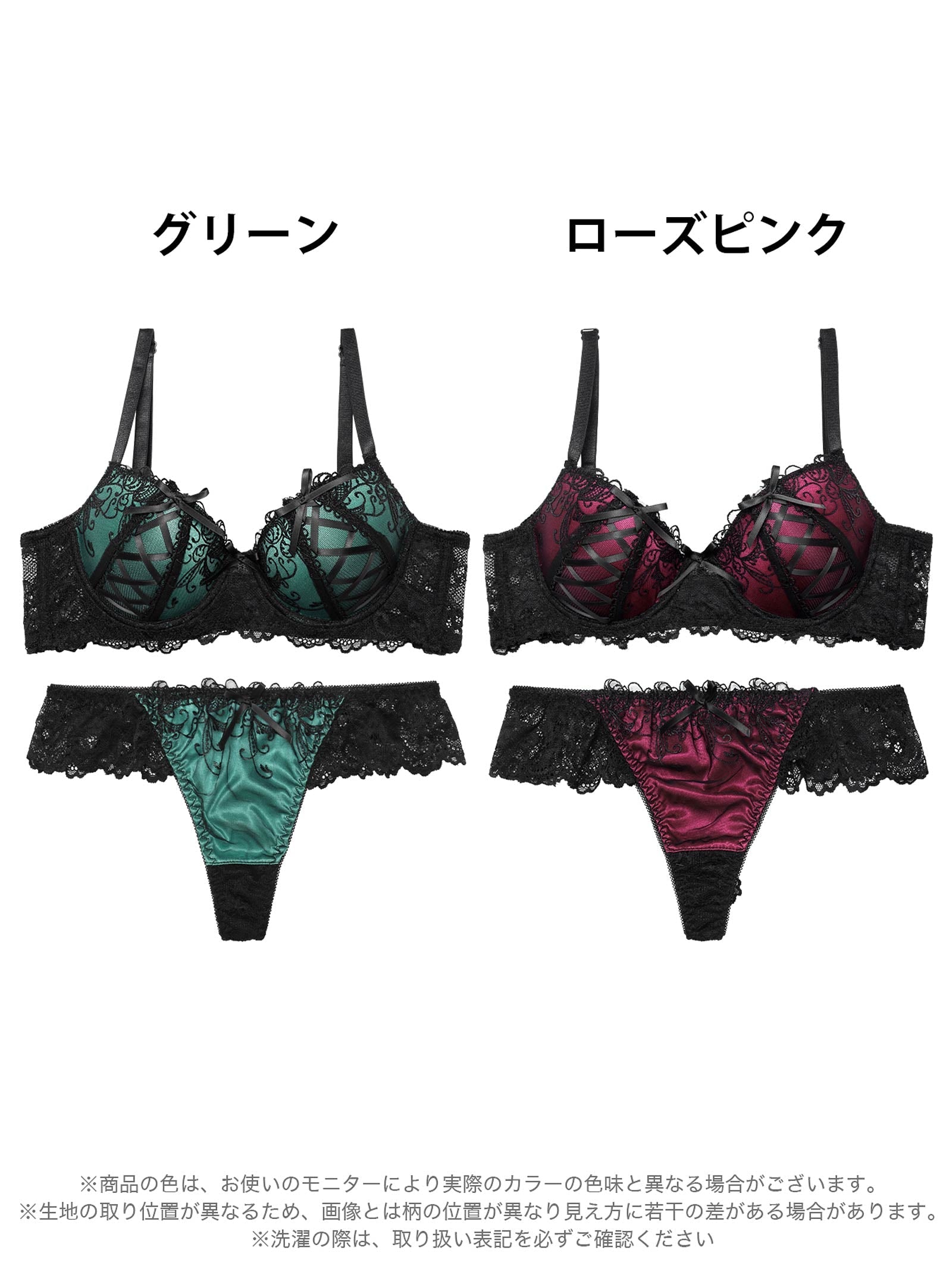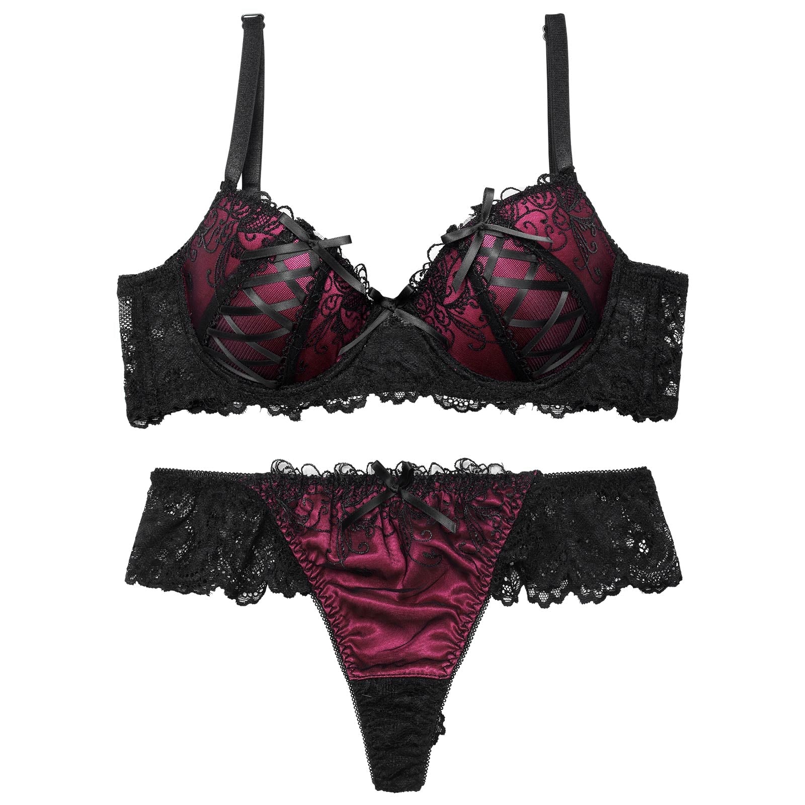 【EFサイズ】ゴシックスピンドルリボン育乳脇高ブラジャー&バック透けTバックショーツ