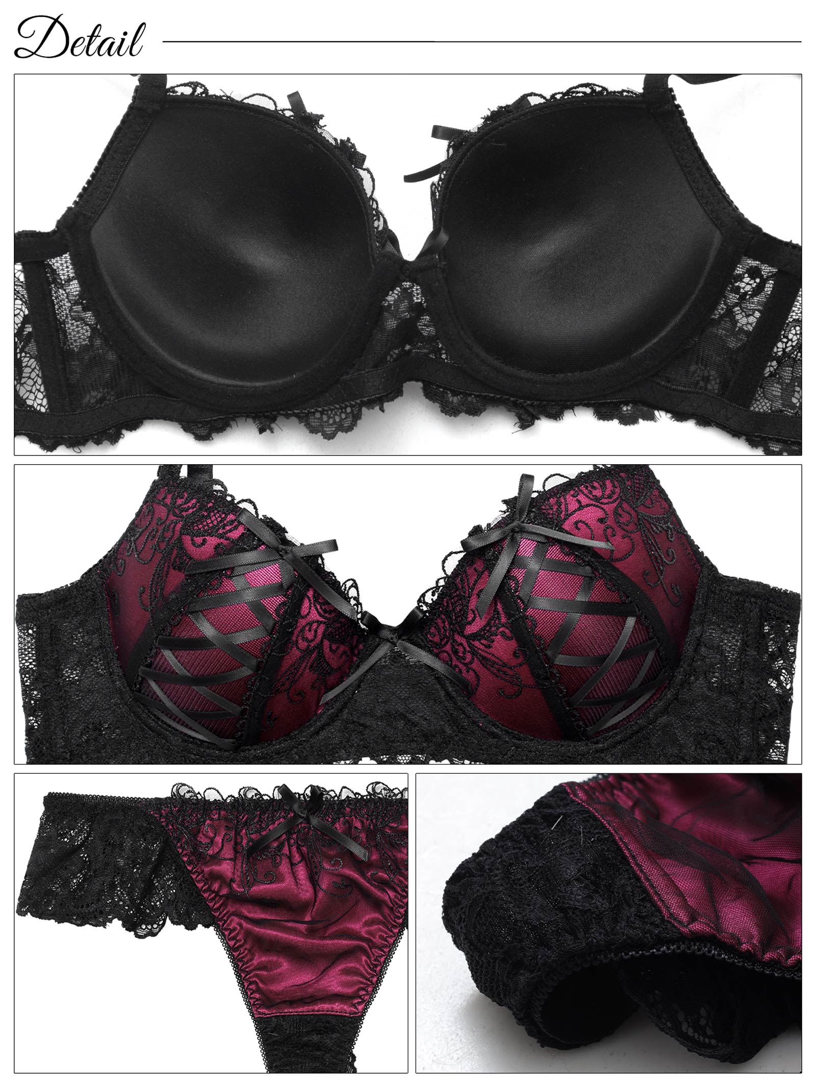 カップのレースアップデザインが目を惹くゴシックな雰囲気のランジェリー。大人っぽい落ち着いた色使いの中に、リボンやレースをあしらいほどよく甘さもプラス♪バックは素肌が透けるレースで後ろ姿をセクシーに演出します◎モデル…PyunA.