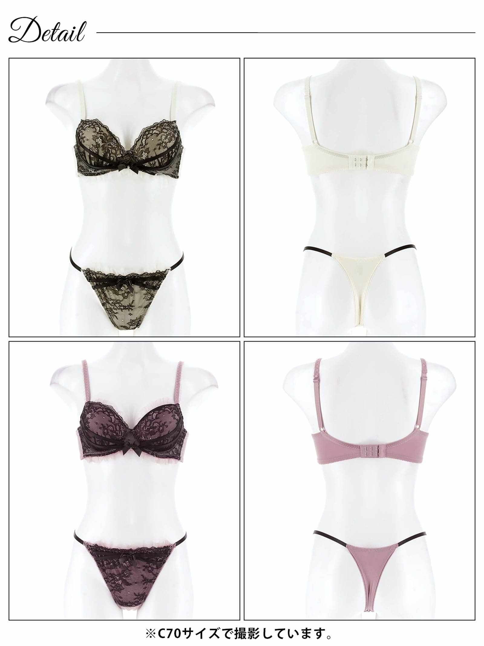大人レディなダスティカラーにブラックレースを合わせたゴシック感溢れるランジェリー。肩紐まであしらわれた透け感のあるフリルチュールがガーリーなアクセントに◎ ショーツサイドは大胆なストリング仕様で甘めセクシーな雰囲気漂う1着です。