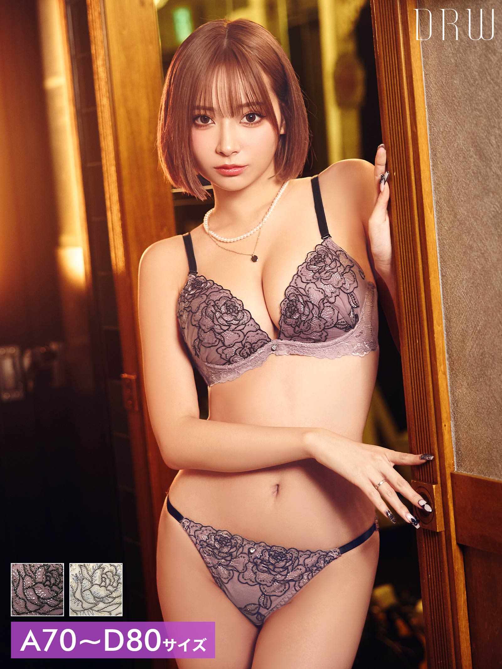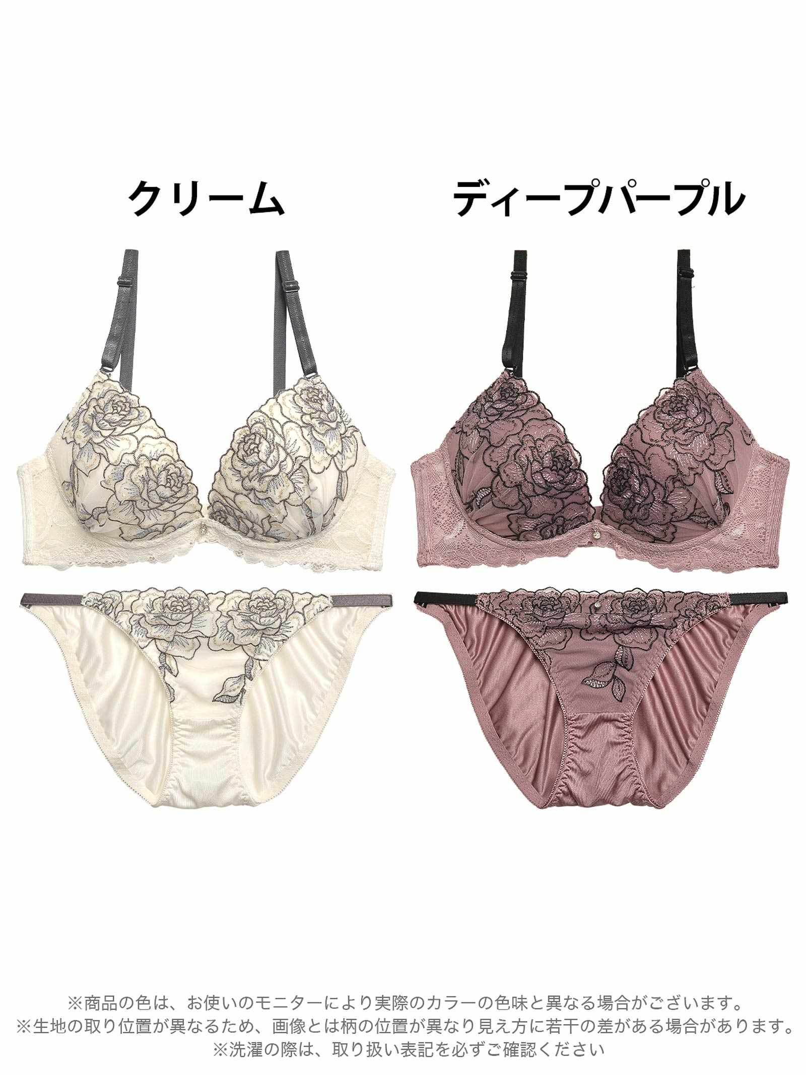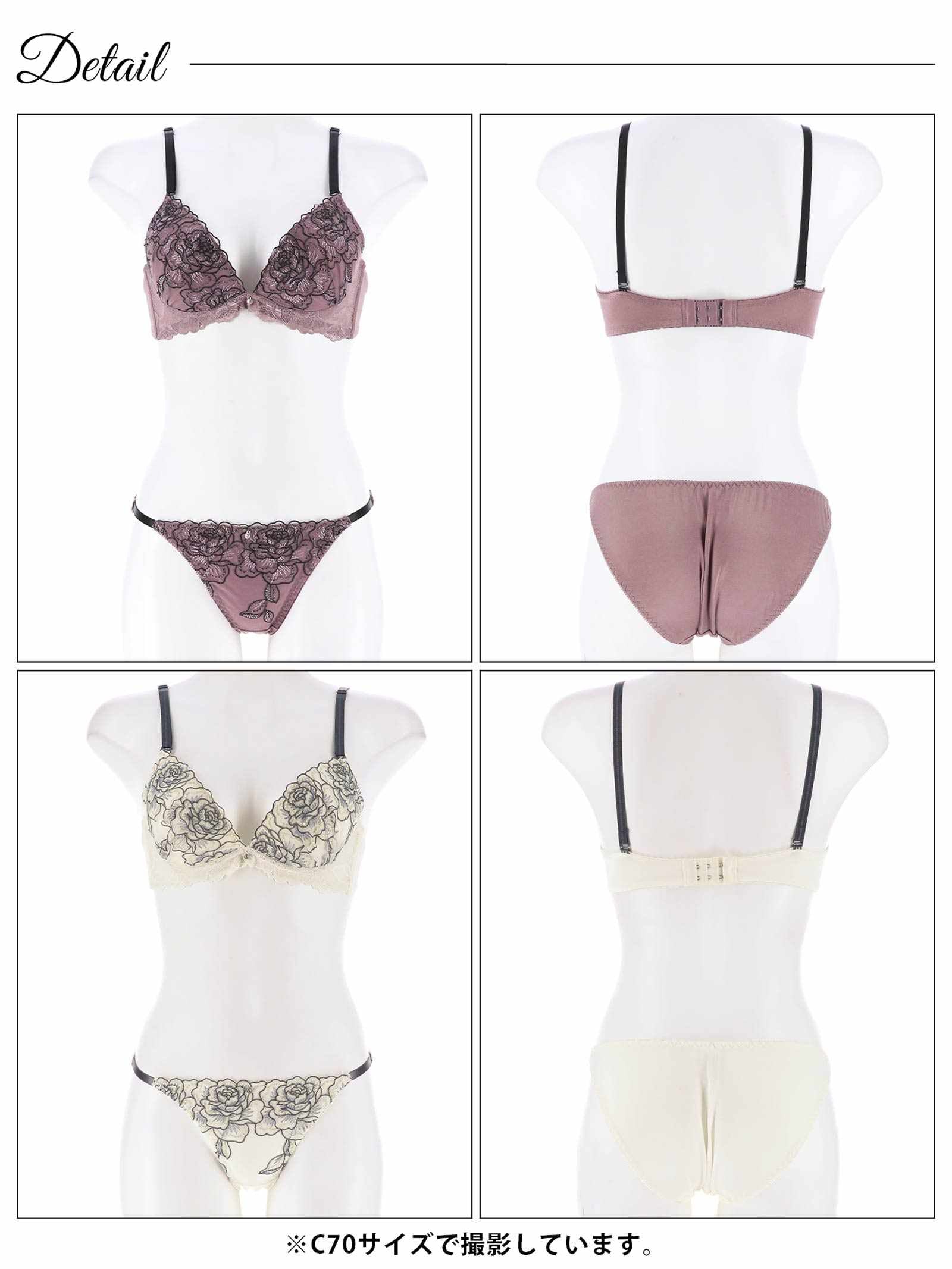 クラシックな雰囲気漂う大輪ローズが美しいランジェリー。生地全面を埋め尽くす刺繍デザインやラインチャームが高級感をプラスします◎ サイドストリングのショーツで腰回りを華奢魅せしてくれる1着です♪
