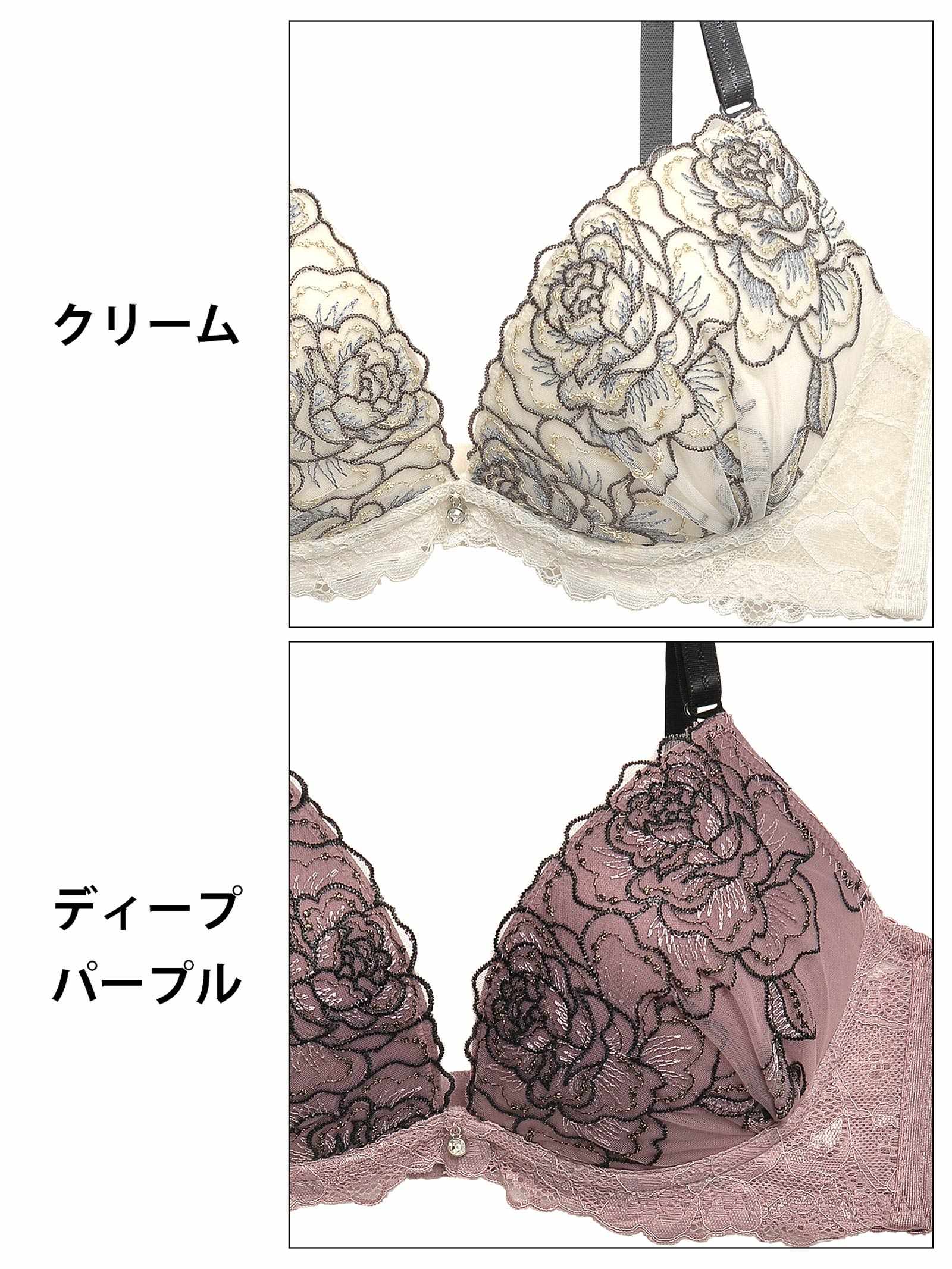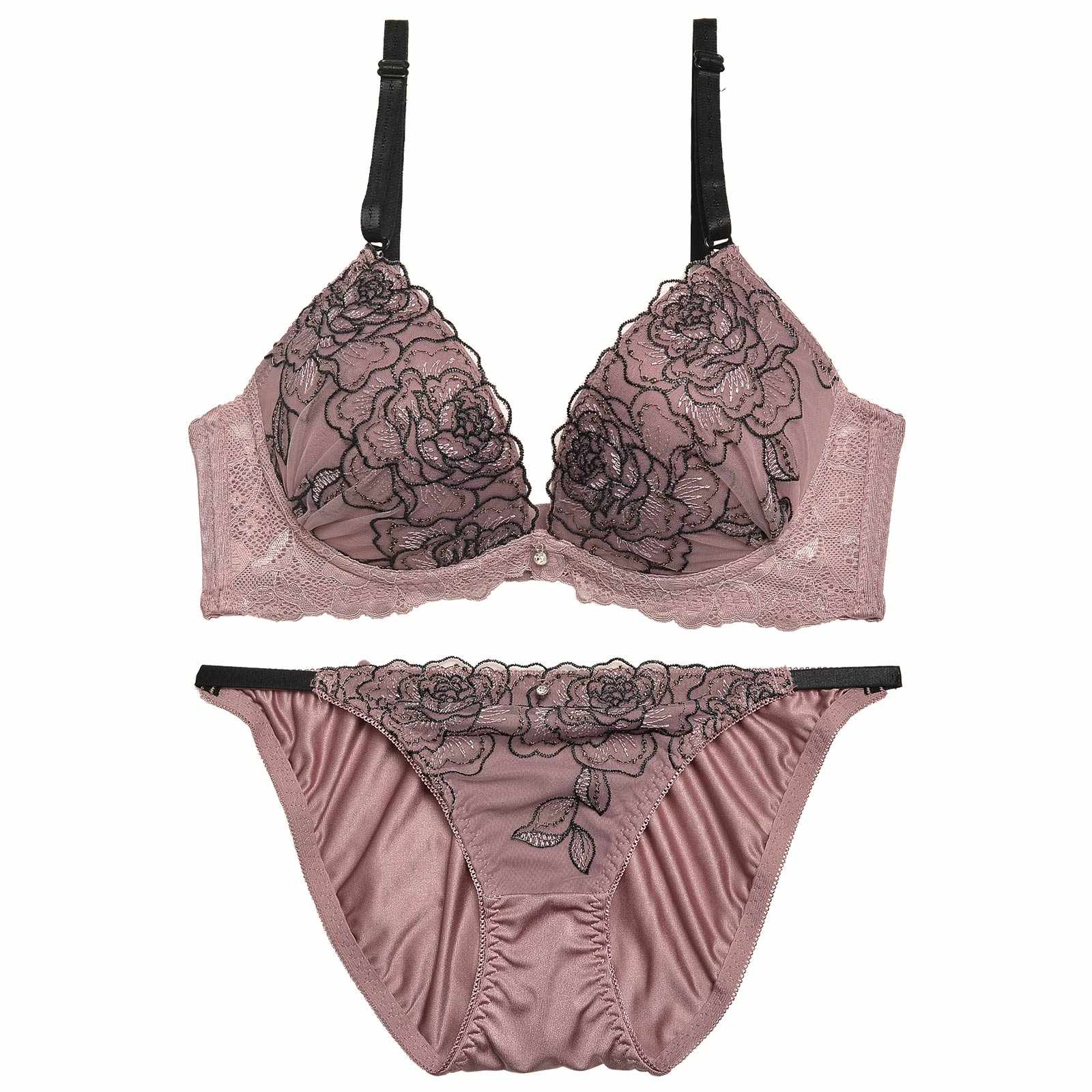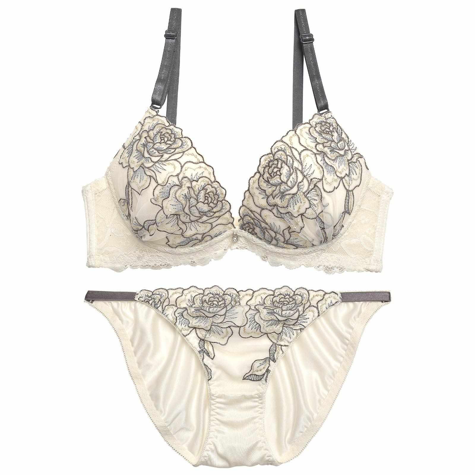 クラシックな雰囲気漂う大輪ローズが美しいランジェリー。生地全面を埋め尽くす刺繍デザインやラインチャームが高級感をプラスします◎ サイドストリングのショーツで腰回りを華奢魅せしてくれる1着です♪