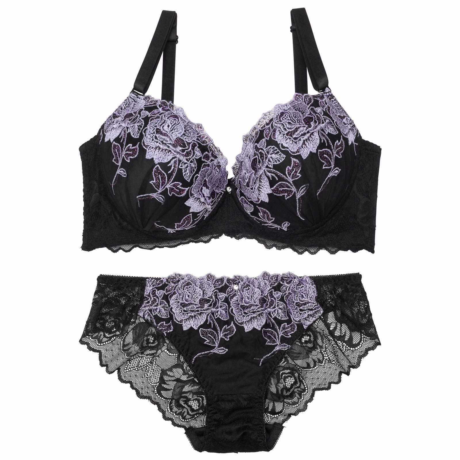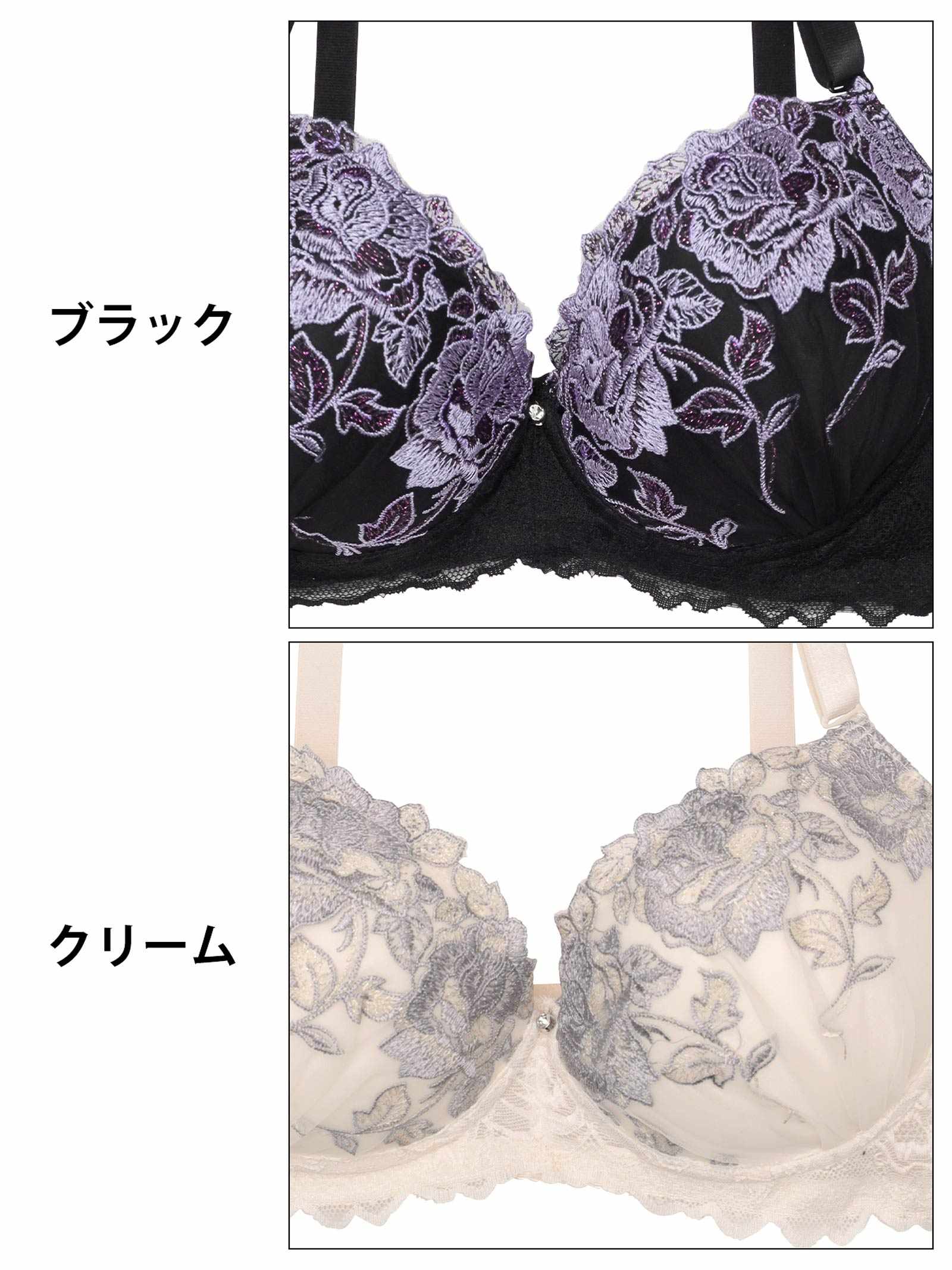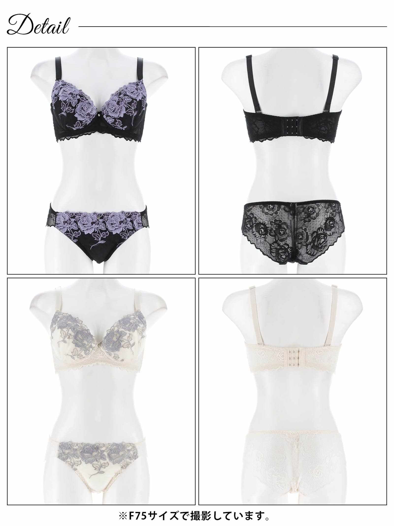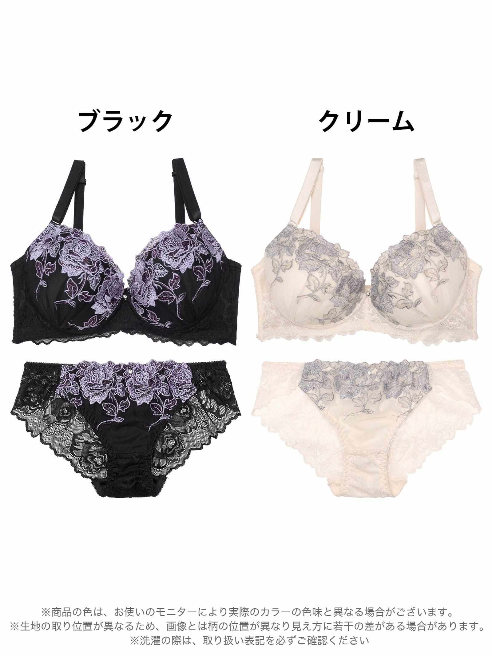 優雅に咲き誇る大輪ローズの刺繍が高級感漂うランジェリー。360度施されたレース生地の肌透けや煌びやかなチャームの上品さが女性らしさを際立たせます◎ 美胸キープを欠かさない脇高構造ですっきりとしたシルエットを演出します。
