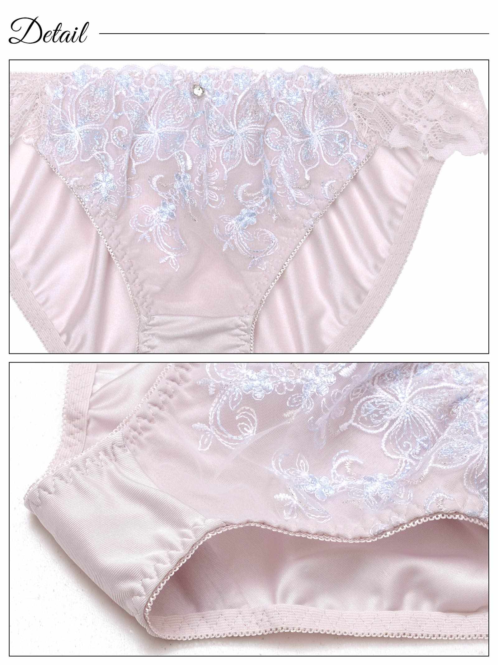 女の子らしい柔らかいペールカラーにリーフや小さな花々の刺繍を贅沢にあしらったランジェリー。繊細なサイドレースから覗く素肌透けが甘さの中にもセクシーな印象をプラスします◎ 場面を問わず使いやすい安心安定のフルバック仕様です。