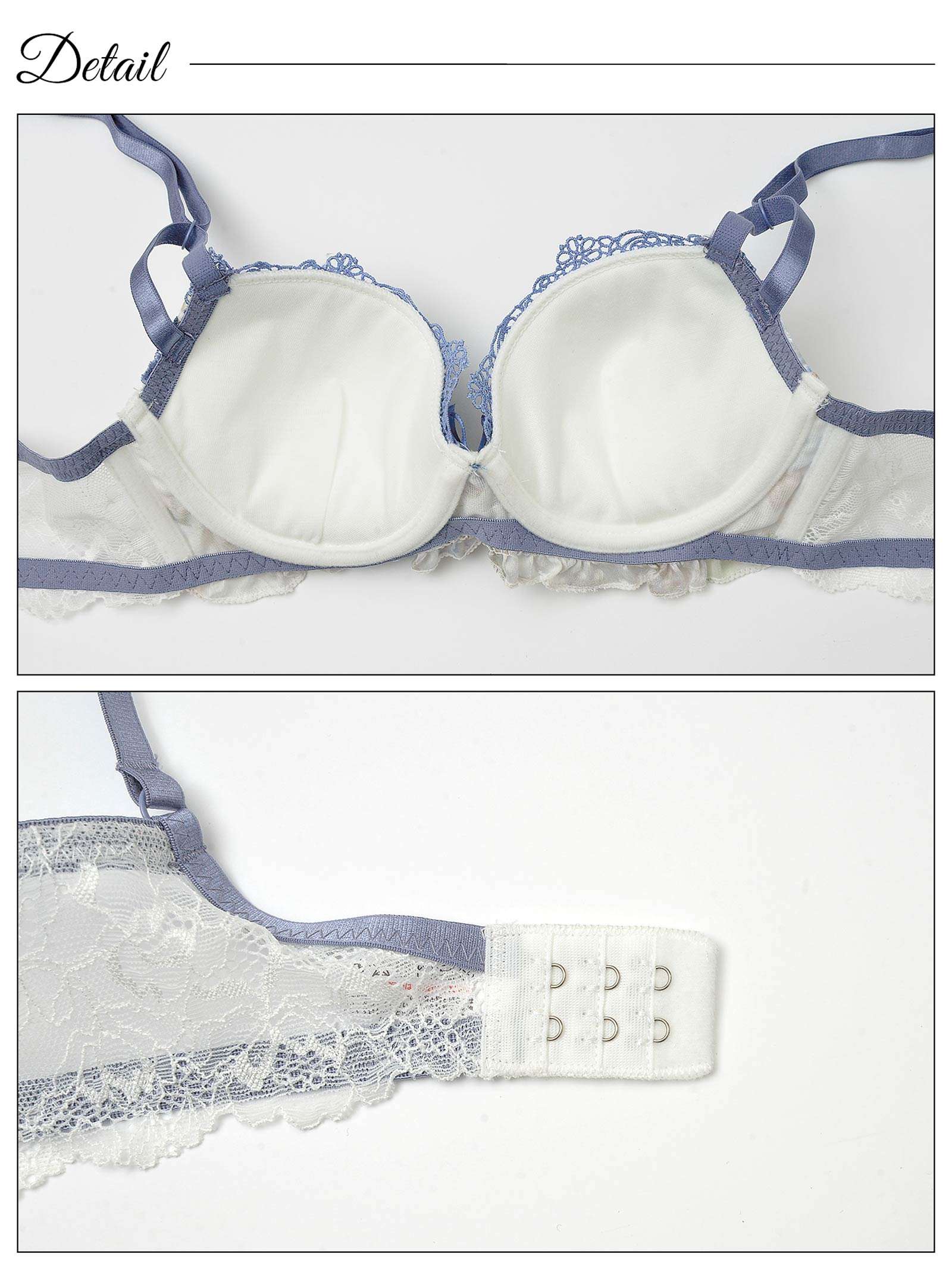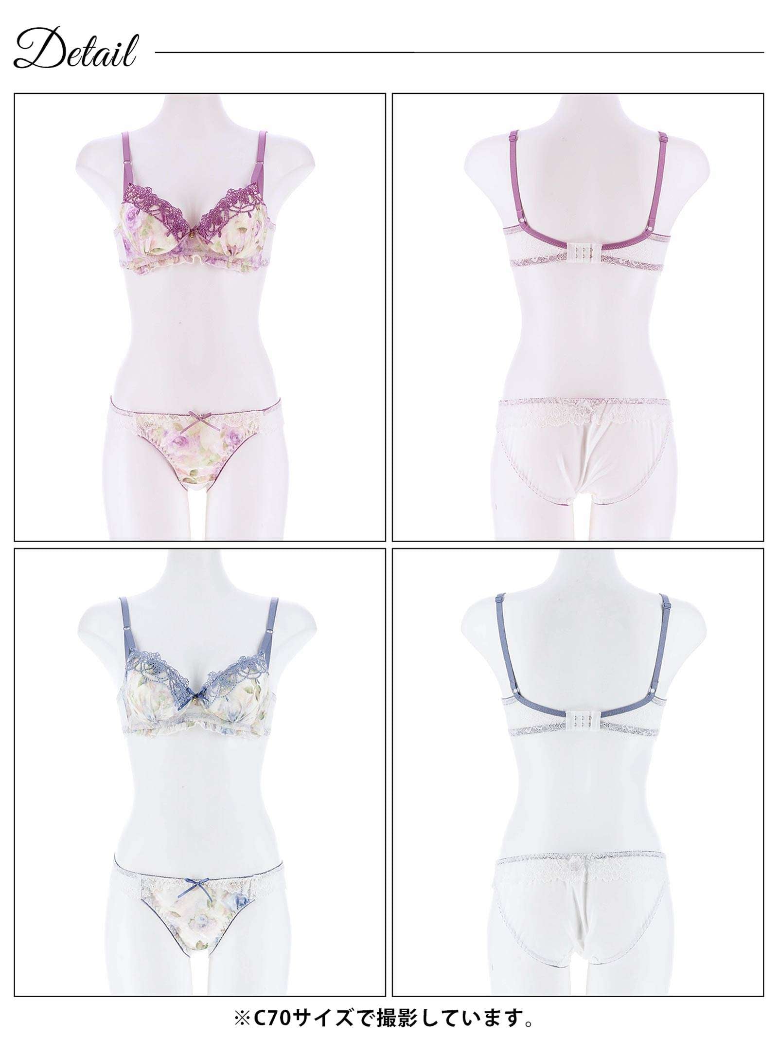 淡い水彩画風のフラワープリントにシャンデリアモチーフの刺繍を重ねた上品なランジェリー。アンダーのさり気ないフリルや、ショーツ上部のレース重ねがキュートな印象に。脇高&三角ストラップで谷間をしっかり支えてくれる1着です◎