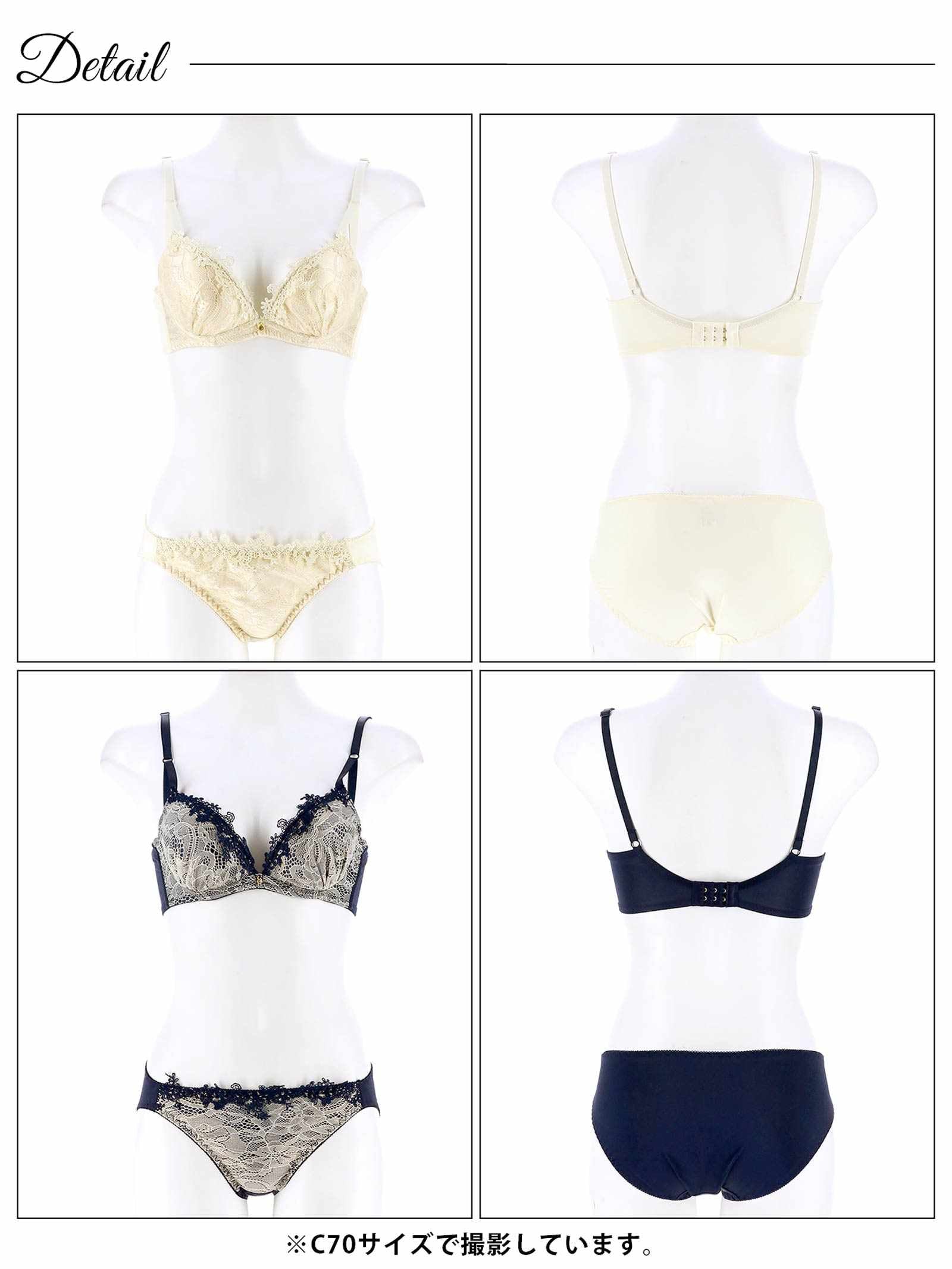 繊細なレース&ケミカルレースをあしらった上品でシックなデザインのランジェリー。中心にきらめくゴールドーのラインストーンチャームがアクセント♪ショーツは伸縮性に優れたフルバック仕様で履き心地も快適です。