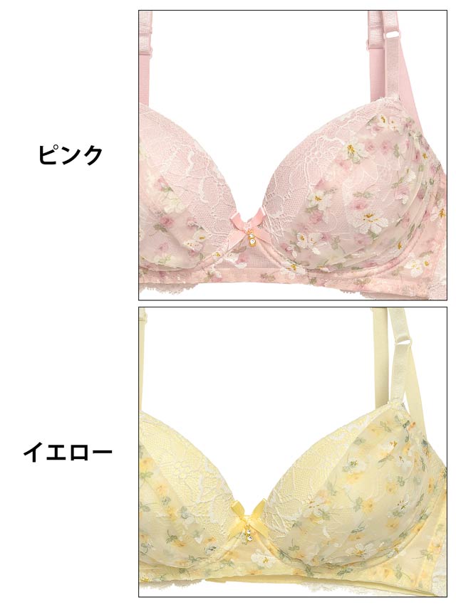 ノンワイヤー パステルカラーのフラワープリント生地をあしらった可愛らしさ満載のランジェリー。リボン&2連のラインストーンチャームが上品なアクセント♪つけ心地快適なノンワイヤー仕様でデイリー使いにもぴったりです◎