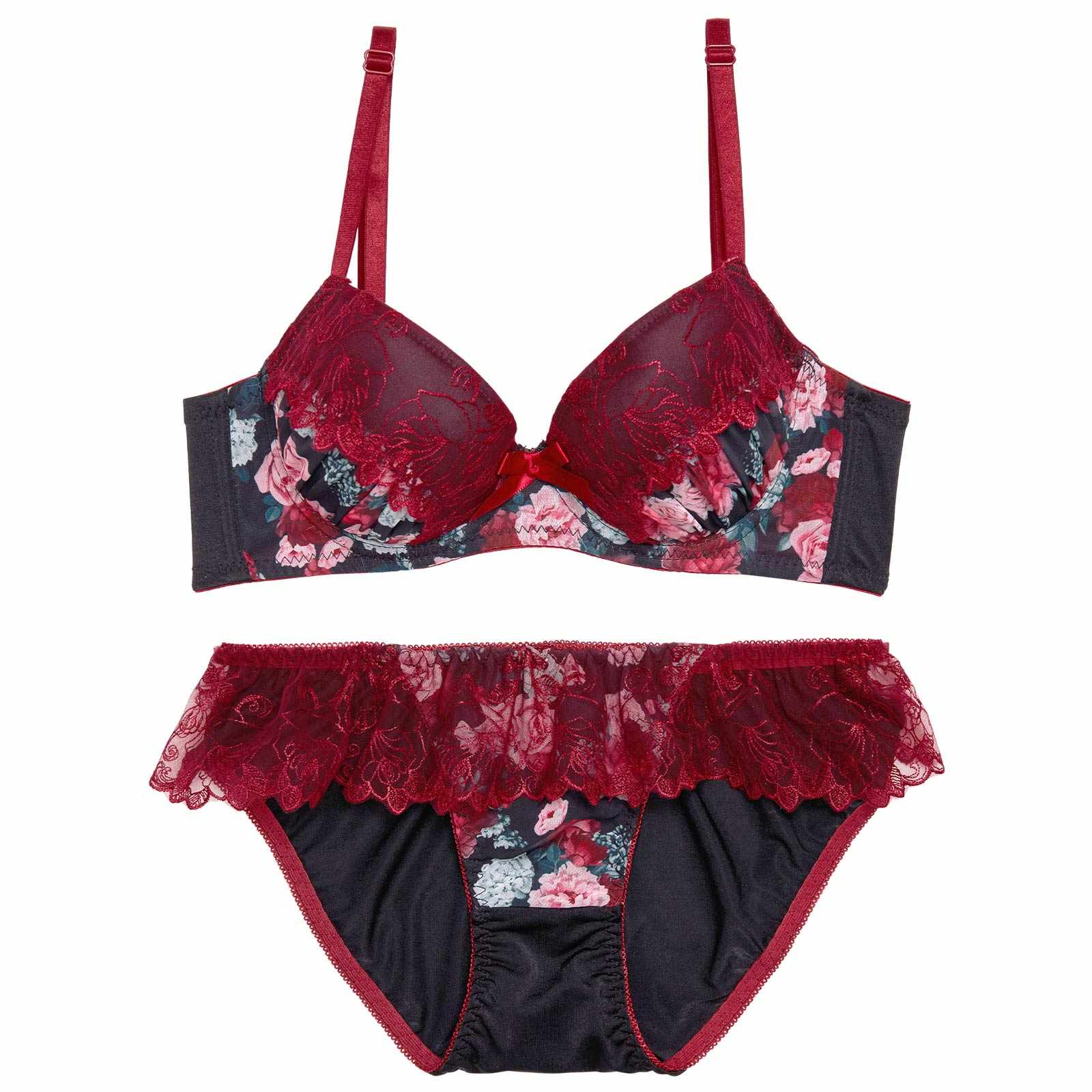 色鮮やかなローズプリントに透け感のある幅広なレースを重ねた高級感漂うランジェリー。ローズ柄のレース越しに透ける素肌が色っぽい印象に◎ 脇高仕様でバストラインを美しく見せてくれるのも嬉しいポイントです♪