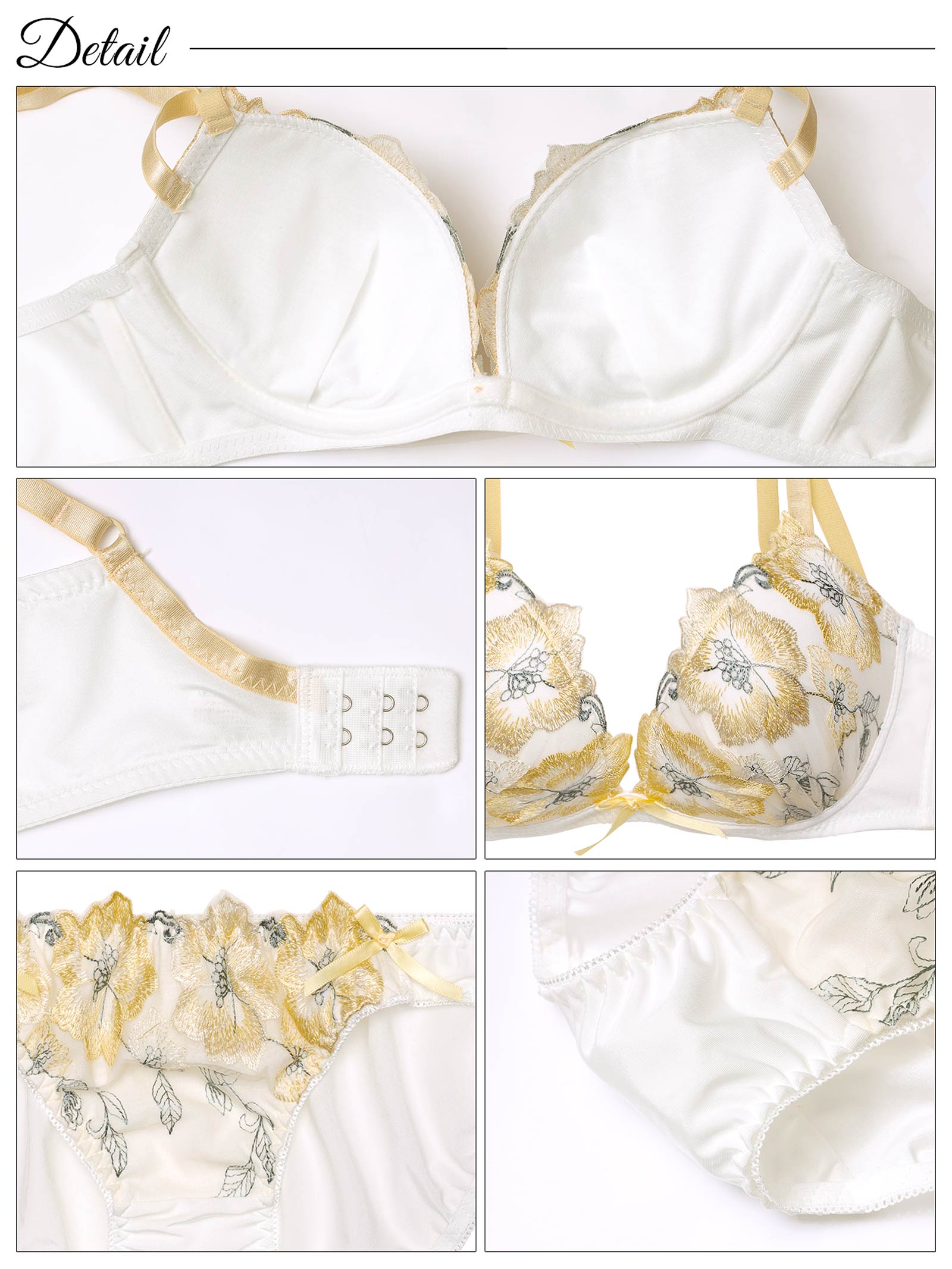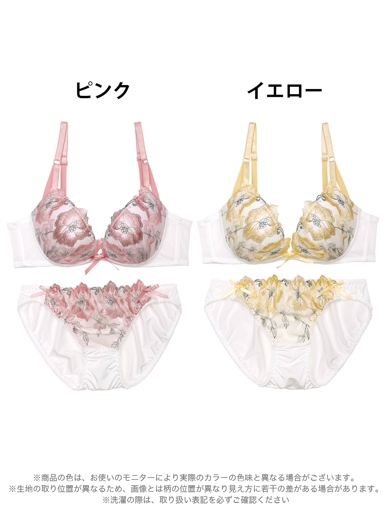 大ぶりの淡いフラワー刺繍を施した華やかでキュートなデザインのランジェリー。胸元やショーツフロントのサテンリボンがほどよく甘さをプラス◎三角ストラップ&脇高設計でバストをしっかりと支えて綺麗な谷間をキープしてくれます♪