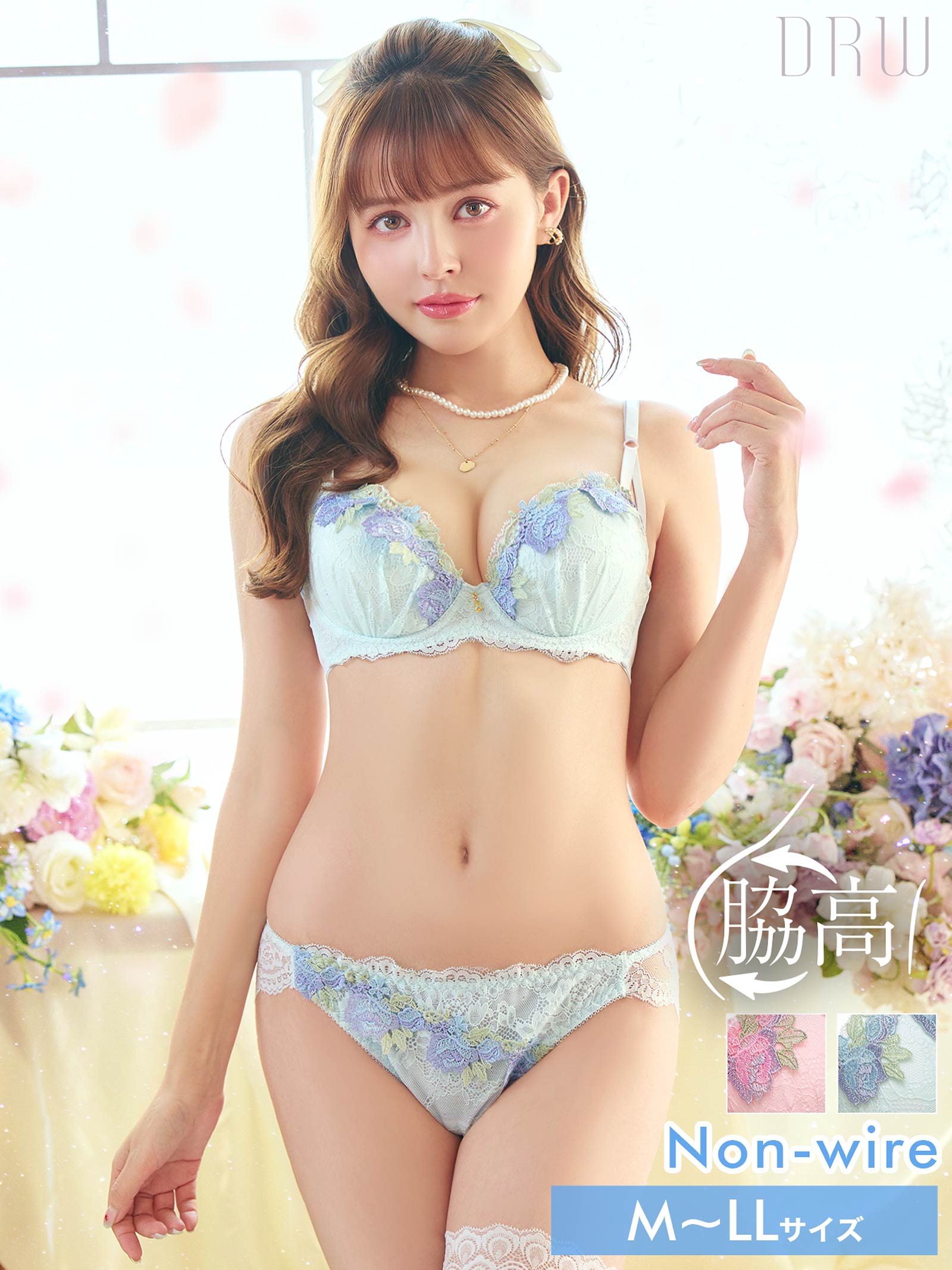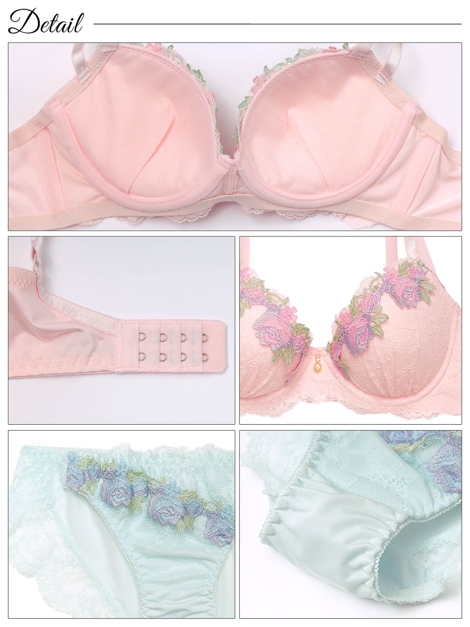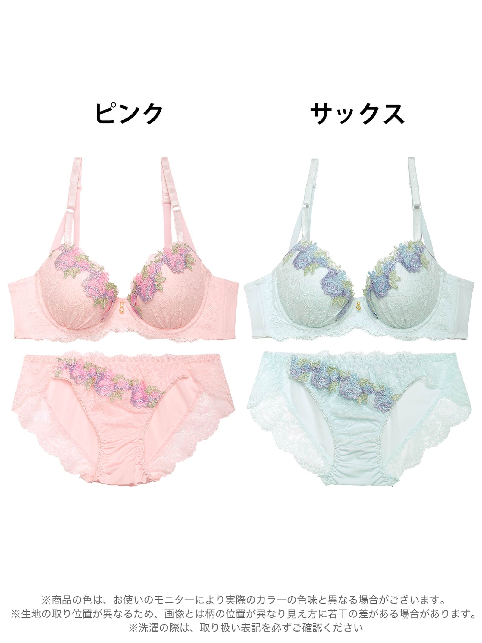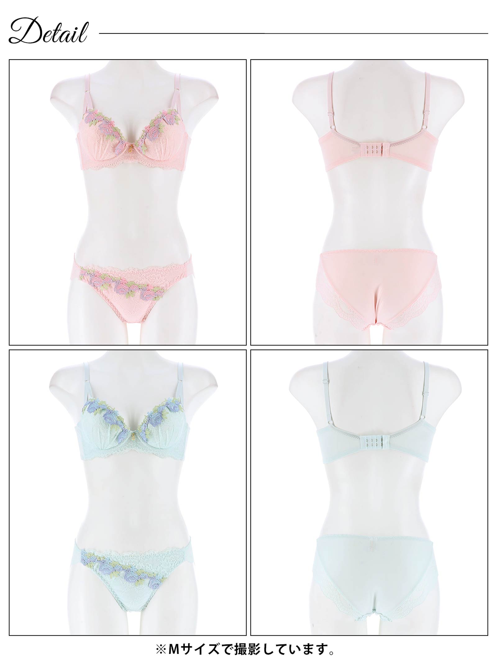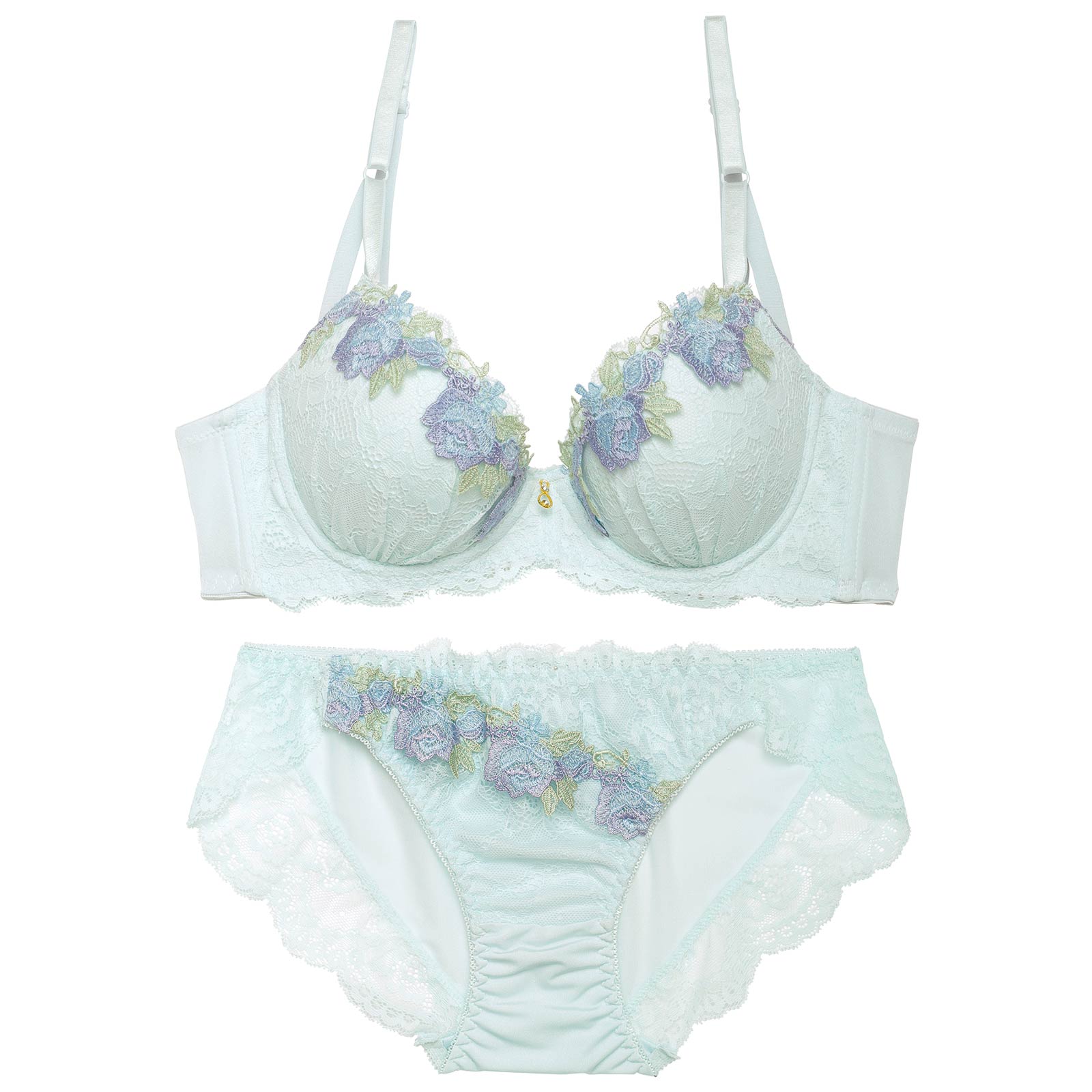 やわらかいパステルカラーのレースに、お花モチーフのケミカルレースをあしらったフェミニンなランジェリー。胸元にきらめくゴールドのチャームが高級感をアップさせます!ショーツの脚口はレース仕上げなのでお洋服にラインが響きにくい仕様です◎