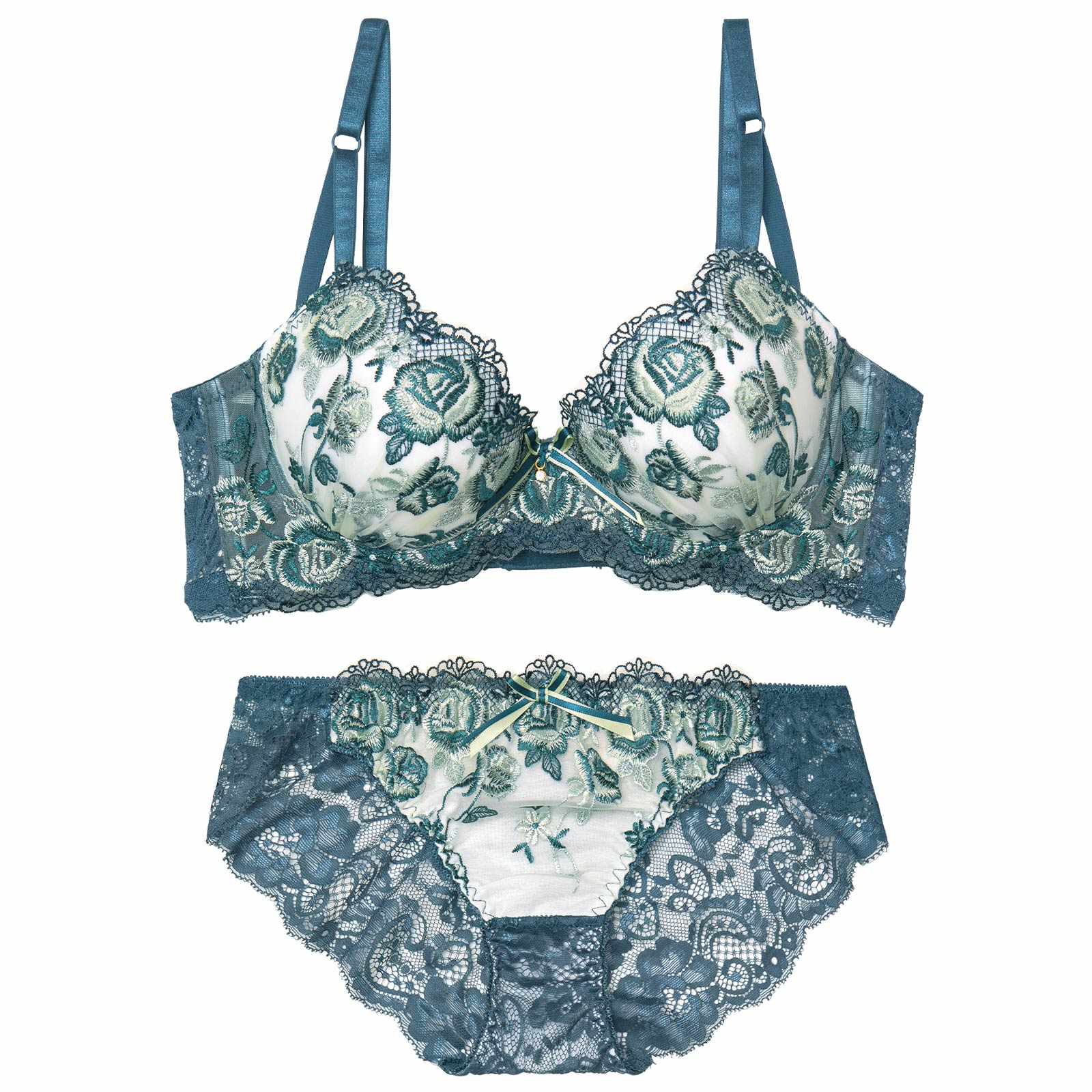 バイカラーのローズ刺繍をふんだんに施したエレガントなデザインのランジェリー。中心には刺繍と同様にバイカラーのリボンとチャームを飾り可愛らしさをプラス♪脇高設計でバストを逃がさずキャッチし、背中のラインもすっきり見せてくれます◎モデル…かとゆり