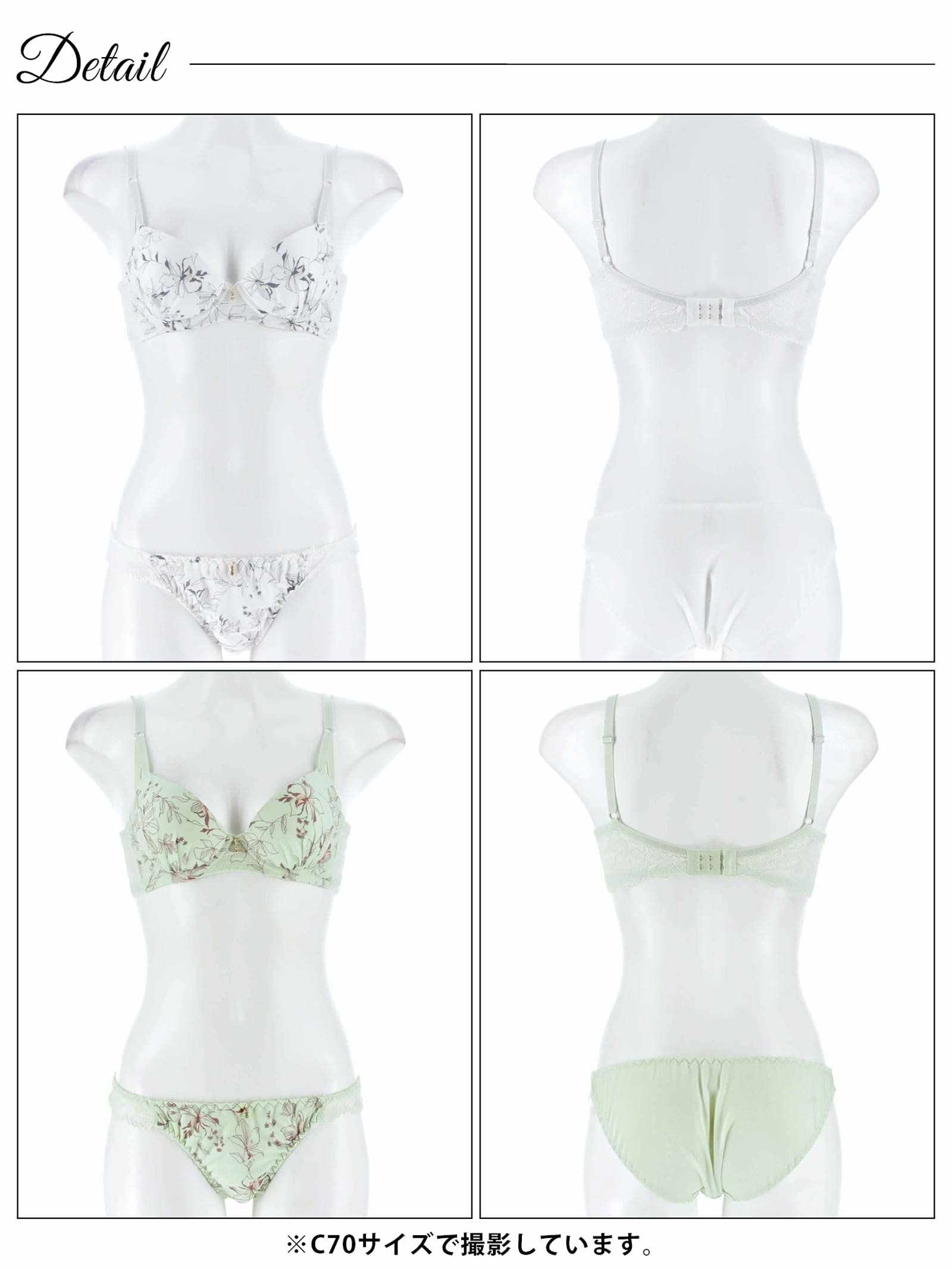 ナチュラルで大人かわいい雰囲気を感じさせるボタニカル柄のランジェリー。3連のラインストーンチャームがきらりと輝くアクセントに♪ブラのアンダーベルトやショーツサイドには繊細なシアーレースをあしらい素肌をさりげなく透け見せします◎モデル…上西怜