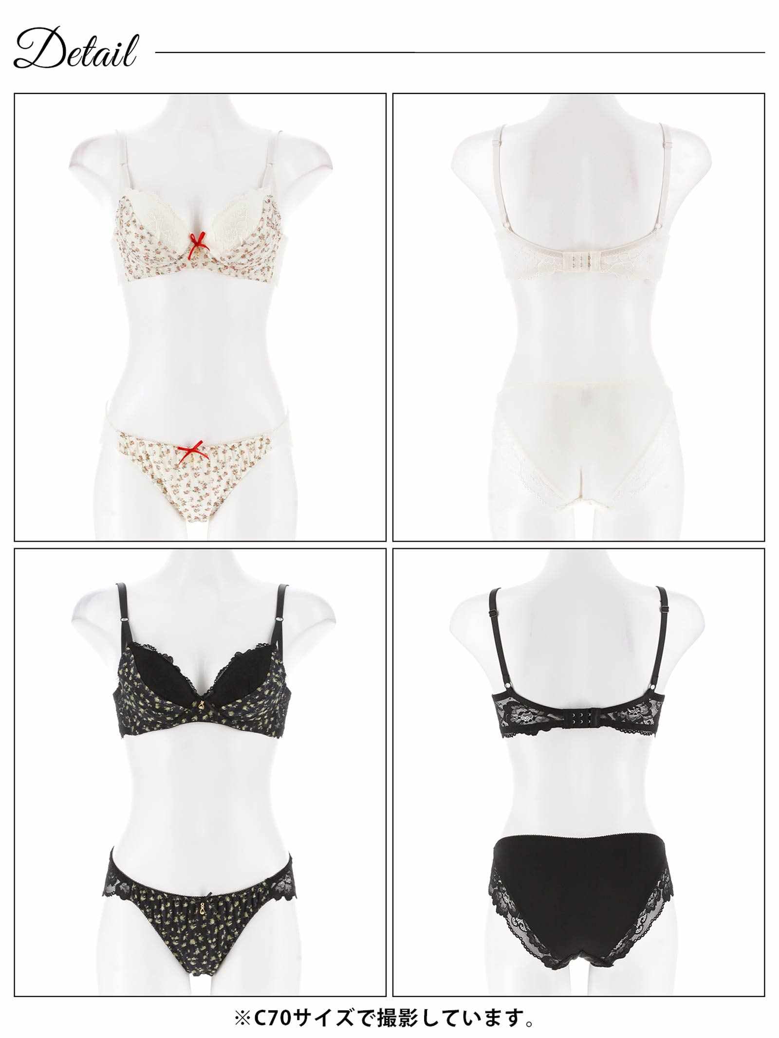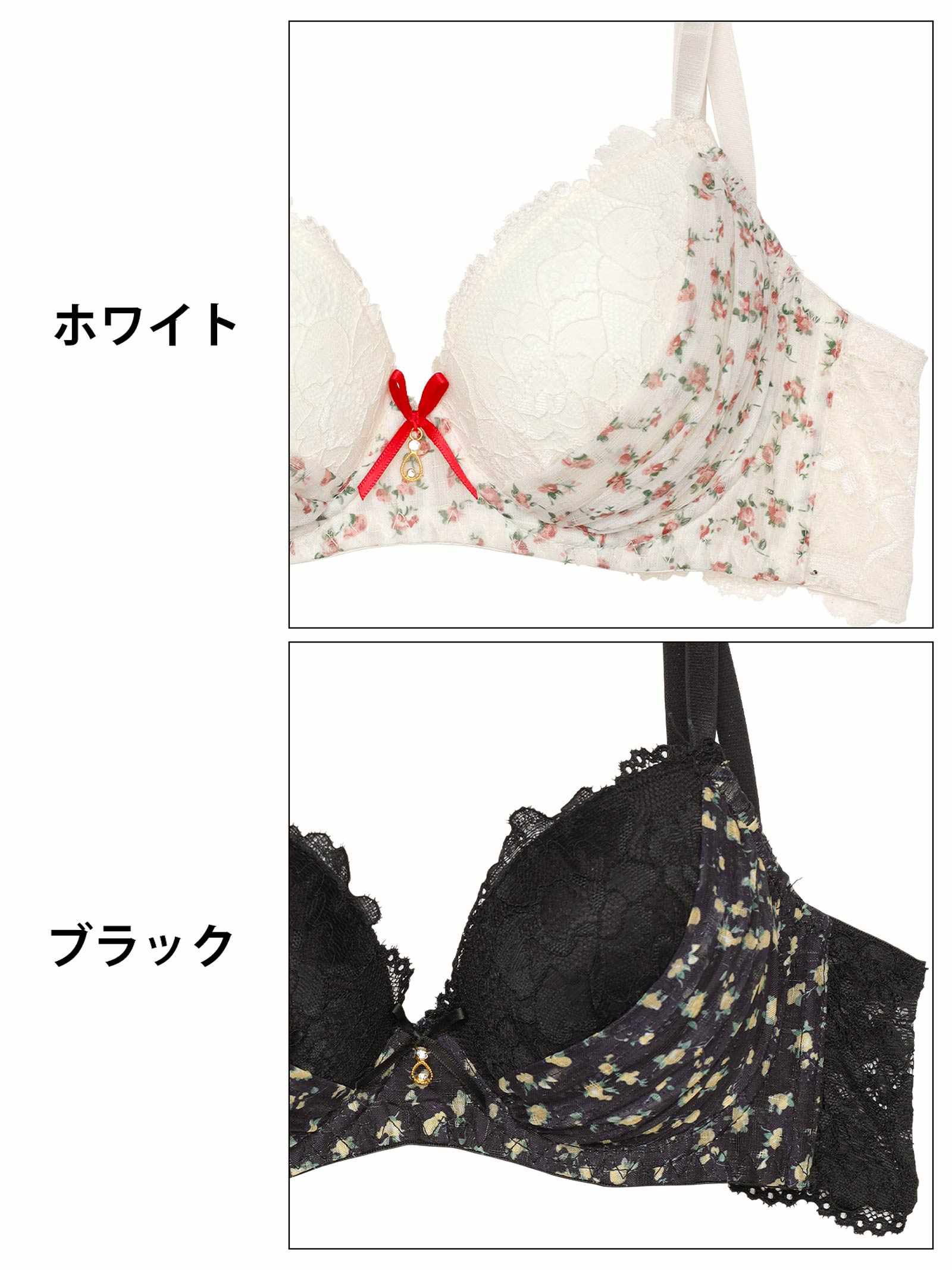 繊細なレースに可愛らしい小花柄のシフォンをあしらったフェミニンな魅力あふれるランジェリー。華奢なリボンと煌めくゴールドのチャームが上品さをプラスしてくれます♪三角ストラップ&脇高設計でサイドのお肉まで逃がさずキャッチし美胸をキープできる1着です◎モデル…Karin