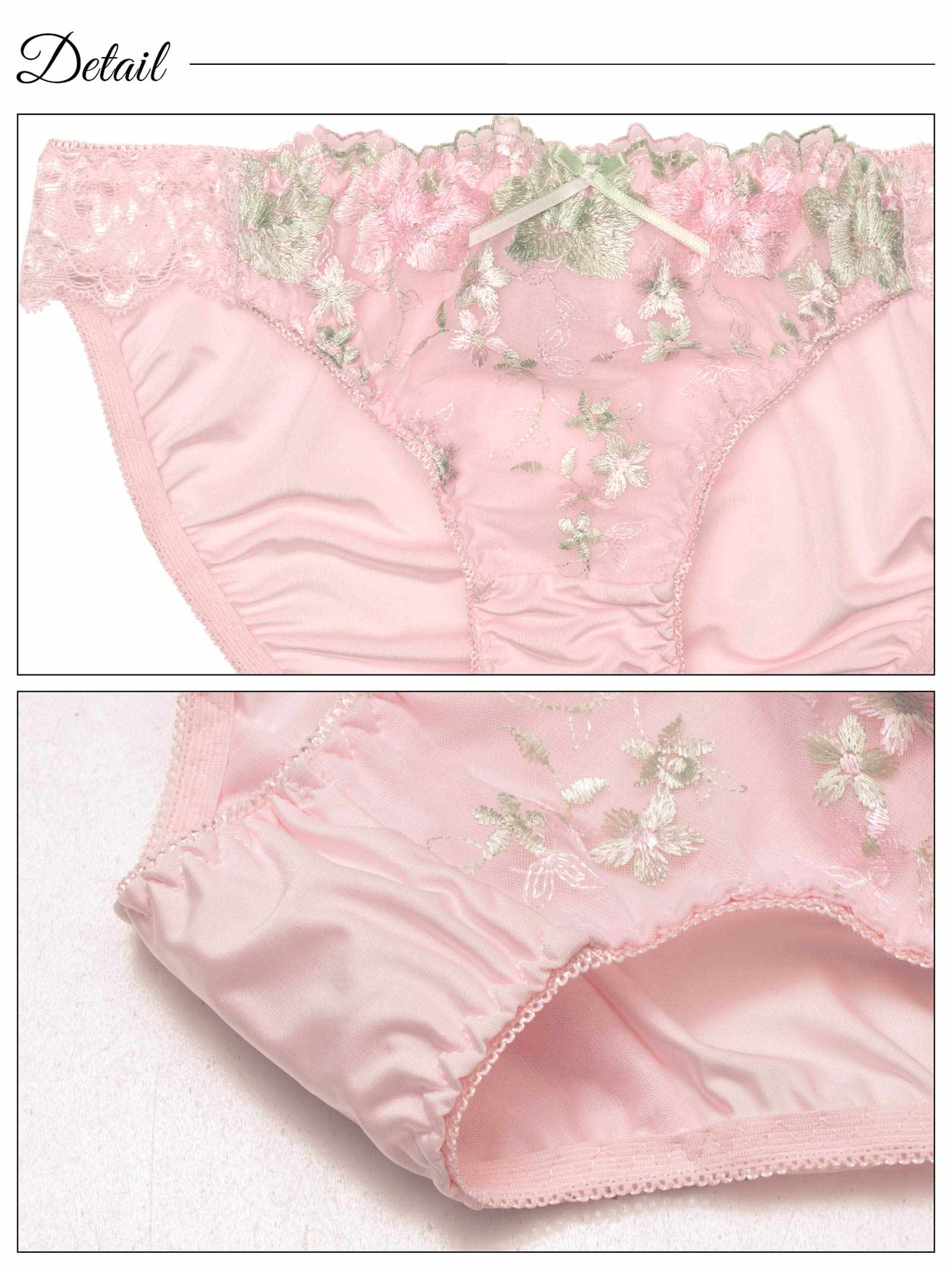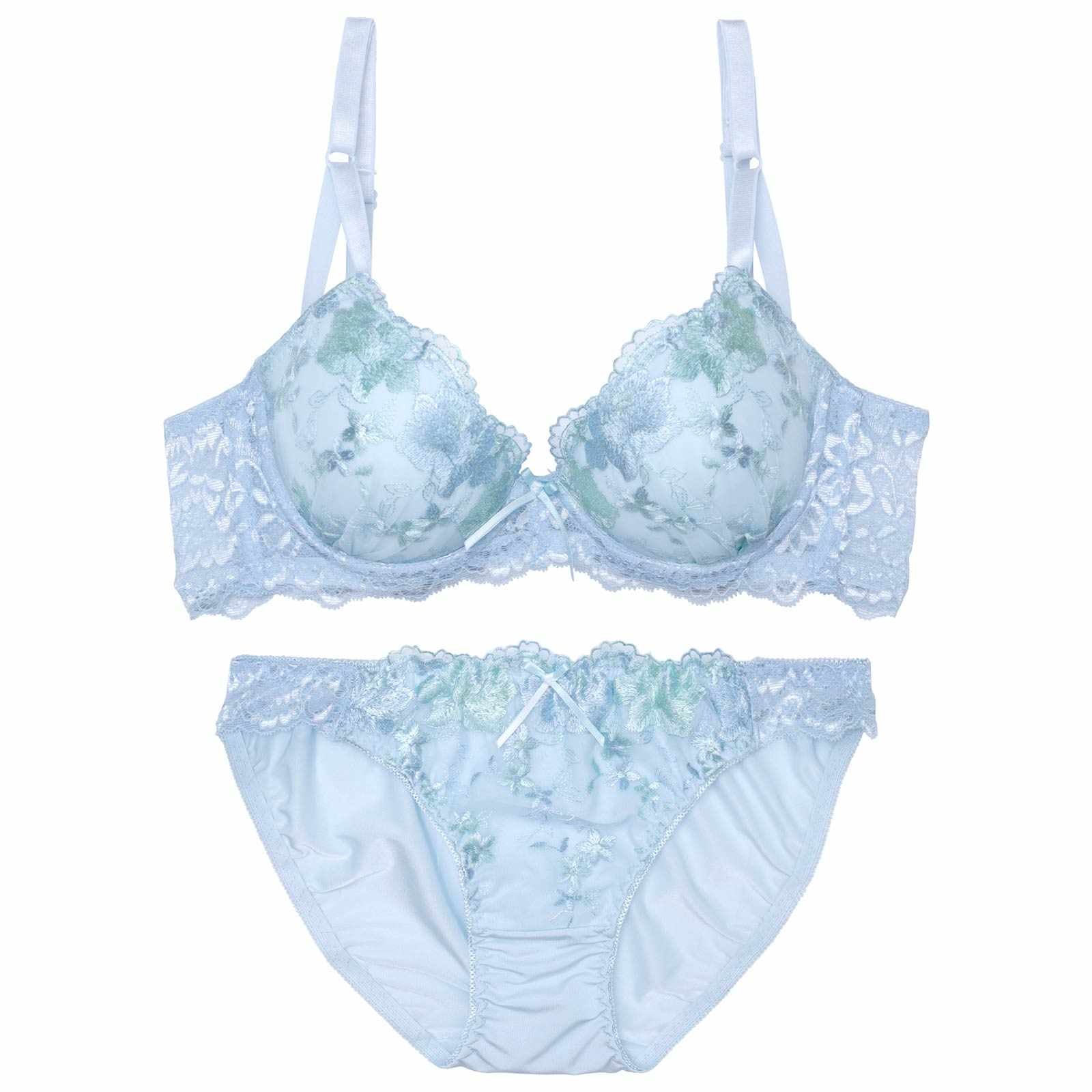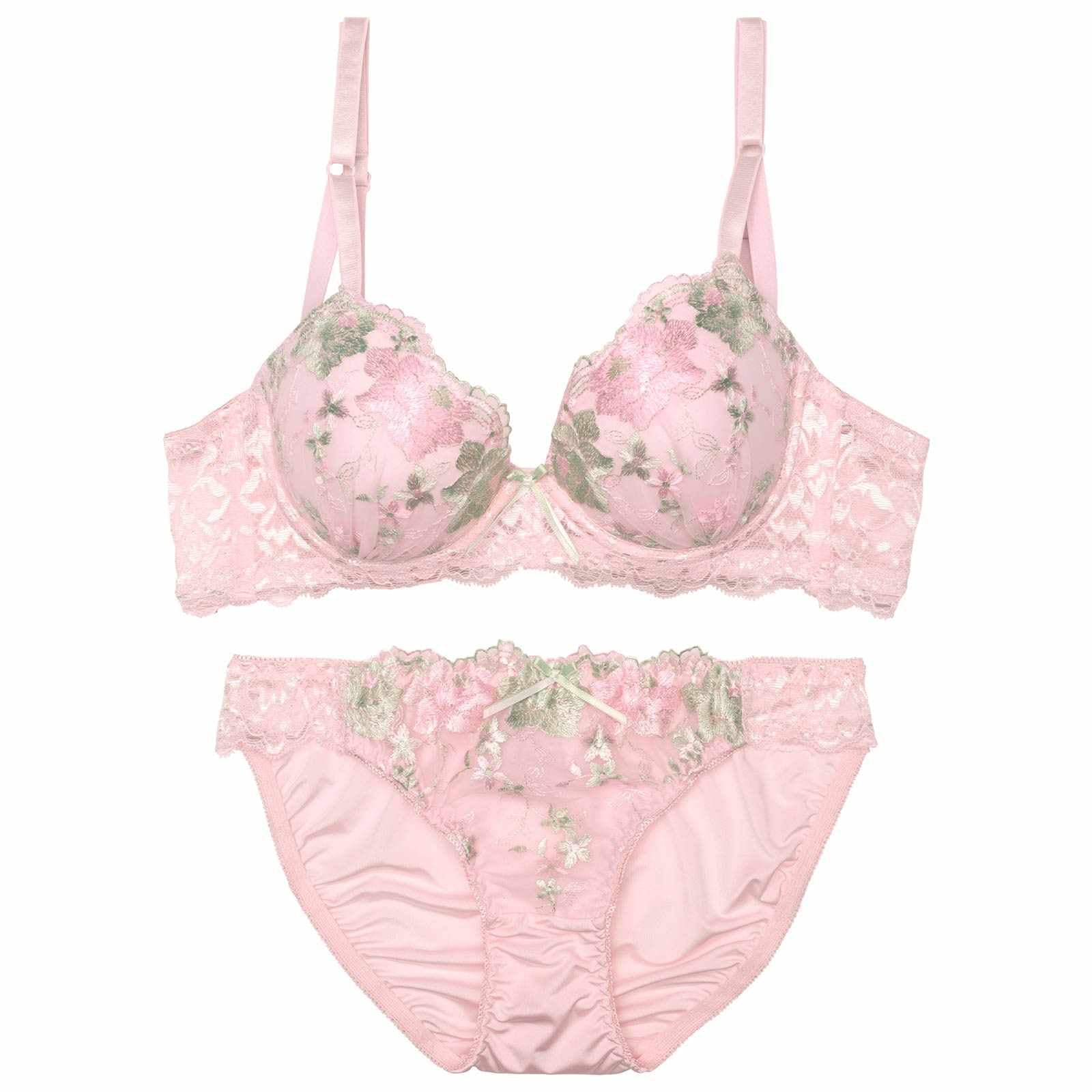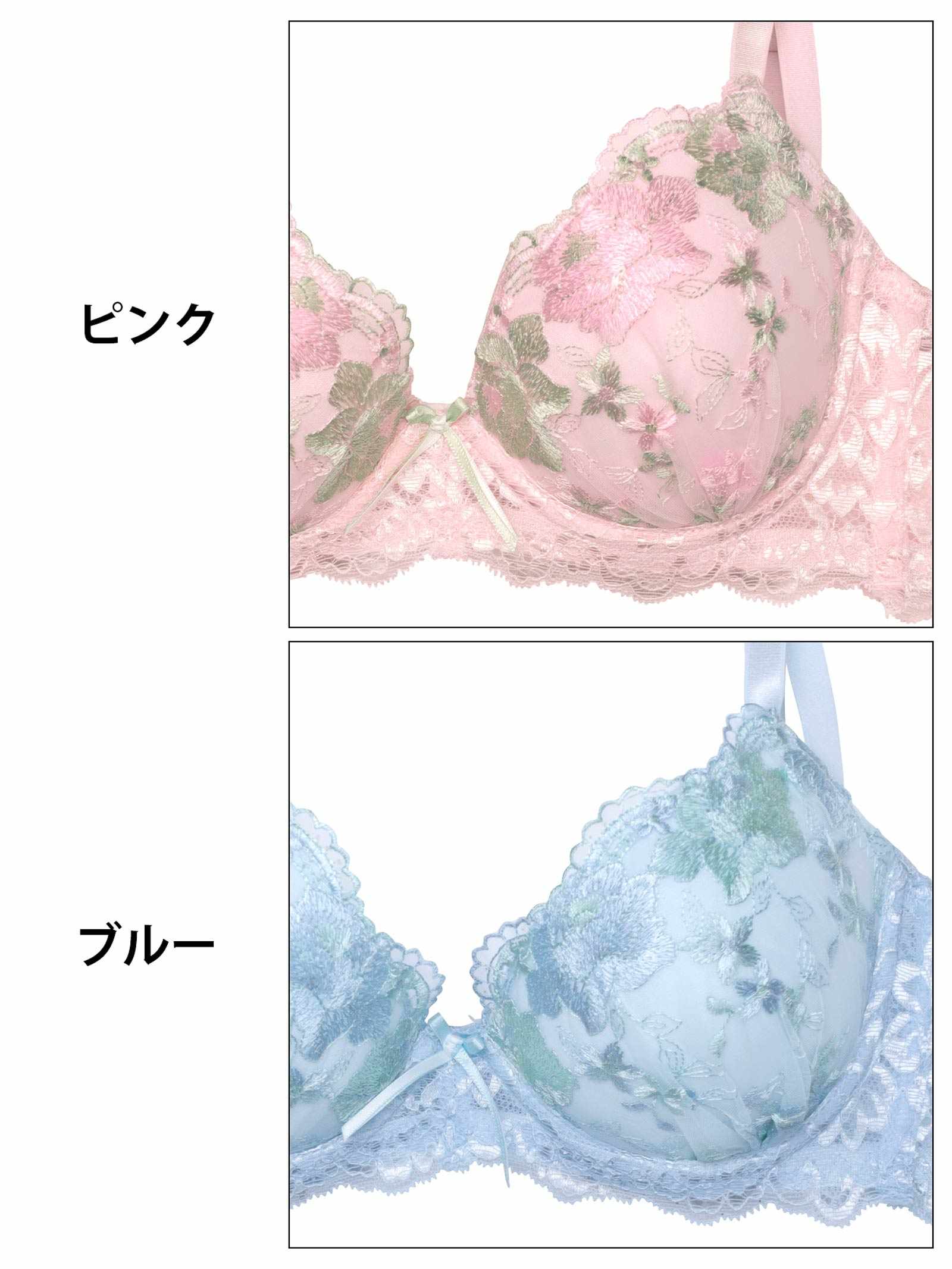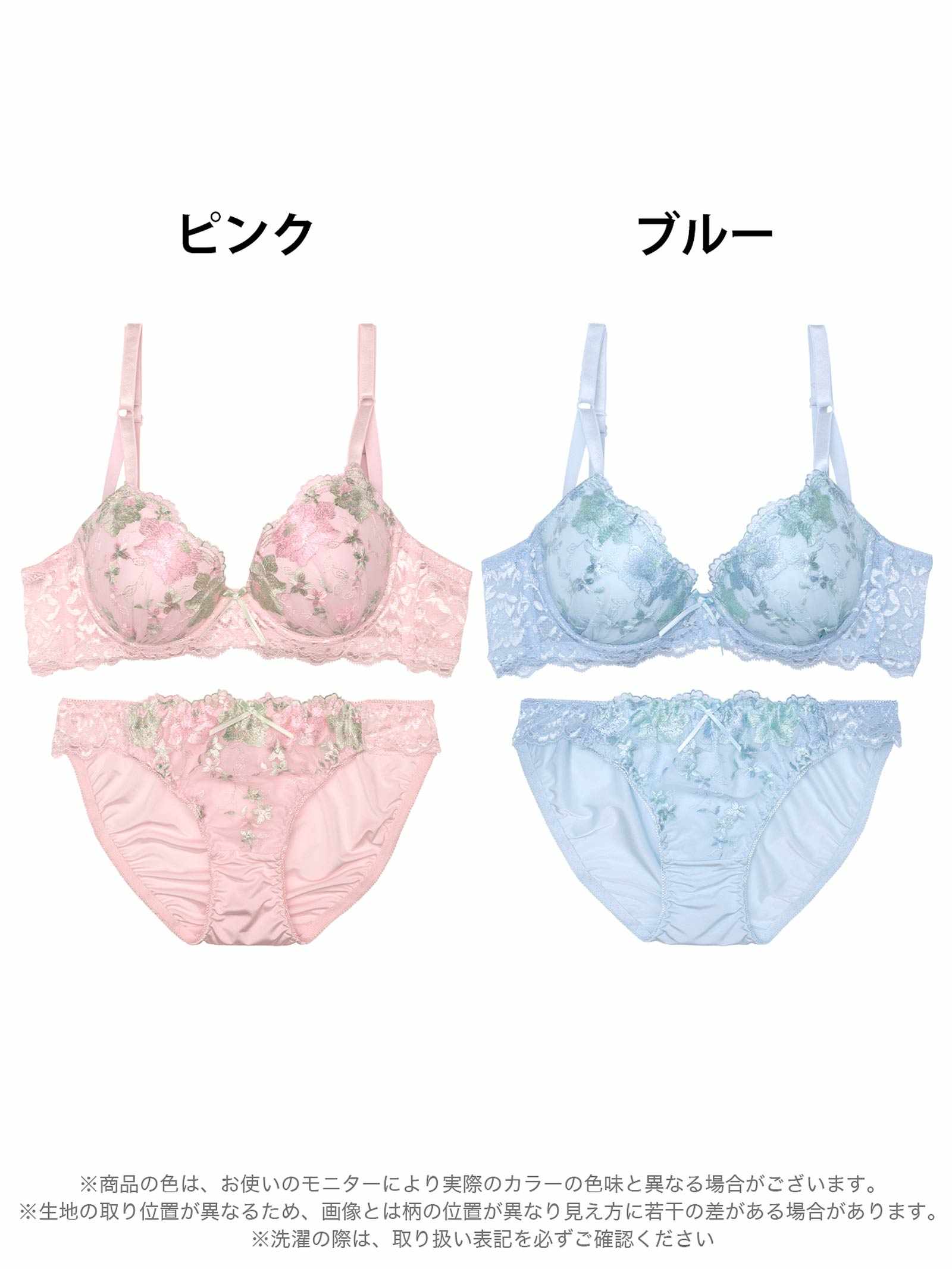 可憐に咲くお花の刺繍が施されたフェミニンなパステルカラーのランジェリー。脇高設計でバストの横流れを防ぎ、自然な谷間と美しいシルエットをキープ◎ブラのバックやショーツサイドは透け感のあるレースでほんのり色気をプラスしました♪