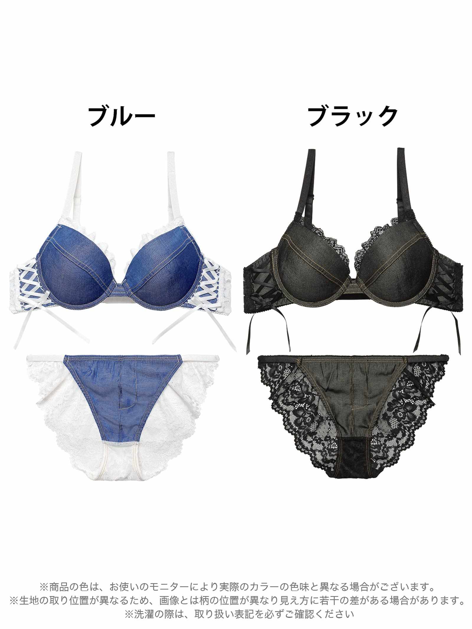 デニム風生地に上品なレースを合わせカジュアルすぎず女性らしいデザインに仕上げたランジェリー。カップサイドにあしらったサテンリボンのレースアップもポイント♪ショーツはサイドストリング×バック透けレースがセクシーなフルバック仕様です◎