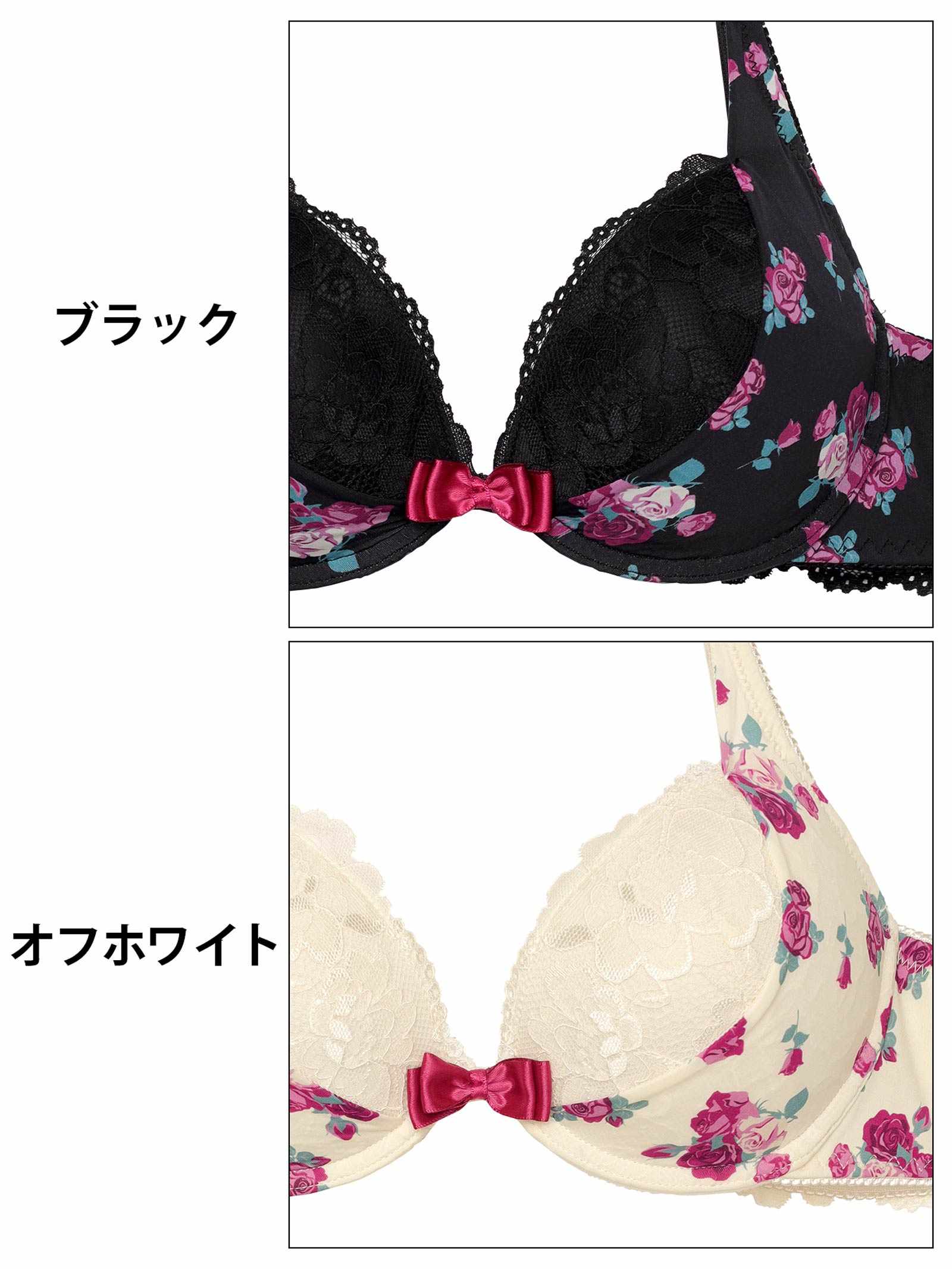クラシカルな薔薇の花々が咲き誇る大人可愛い雰囲気のランジェリー。ビビッドカラーのリボンが差し色になり、ほどよく甘さをプラスするアクセントに♪ショーツは腰元を華奢見せするストリング仕様。バックにもプリントが施され後ろ姿まで抜かりなく可愛い一着です◎