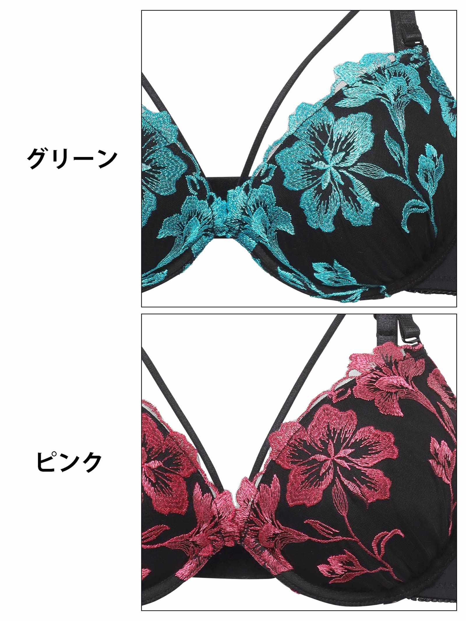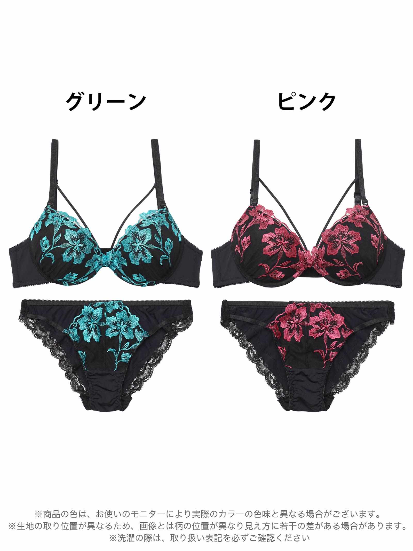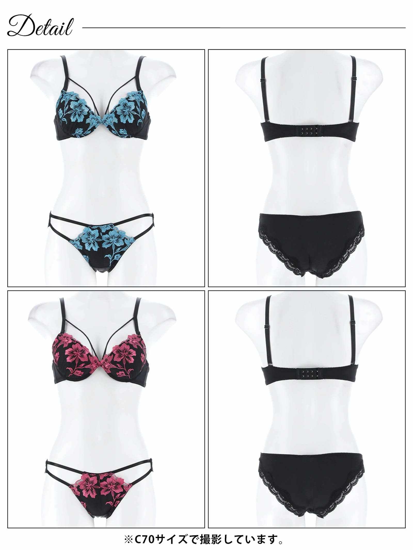 大人セクシーな黒生地に浮かび上がるビビットフラワーが美しいランジェリー。バストの丸みを綺麗に見せてくれるマカロニコードがセクシーな1着。ショーツの大胆なフロントカットの肌見せも色気抜群です。