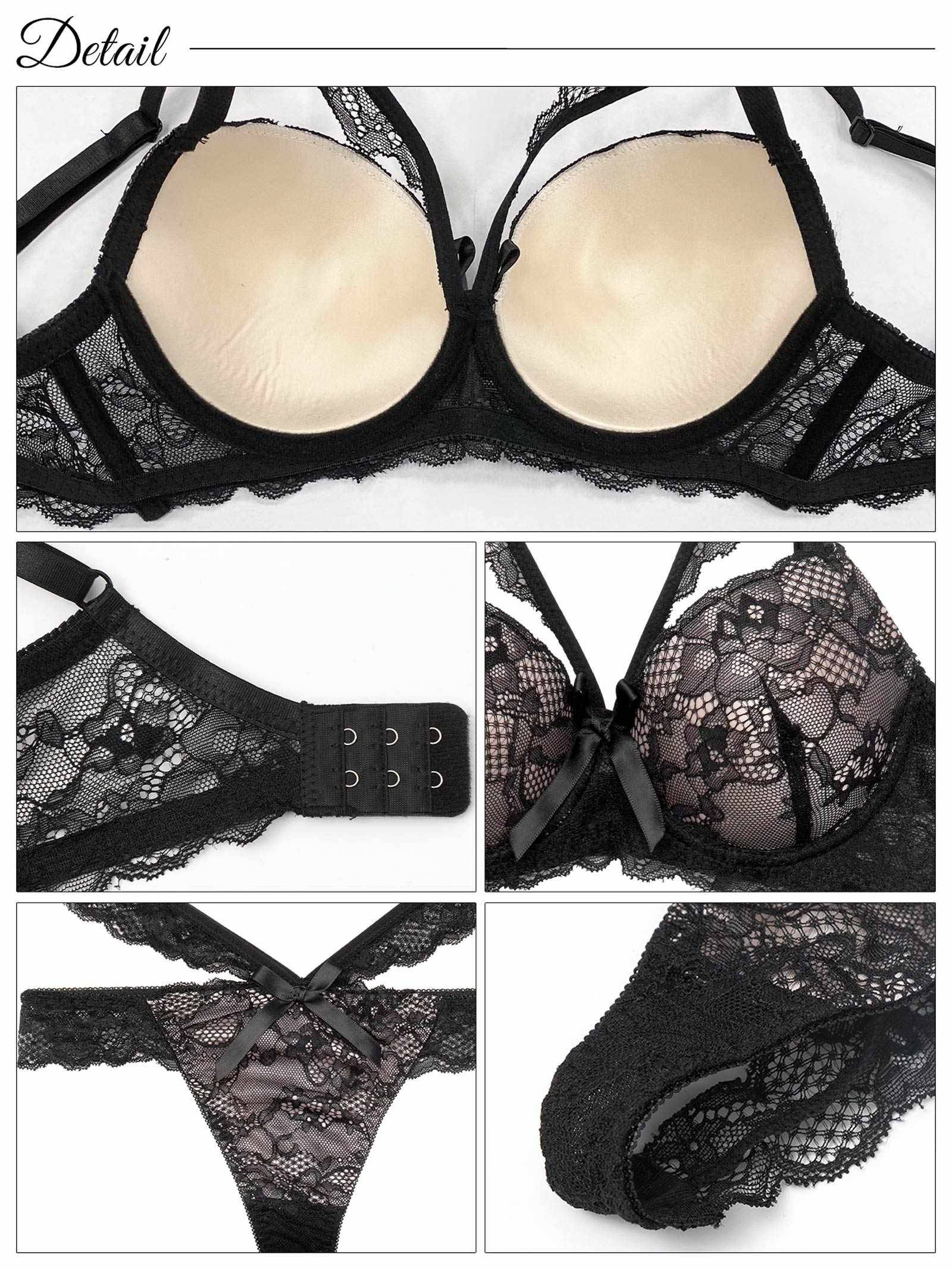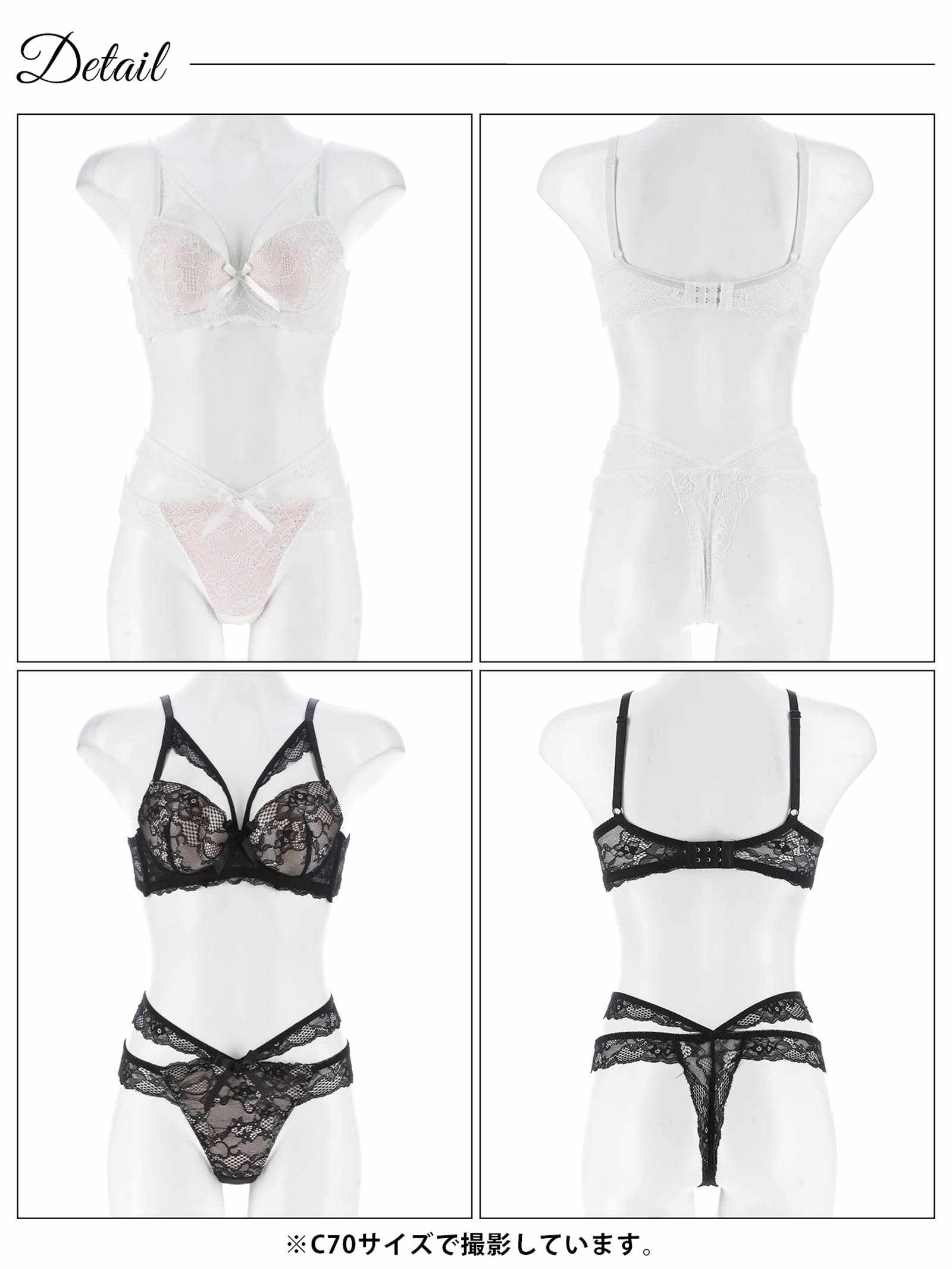 繊細なレースを添えたコードがバストを美しく強調するセクシーさ満載のランジェリー。中央には大きめのリボンをあしらい色っぽさの中にほどよく甘さをプラスしました♪ショーツは後ろ姿まで抜かりないバックレース仕様でお洋服にひびきにくいのもポイントです。モデル…まぁみ