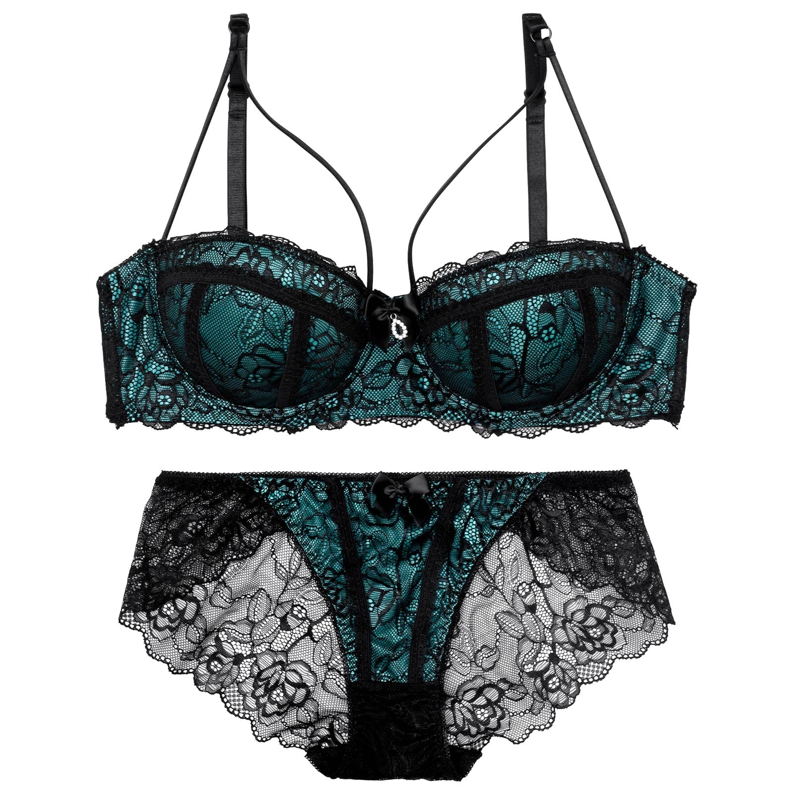 透け感のある繊細なブラックレースやバストを強調するコードデザインがセクシーさ満載のランジェリー。しっかり盛れるダブルパッド×ハーフカップ仕様で、美しいデコルテラインを演出♪総レースのショーツはお洋服にひびきにくいだけでなく履き心地も快適です◎