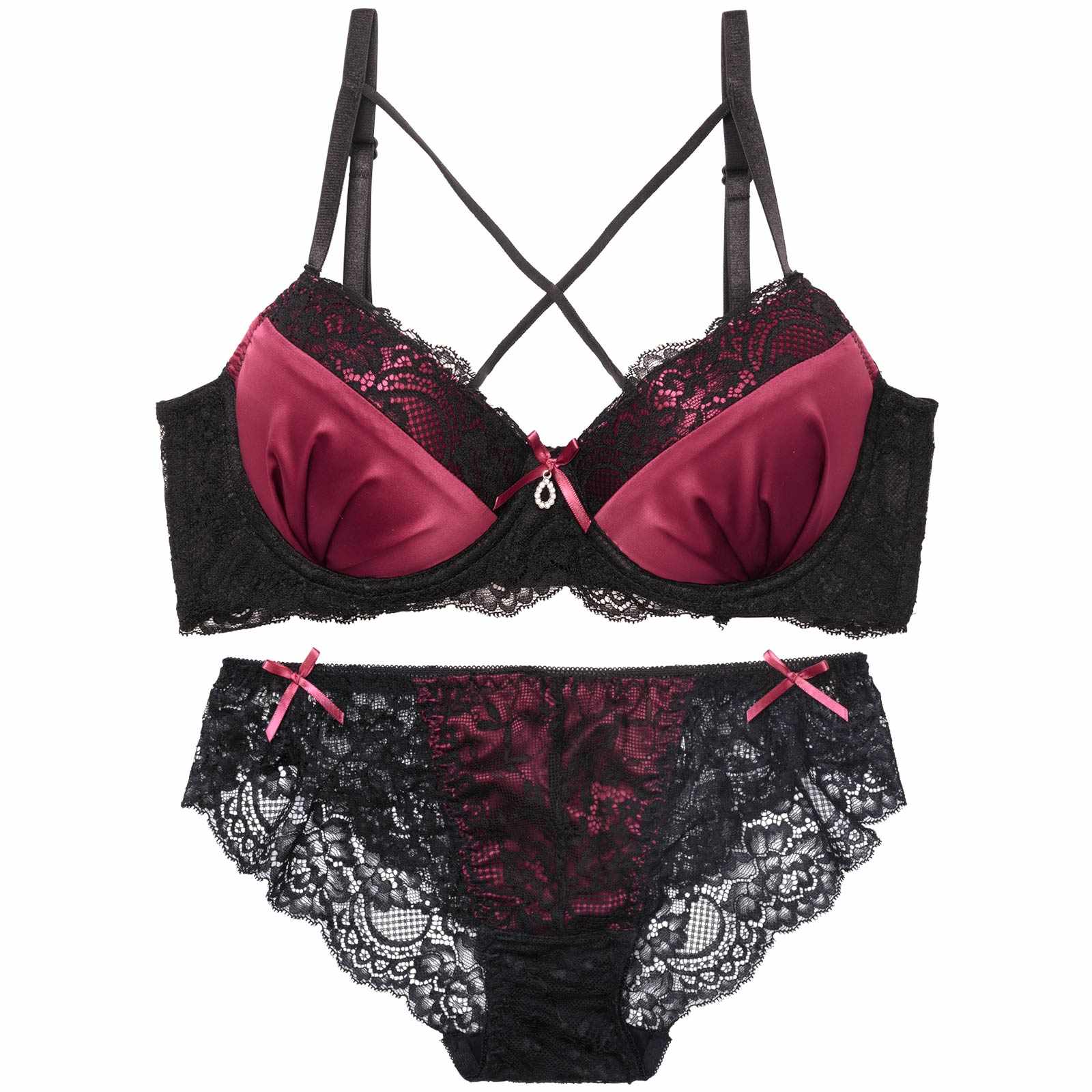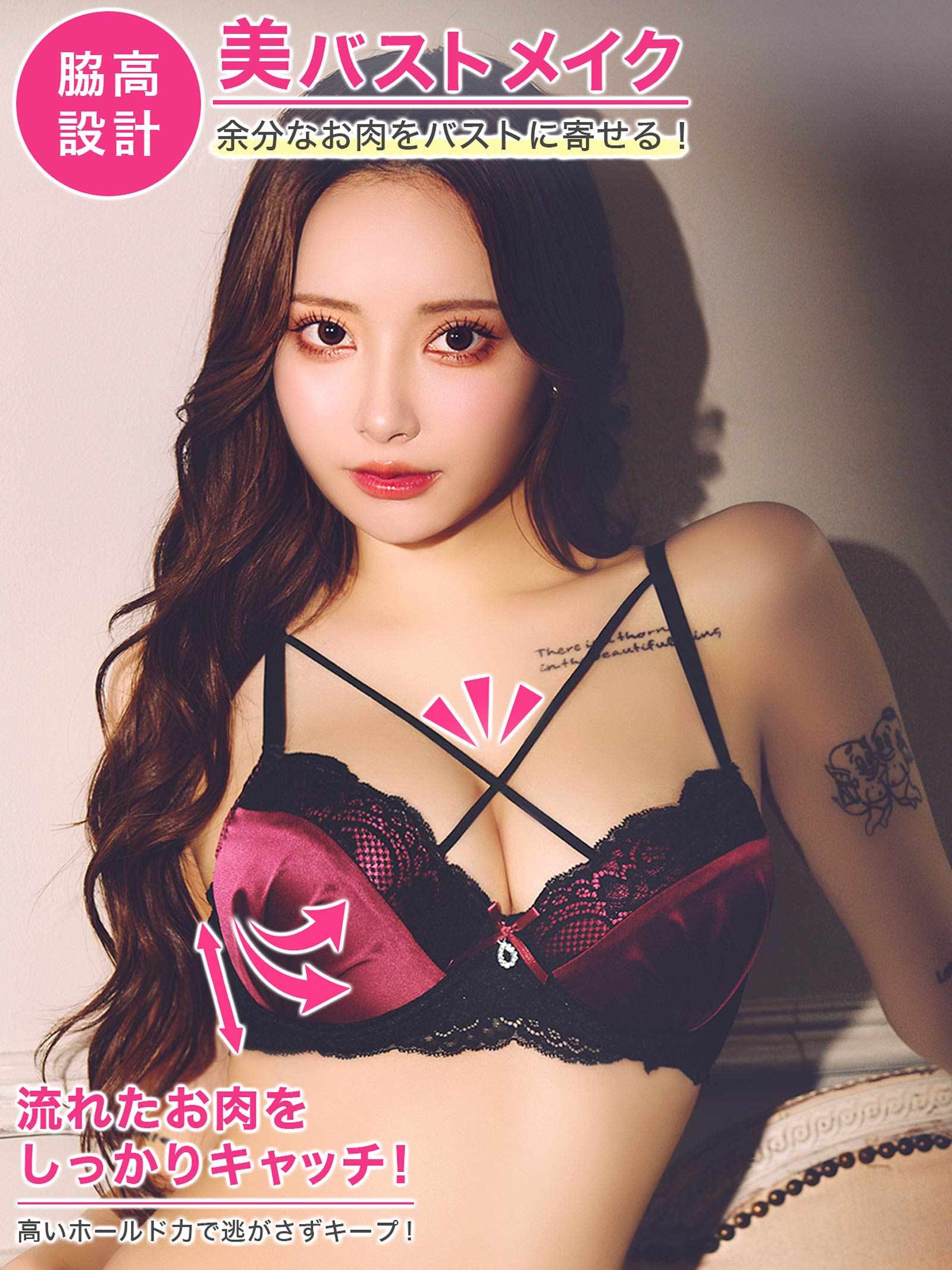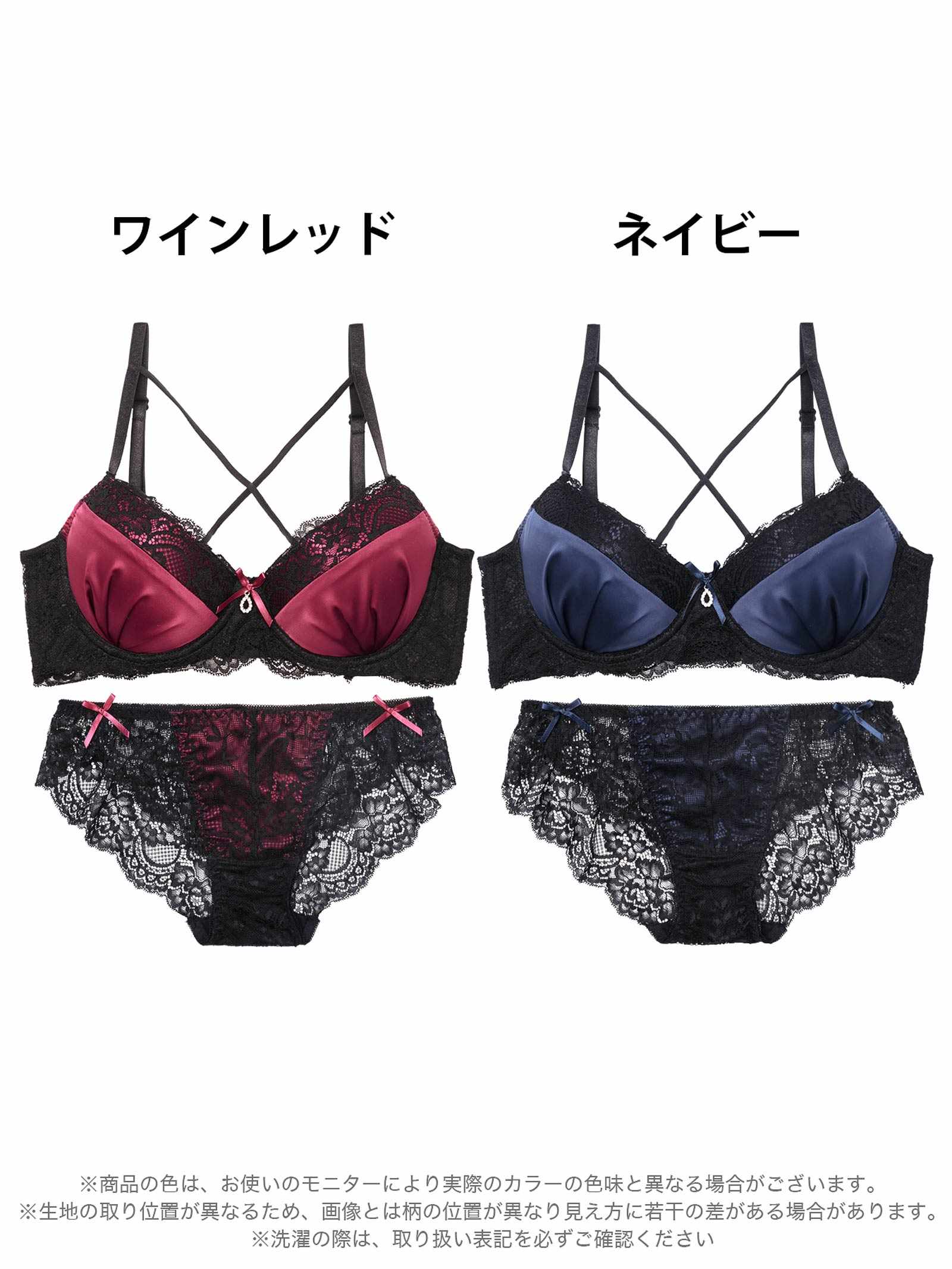 艶やかなディープサテン生地に大人セクシーなブラックレースを重ねたランジェリー。デコルテを華やかに演出する華奢なクロスラインは谷間へ自然と視線を集めてくれる1着。後ろ姿からもこだわり溢れるバック透けも魅力的です。