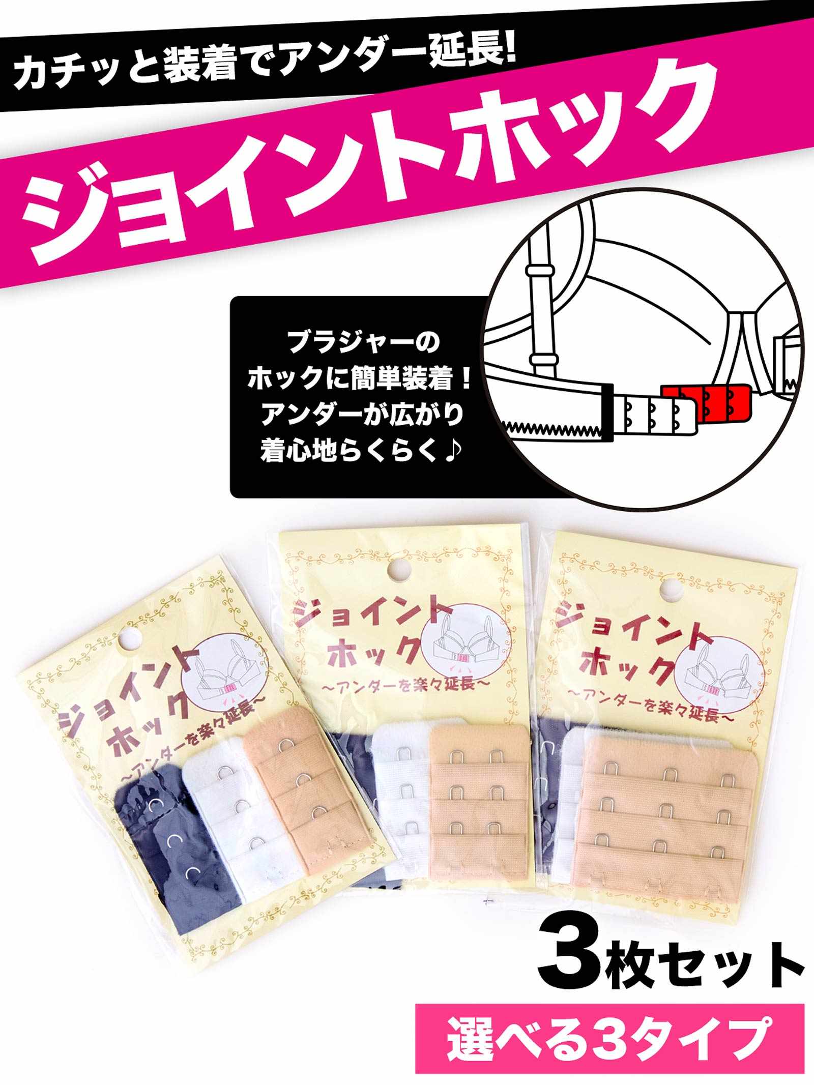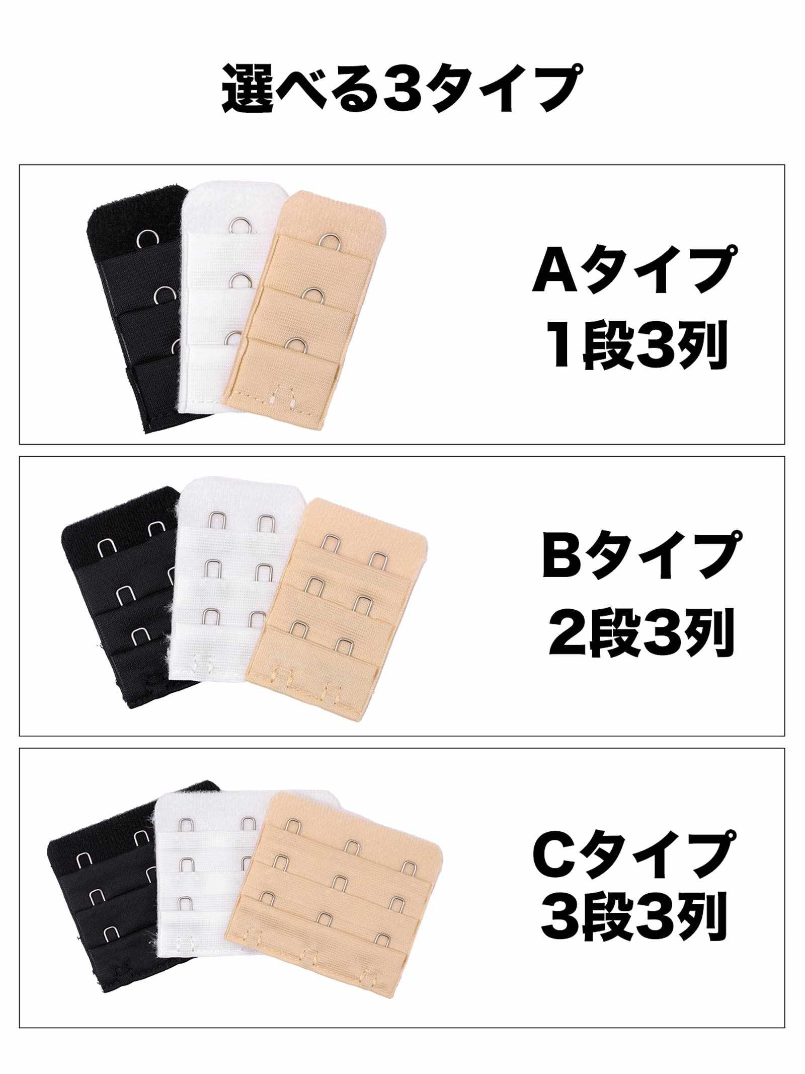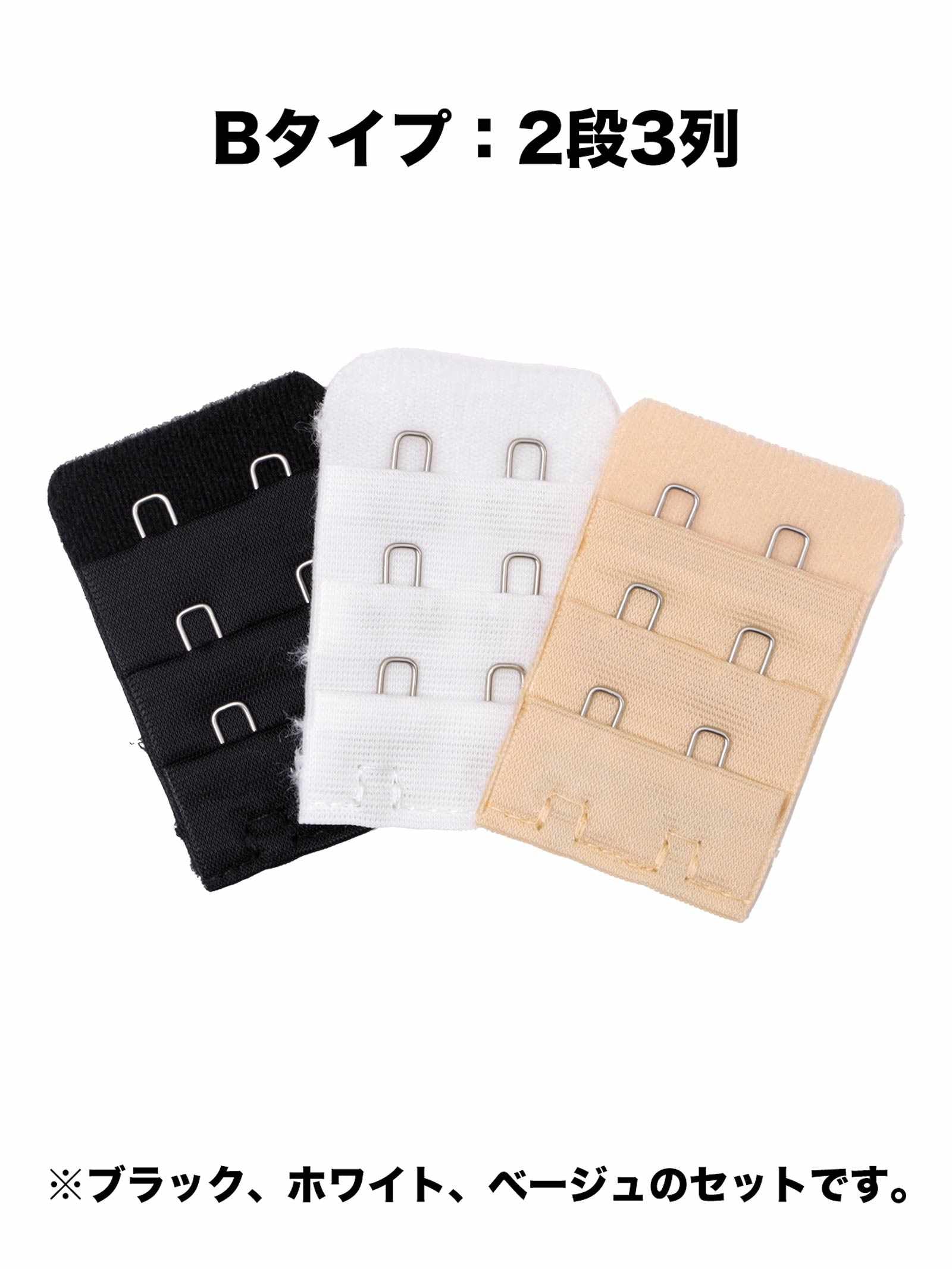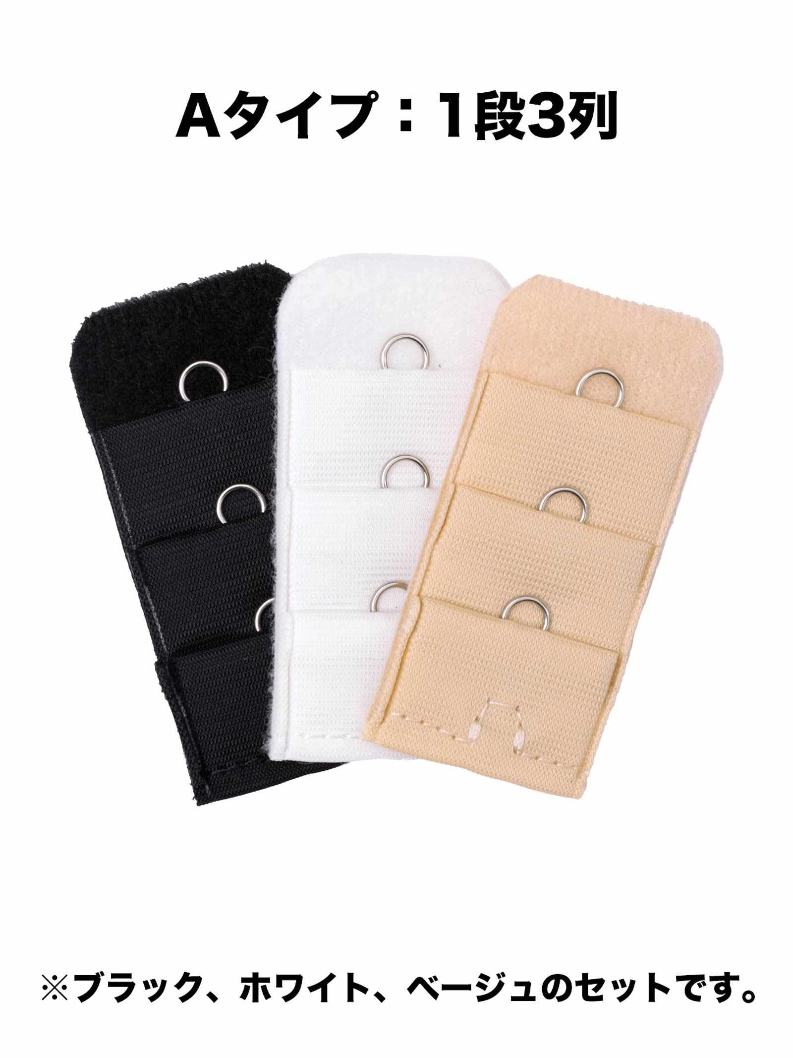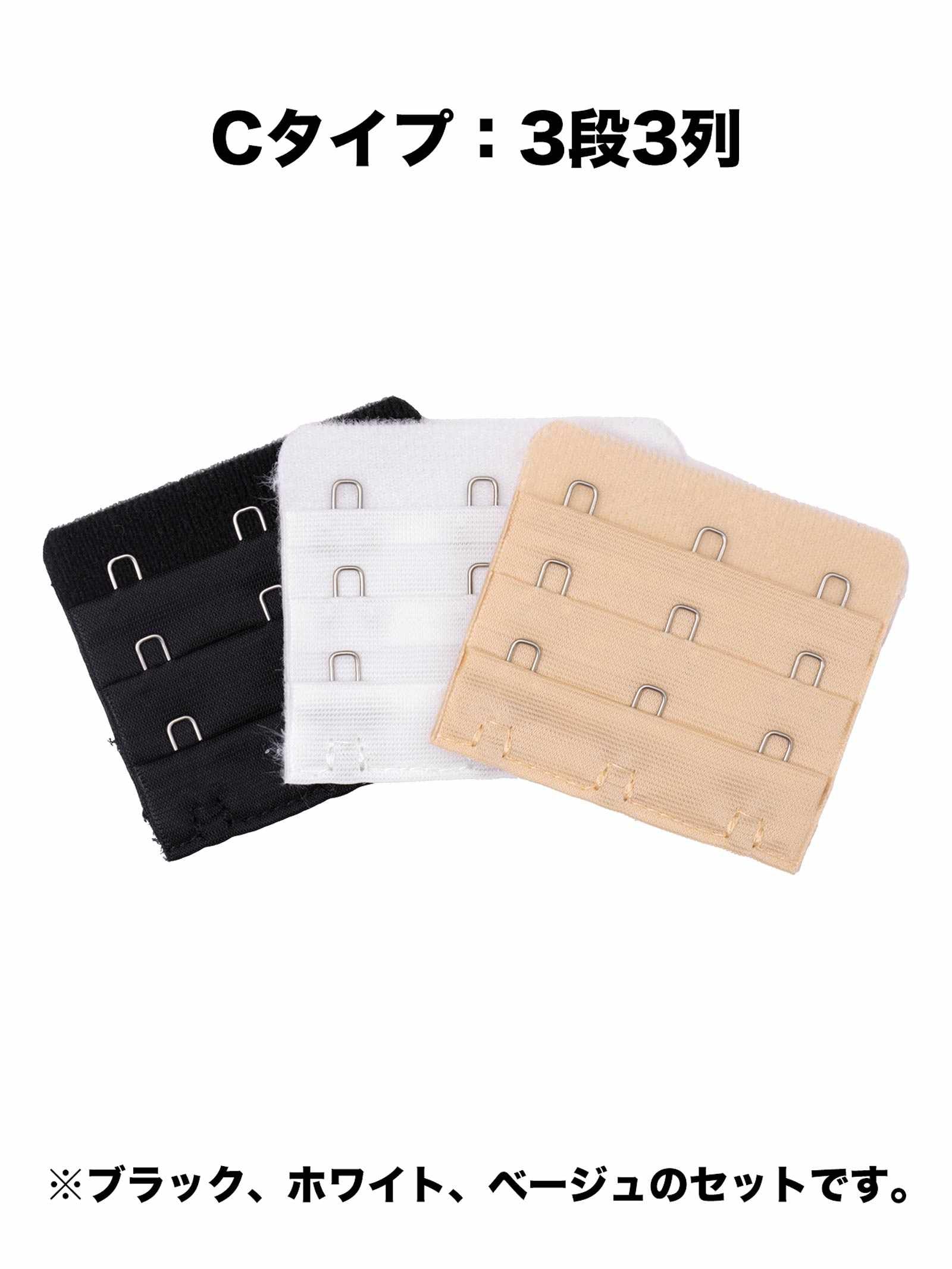 一つでも当てはまったら『継ぎ足しホック』がオススメ!お手持ちのブラジャーに取り付けるだけで、簡単にアンダーのサイズ調整ができる便利なアイテム◎サイズは1段3列、2段3列、3段3列の3タイプ。「黒」「白」「ベージュ」とあわせやすいカラーをご用意しました♪