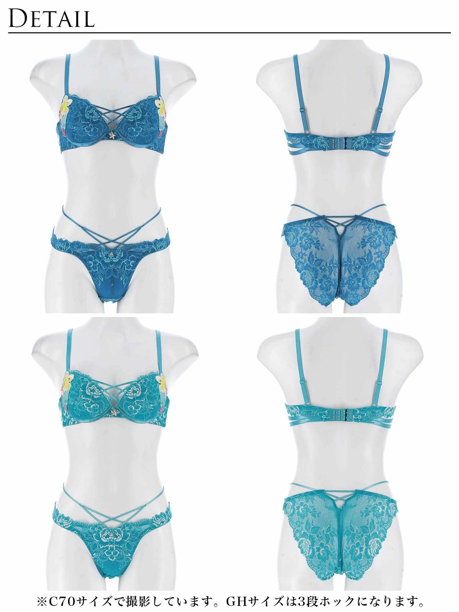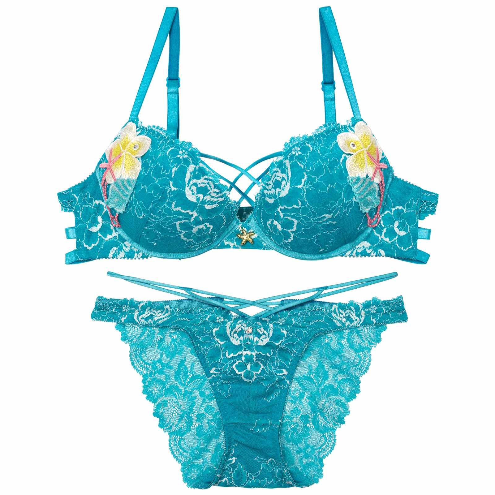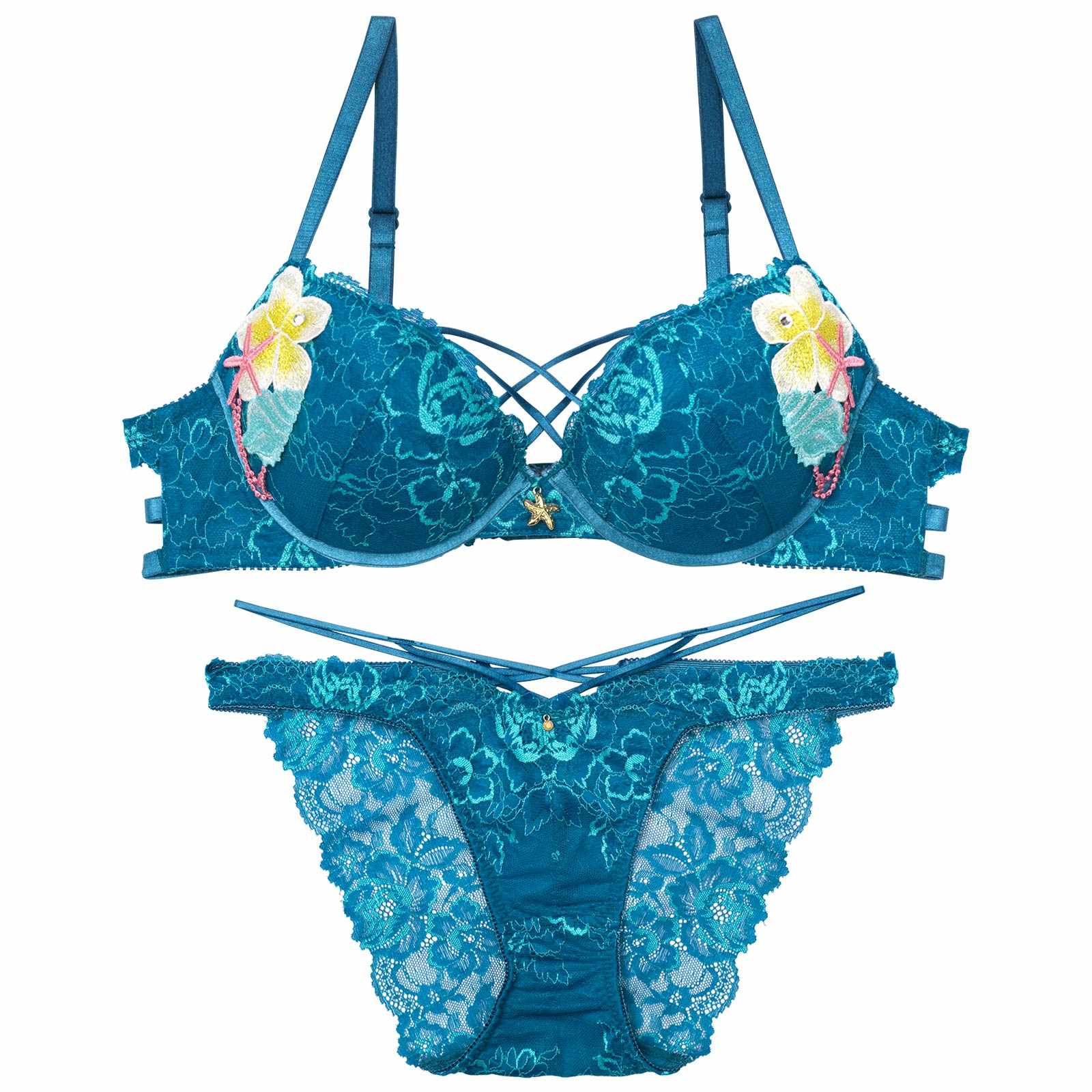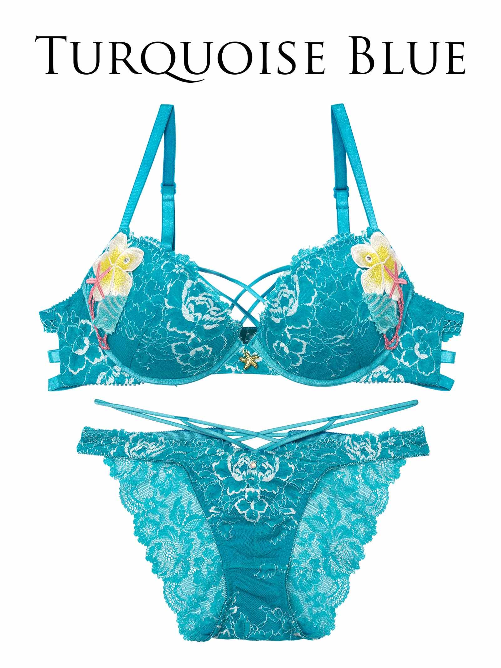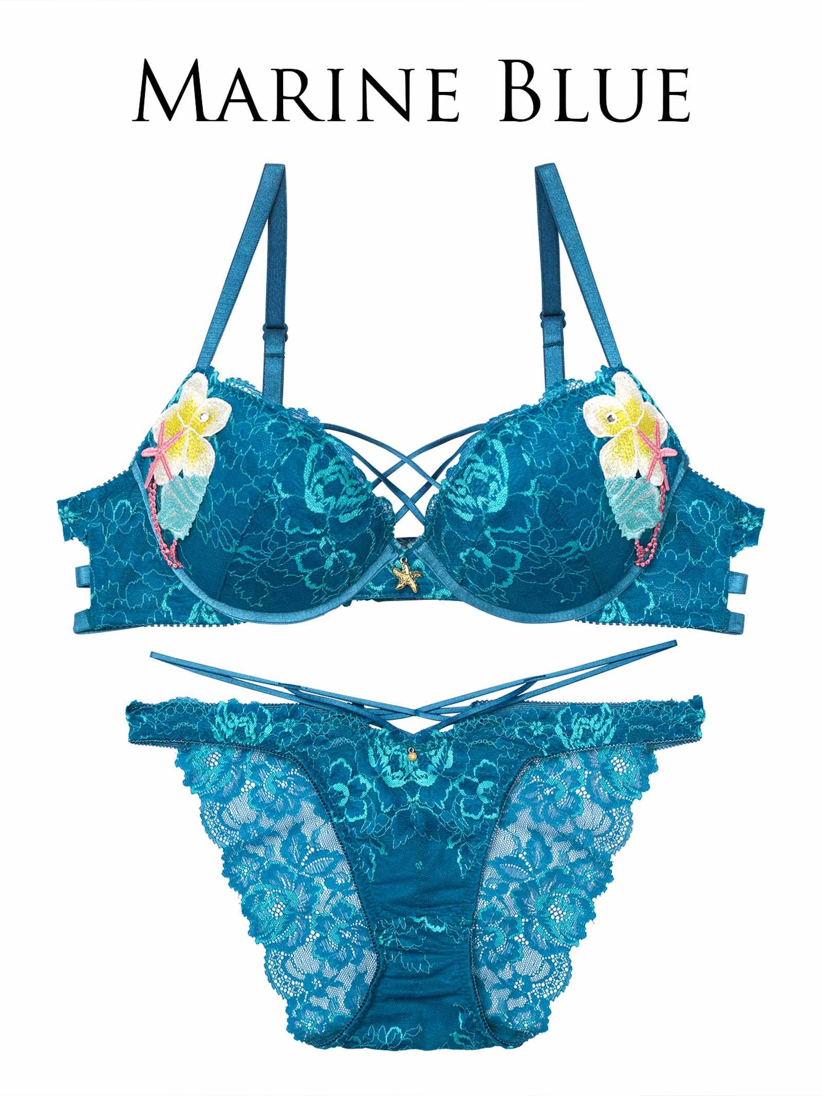 海を連想させるような美しいブルーに貝殻やプルメリアの刺繍をあしらった夏らしいランジェリー。谷間中央には人気のレースアップとシルバーのヒトデチャームがワンポイント◎ 繊細なストリングとレース生地を360度あしらった色気溢れる1着です。