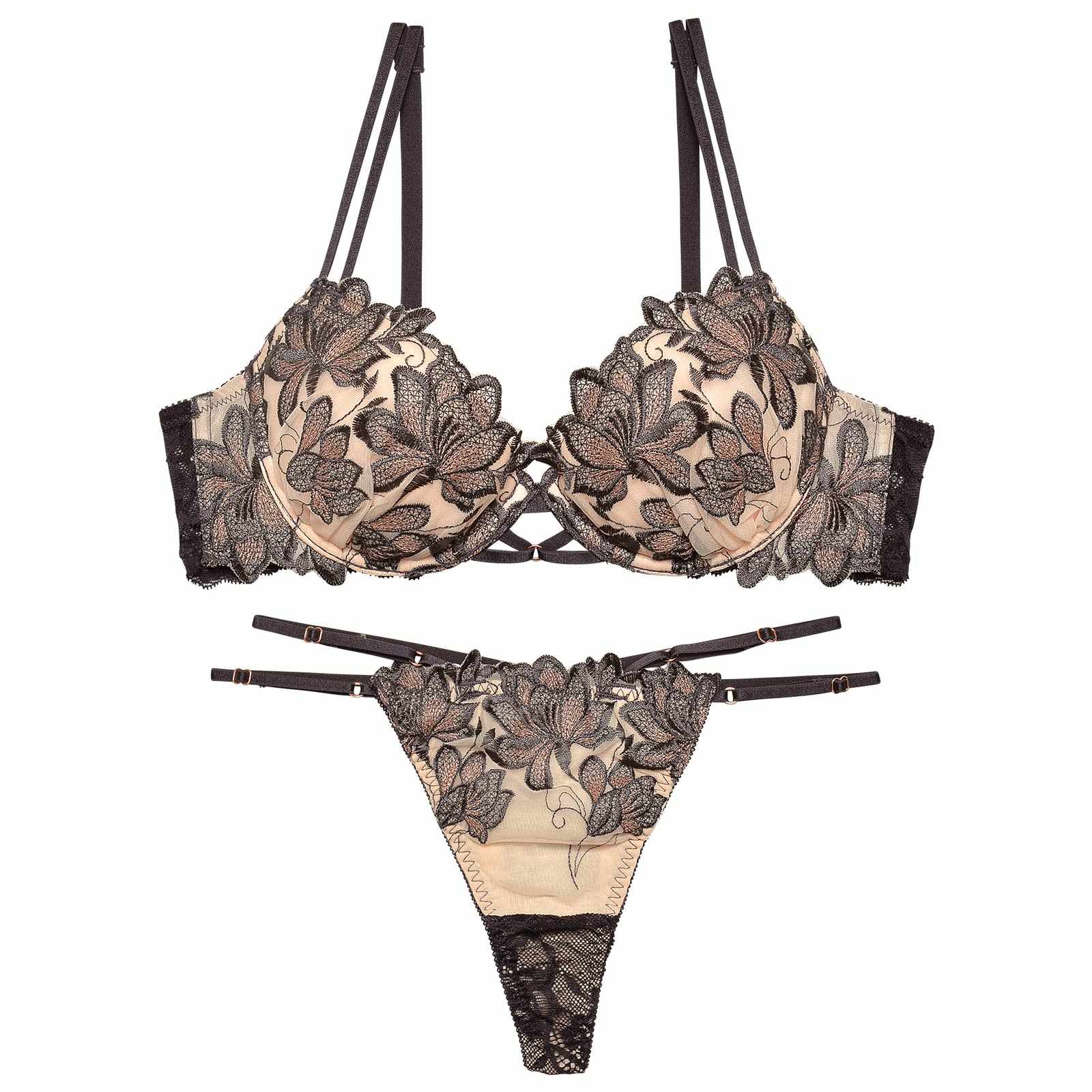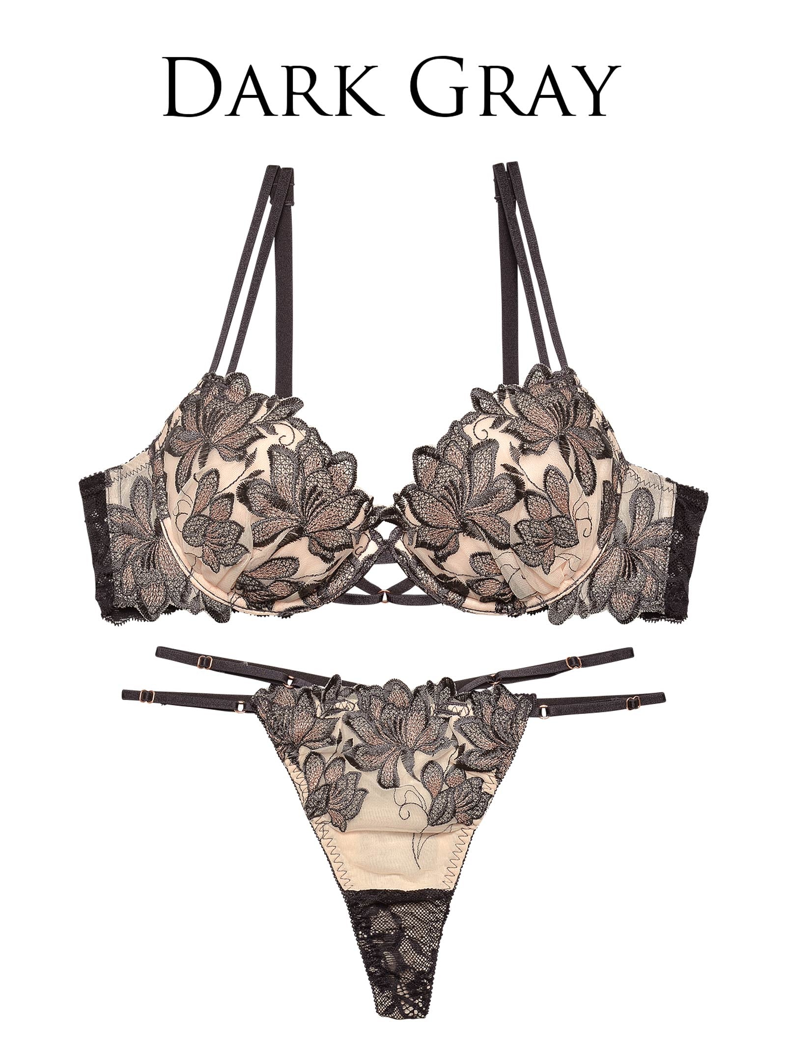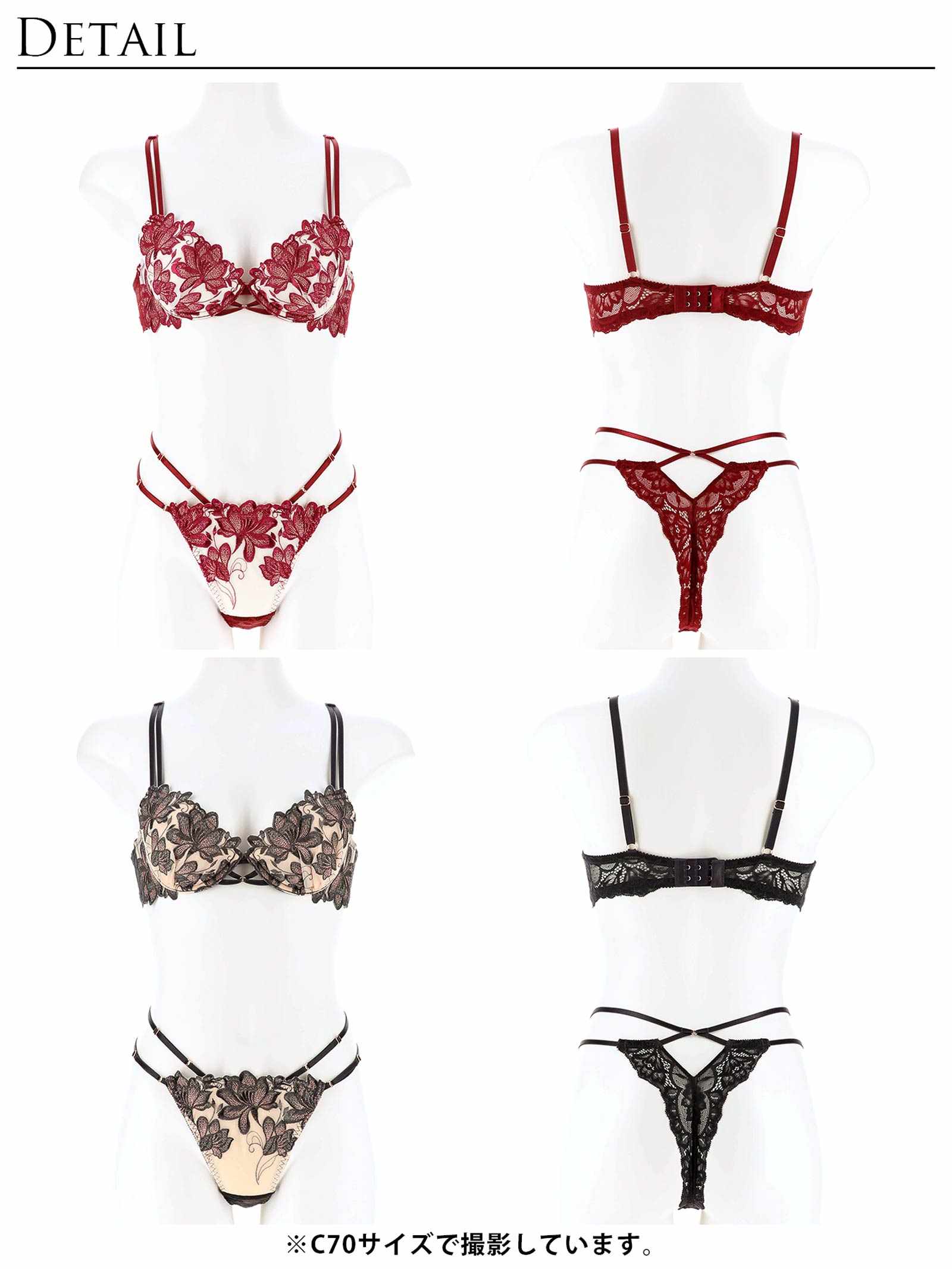 深みのあるダークカラーのフラワー刺繍が美しいランジェリー。腰回りを華奢魅せするショーツのストリング部分はアジャスター付きでサイズ感や、Wラインの間隔が調整可能です◎ レースの程良い肌透けも色気漂う1着です。