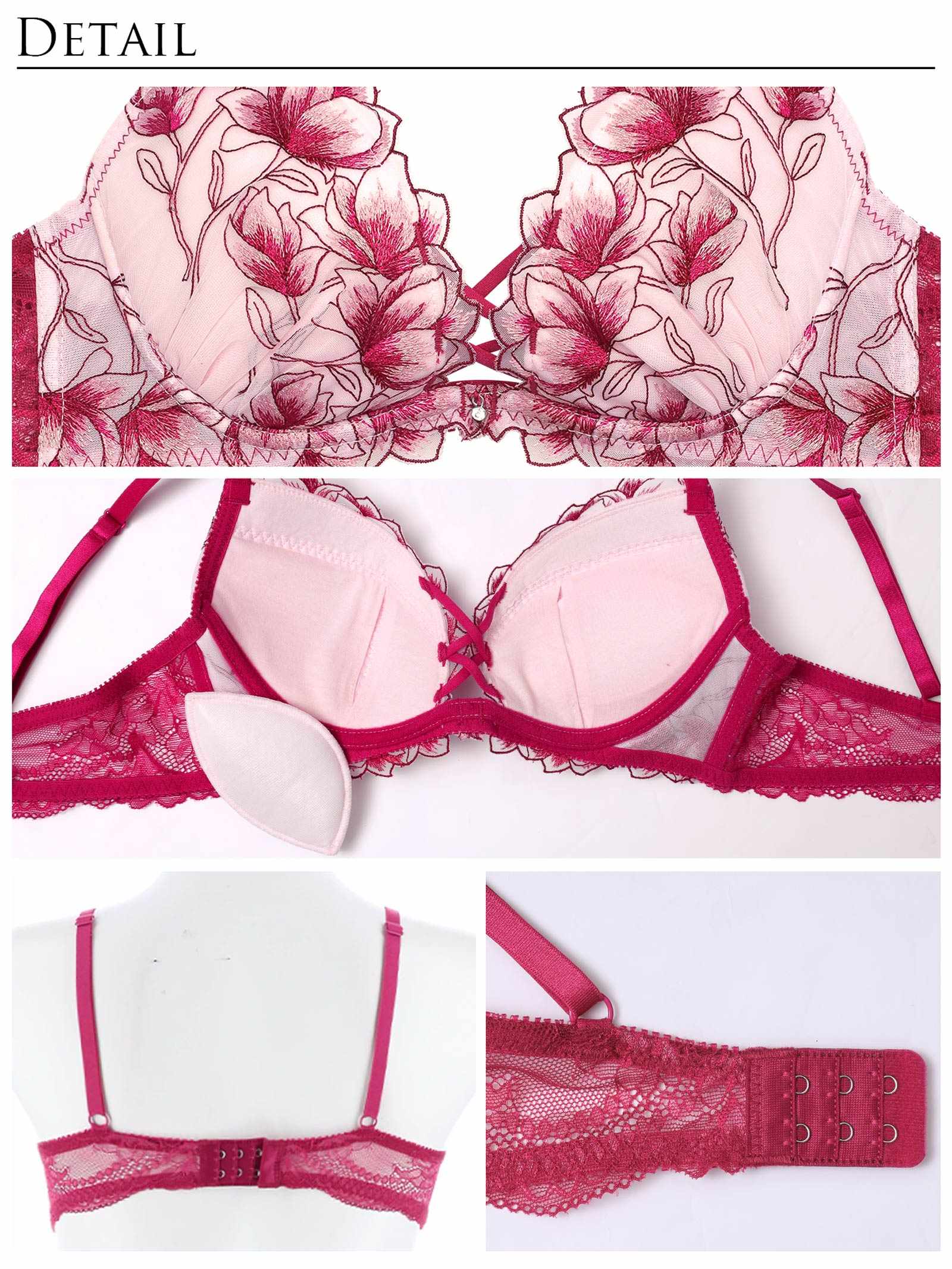 明るい色使いで描かれた大輪の花々が胸元を飾るラグジュアリーなランジェリー。谷間にかかるクロスデザインやきらりと光るシルバーチャームがアクセントに。ショーツフロントはストリングとレースの間から素肌を見せるセクシーな仕様で大人な色気を演出します。